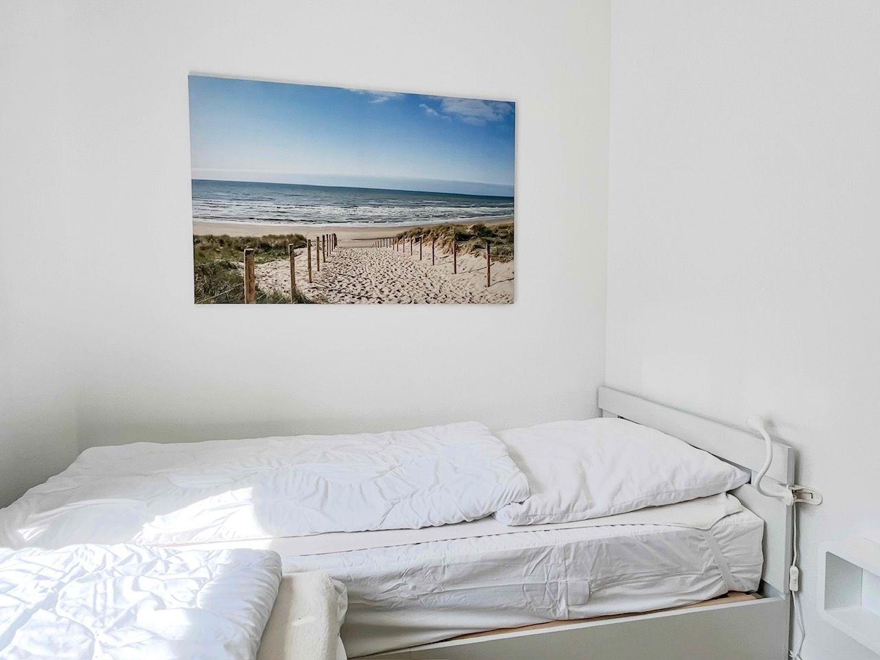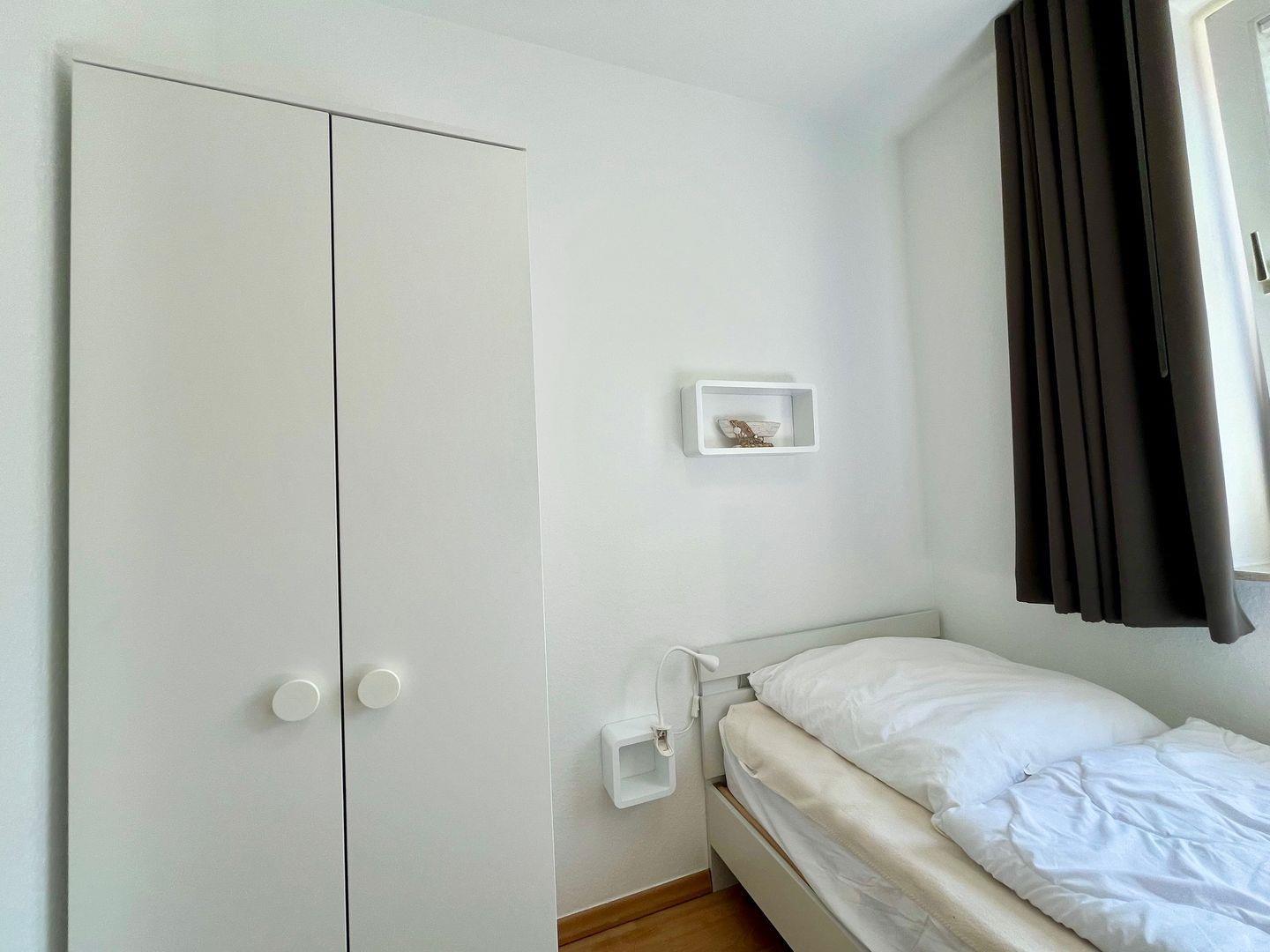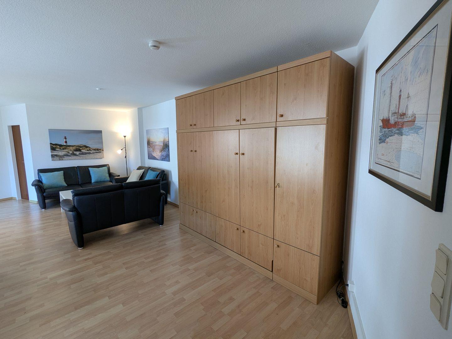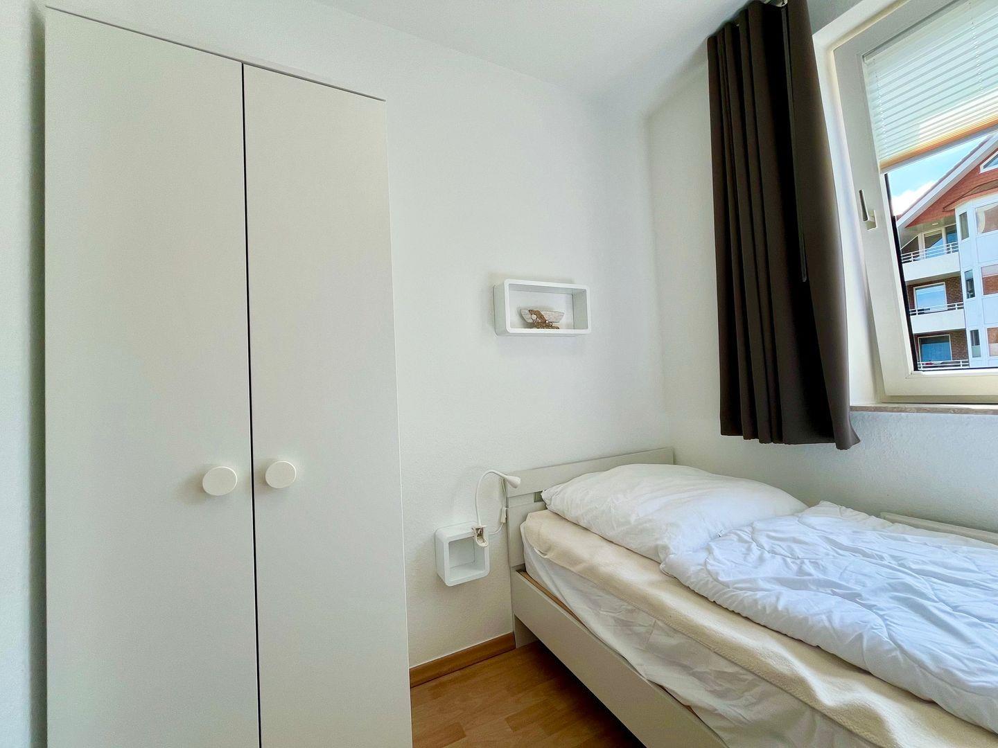 Haus "Lord Nelson", Typ 6, Appartement-Nr. "110", bis 6 Personen, 1. Etage, ca. 66 qm Größe, Südseite (ohne Meerblick/Richtung Trafalgar), Schlafzimmer mit Doppelbett, 2. Schlafzimmer mit zwei Einzelbetten, Wohnbereich mit Schrankbett (einzeln klappbar), Dusche/WC, sep. Küche mit Backofen, Geschirrspüler und Mikrowelle, Nichtraucher App. ,Balkon (Südseite), Flachbildschirm, kostenl. W-Lan Zugang im App., Haustiere sind auf Anfrage gestattet, Außenstellplatz, Strandkorb im Sommer 2026.