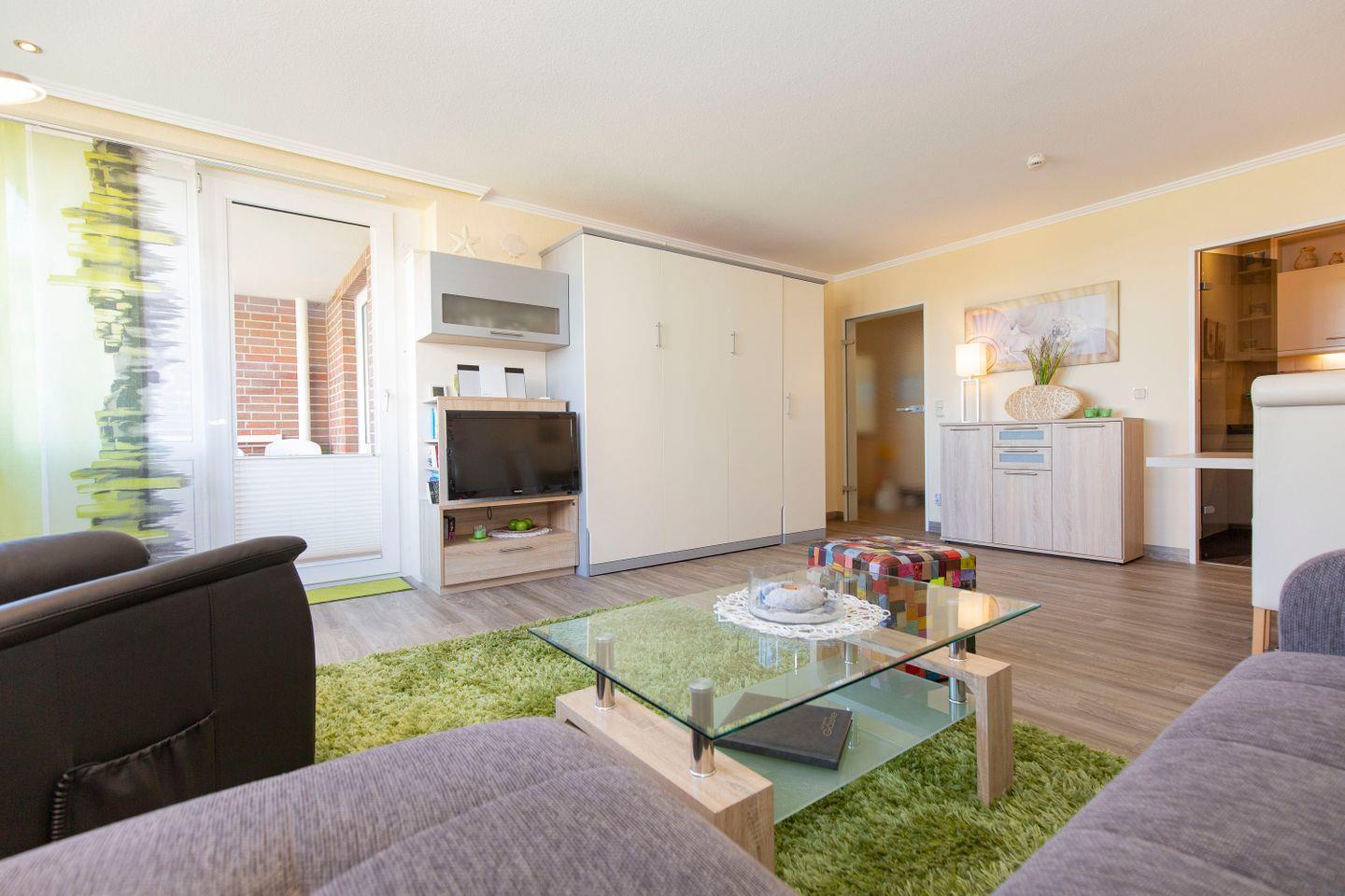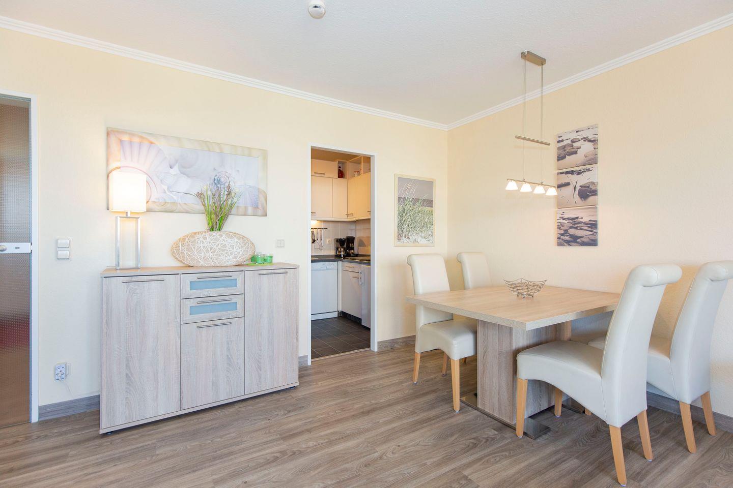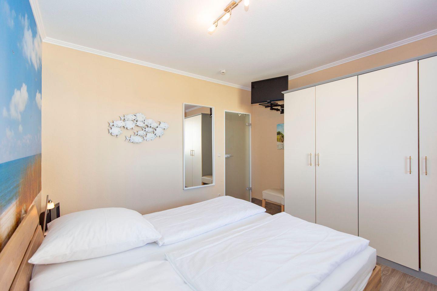 Haus "Trafalgar", Typ C, App.-Nr. "251", bis 4 Personen, ca. 55 qm Größe, 2. Etage Nordseite (ohne Seesicht), Schlafzimmer mit Doppelbett, Wohnbereich mit Schrankbett, Bad/WC, separate Küche mit Mikrowelle und Geschirrspüler, Balkon, Telefon, Kabel-TV, 2. TV Schlafzimmer, kostenl. WLAN-Anschluss, Tiefgaragenstellplatz, Nichtraucherwohnung, Haustiere sind nicht gestattet, Strandkorb im Sommer 2025.