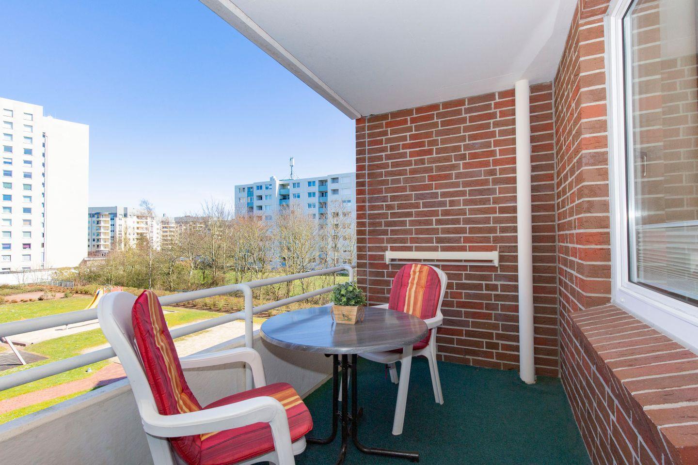 Der Balkon der Ferienwohnung liegt in Richtung Weltschifffahrtsweg. Die gemütlichen Balkonmöbel laden zu Entspannung und Erholung unter freiem Himmel ein.