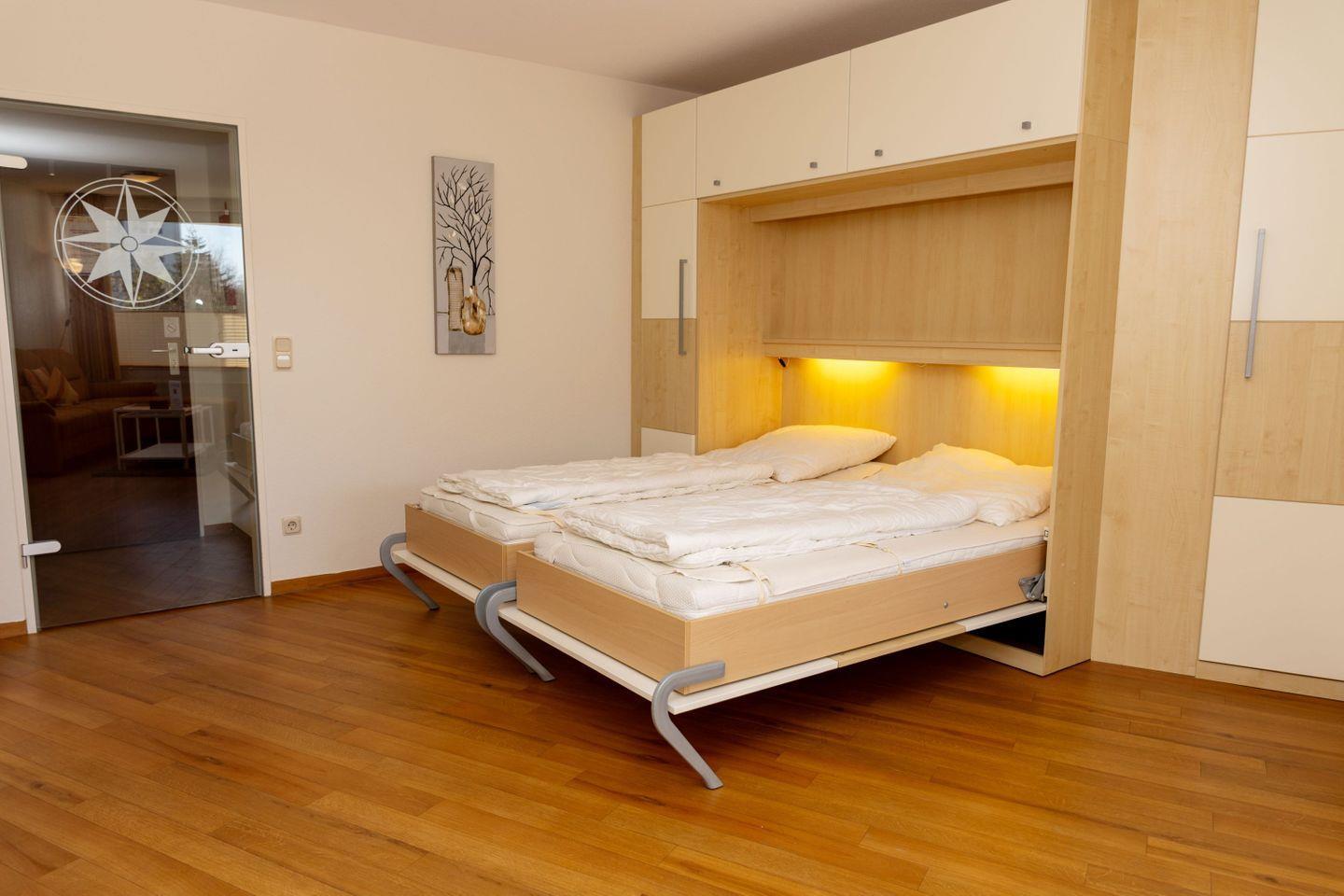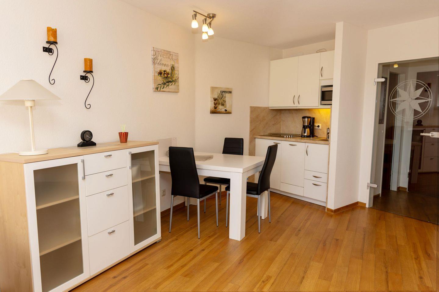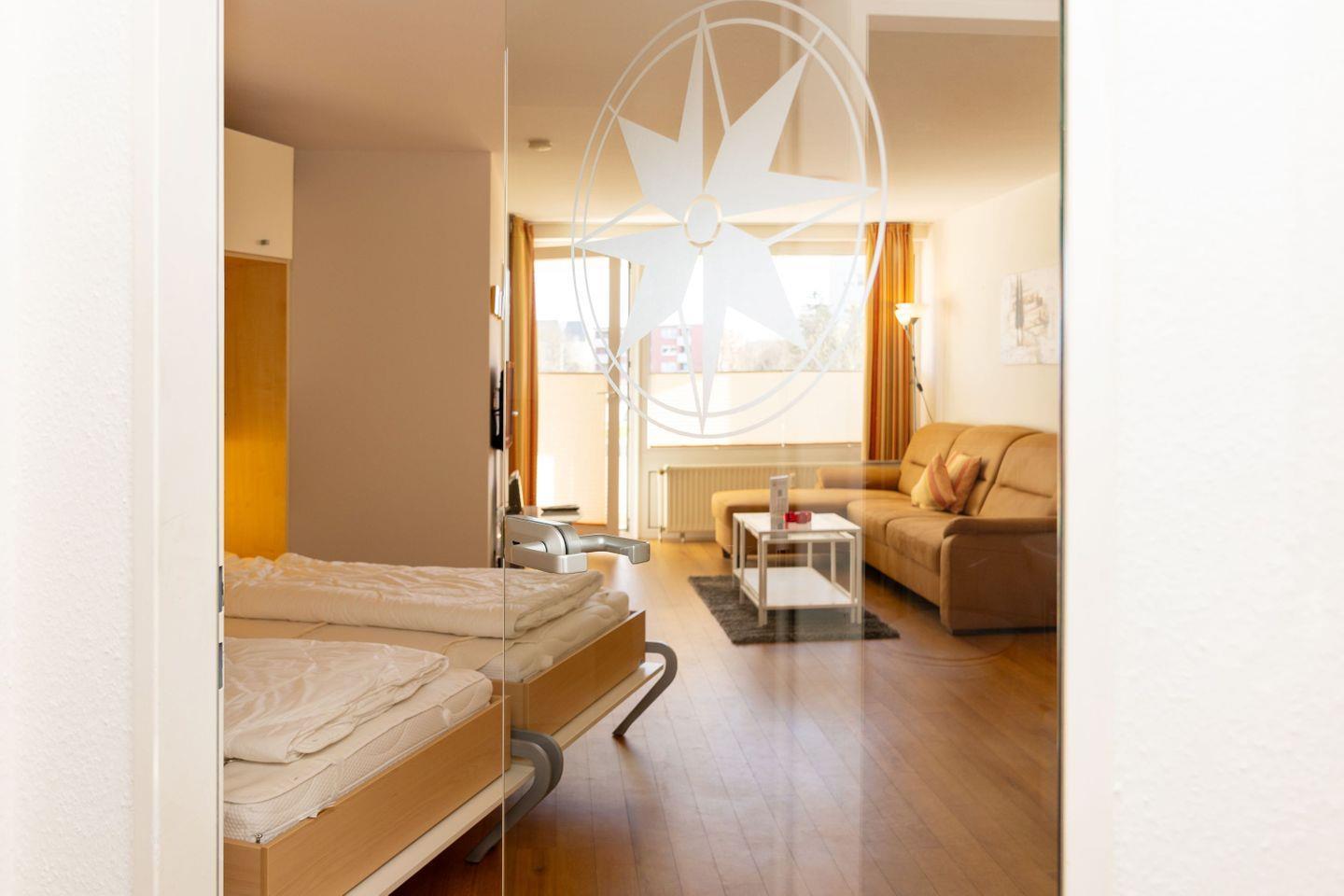 Haus "Lord Nelson", Typ 2, App-Nr. "115", bis 3 Personen, 1. Etage, Ostseite (ohne Meerblick/Richtung Elbe), Wohnbereich mit Schrankbett, separates kleines Kinderzimmer mit Einzelbett, Dusche/WC, Küchenzeile mit Mikrowelle/Grillfunktion, Geschirrspüler und Ceranfeld, ca. 40 qm Wohnungsgröße, Nichtraucher App., Balkon, Telefon, Kabel-TV, kostenl. W-Lan Zugang im App., Haustiere sind auf Anfrage gestattet, Tiefgaragenstellplatz, Strandkorb im Sommer 2025