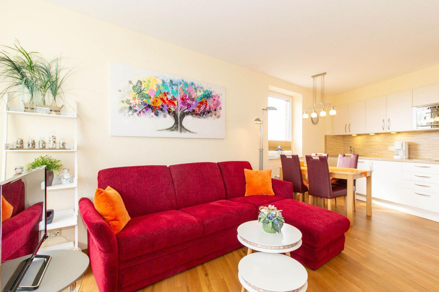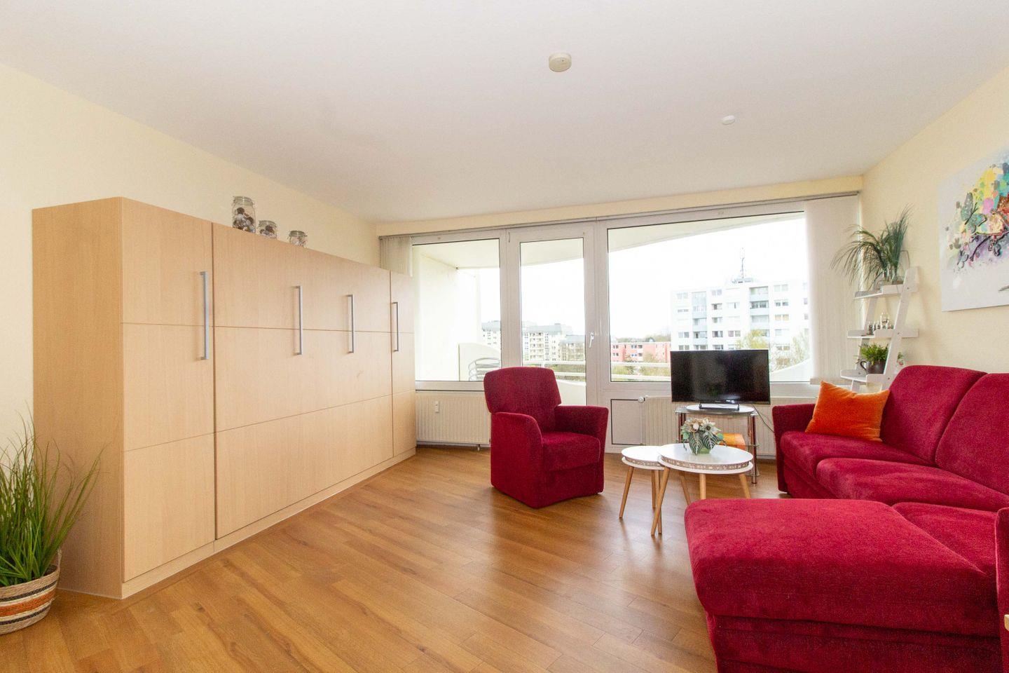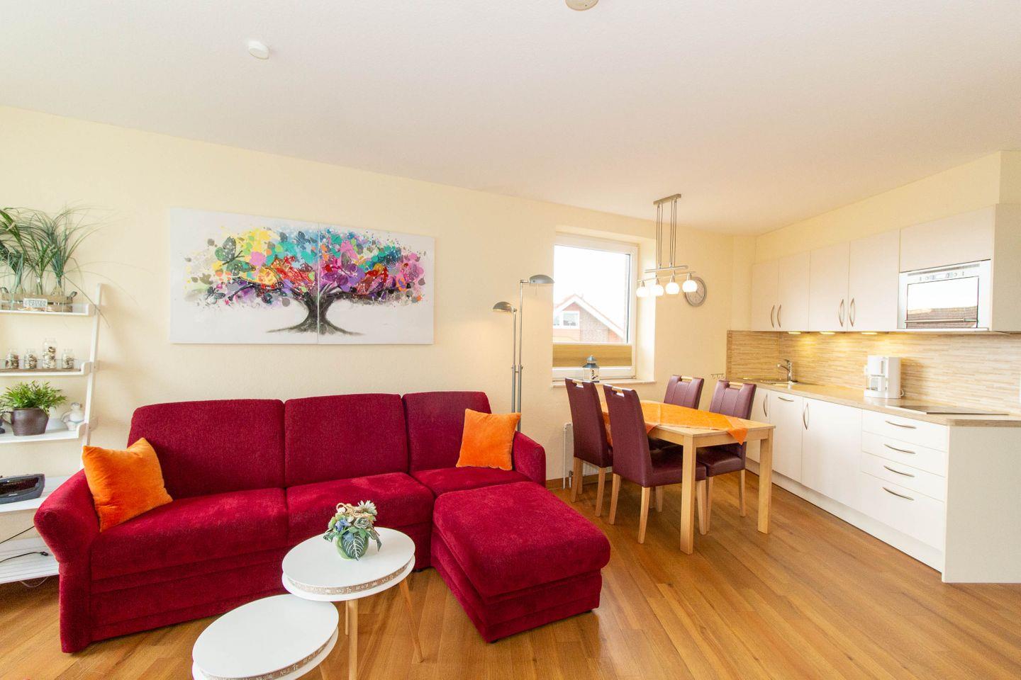 Die ca. 40m² große 2-Zimmer-Ferienwohnung für vier Personen besticht mit großzügigen, hellen Räumen und einem Balkon mit eingeschränktem Meerblick. Das Farbkonzept der Einrichtung besteht aus ruhigen Braun- und Sandtönen gepaart mit farbenfrohen Details, die oft in Form von Blumenmotiven auftauchen. Neben einer stimmigen Atmosphäre besticht das Domizil vor allem durch seine Top-Lage an der Nordsee. Von hier aus erreichen Sie den nahegelegenen Strand in wenigen Minuten, ein Bäcker und Einkaufsmöglichkeiten sind ebenfalls nicht weit entfernt. Zu Fuß können Sie ebenfalls das Wahrzeichen Cuxhavens, die Kugelbake, bei einem Spaziergang besichtigen.