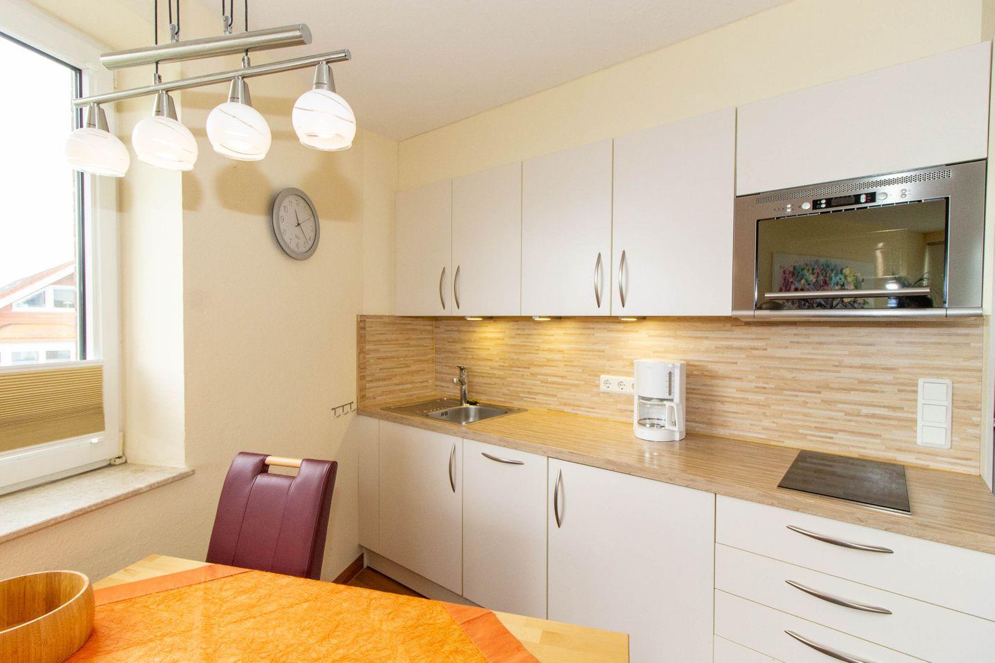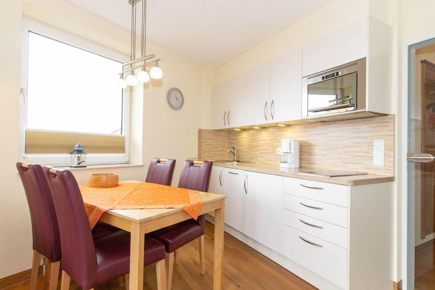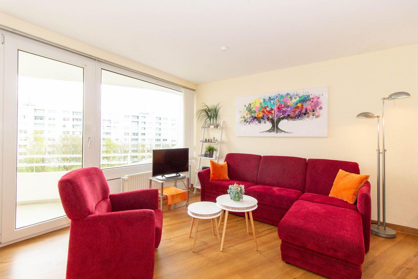 Die ca. 40m² große 2-Zimmer-Ferienwohnung für vier Personen besticht mit großzügigen, hellen Räumen und einem Balkon mit eingeschränktem Meerblick. Das Farbkonzept der Einrichtung besteht aus ruhigen Braun- und Sandtönen gepaart mit farbenfrohen Details, die oft in Form von Blumenmotiven auftauchen. Neben einer stimmigen Atmosphäre besticht das Domizil vor allem durch seine Top-Lage an der Nordsee. Von hier aus erreichen Sie den nahegelegenen Strand in wenigen Minuten, ein Bäcker und Einkaufsmöglichkeiten sind ebenfalls nicht weit entfernt. Zu Fuß können Sie ebenfalls das Wahrzeichen Cuxhavens, die Kugelbake, bei einem Spaziergang besichtigen.