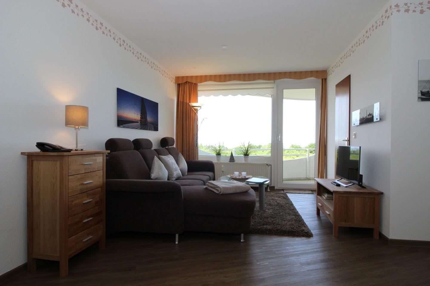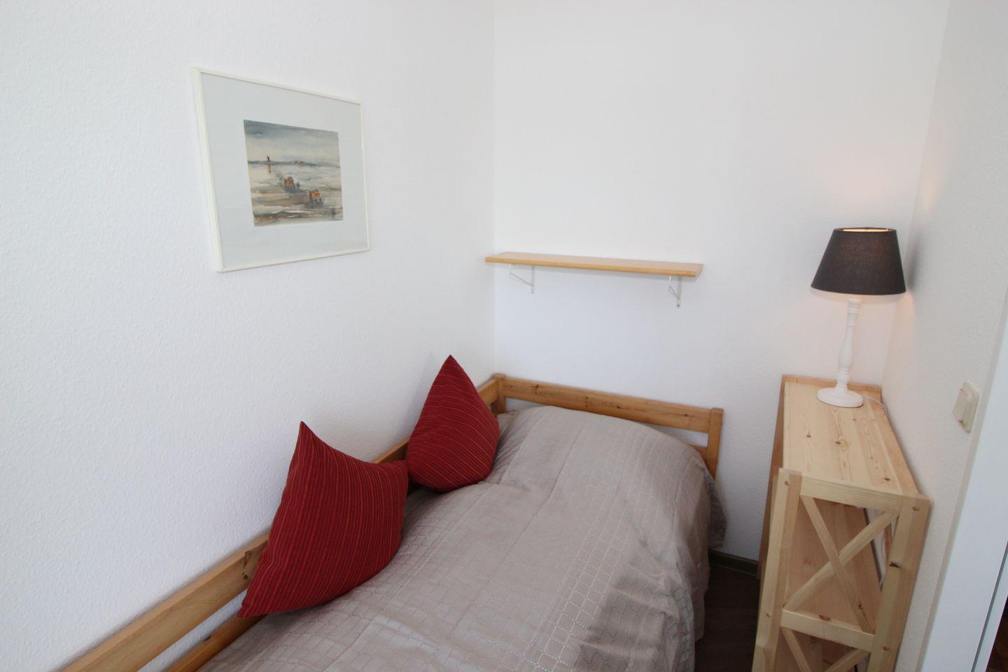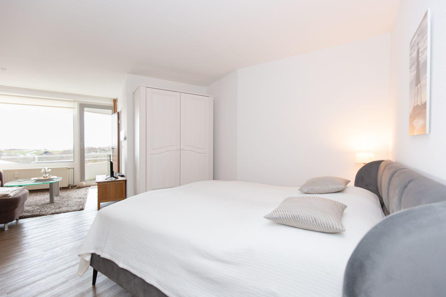 Haus "Lord Nelson", Typ 2, App.-Nr. 405, bis 3 Personen, 4. Etage, ca. 40 qm, Lage Richtung Weltnaturerbe Wattenmeer, Meerblick Richtung Neuwerk, Wohn/Schlafbereich mit feststehendem Doppelbett (160x200 durchgehende Matratze), sep. Schlafzimmer mit Einzelbett, Dusche/WC, Küchenzeile mit Mikrowelle und Geschirrspüler, Balkon, Telefon, kostenl. WLAN-Anschluss im App., Kabel-TV, Tiefgaragenstellplatz, Nichtraucherappartement, Haustiere sind nicht erlaubt, Strandkorb im Sommer 2026.