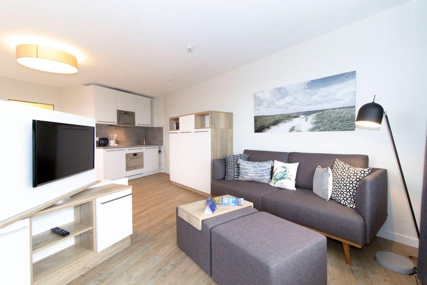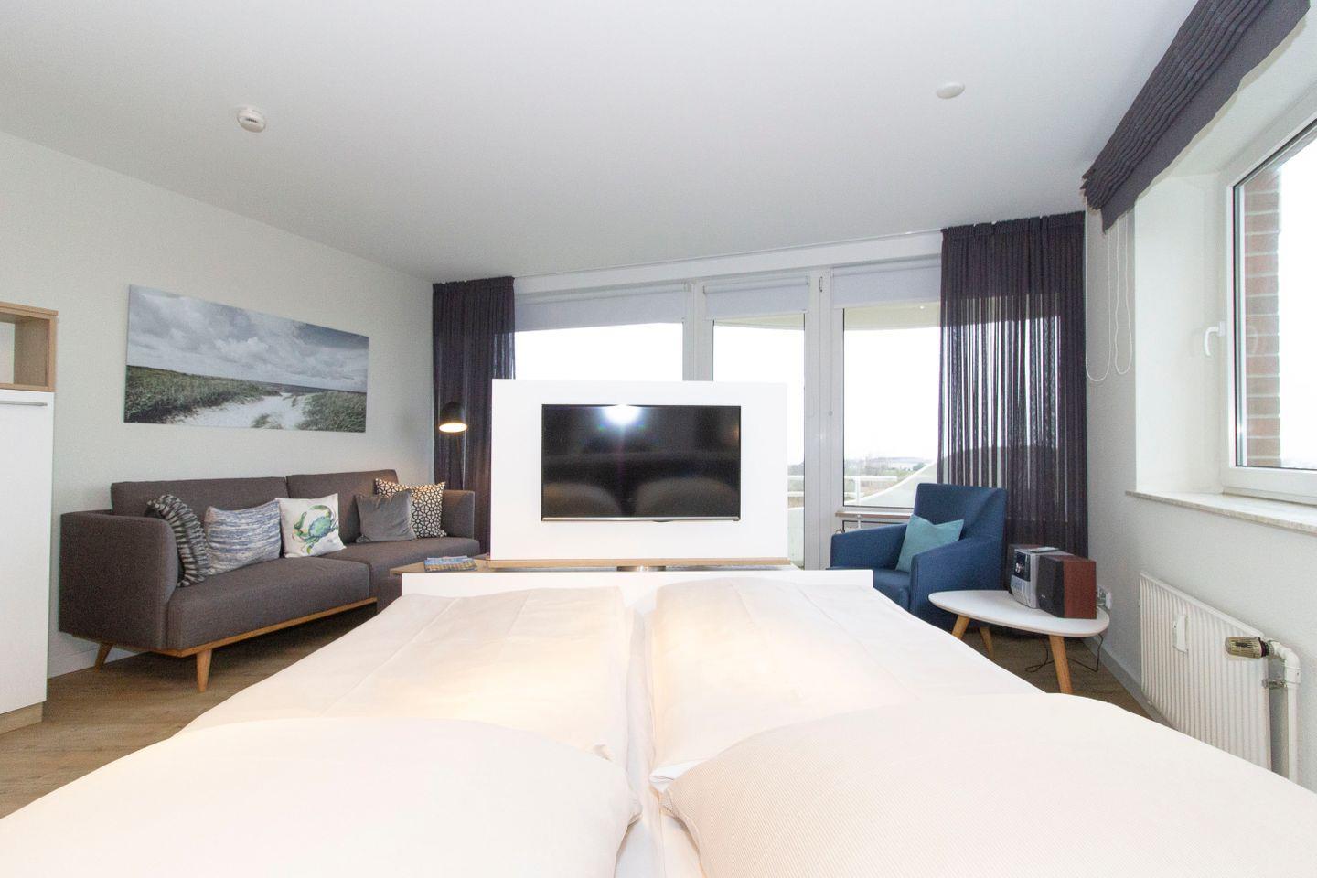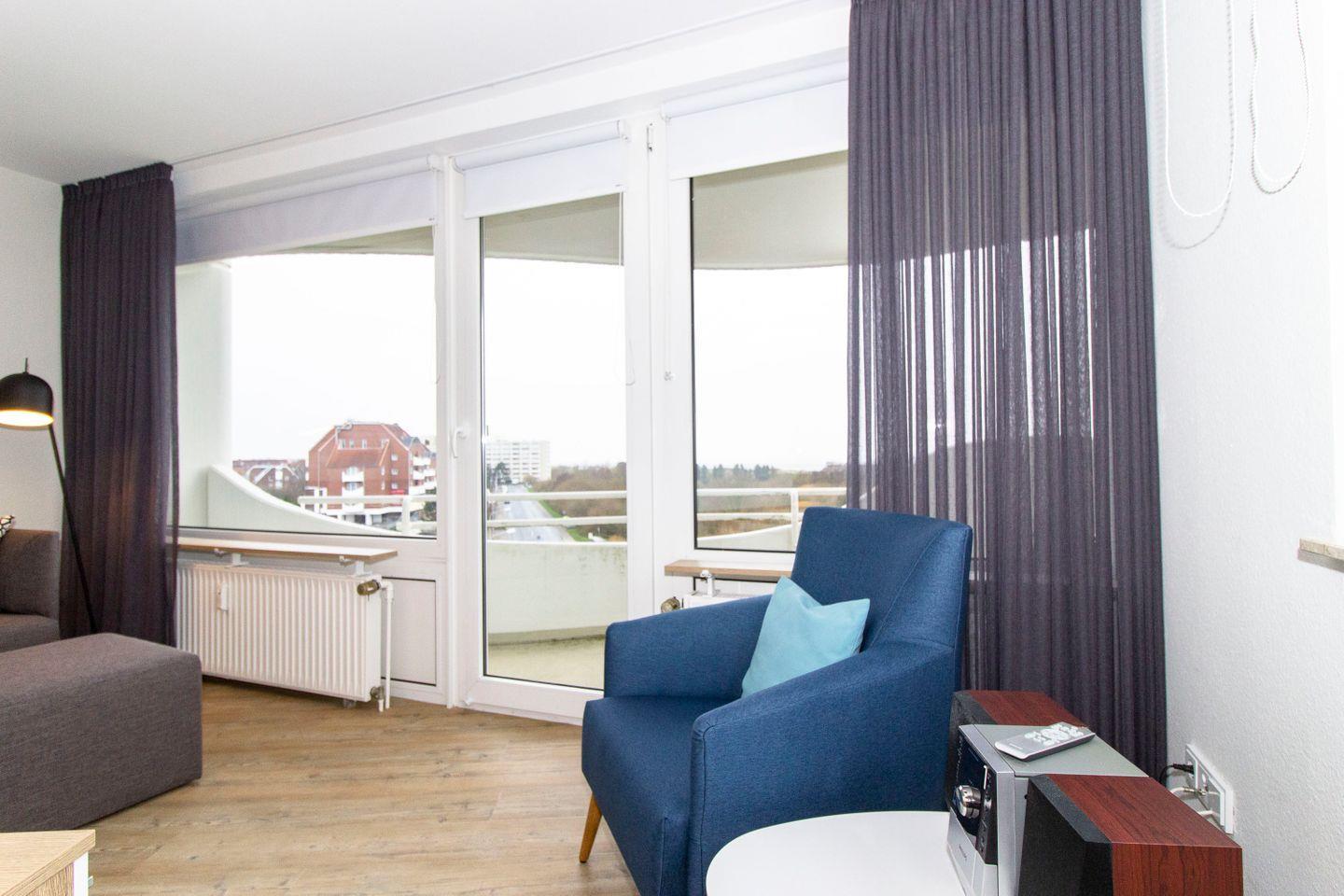 Haus "Lord Nelson", Typ 1, App.-Nr. 401, bis 2 Pers., 4. Etage, ca. 43 qm, Meerblick Richtung Neuwerk und Elbmündung, Wohnbereich mit einem Doppelbett, Dusche/WC, Küchenzeile mit Geschirrspüler, Mikrowelle mit Grillfunktion und 2-Platten-Ceranfeld, Balkon, Kabel-TV, kostenl. W-Lan Zugang im App., CD-Kassetten-Radio, Tiefgaragenstellplatz, Haustiere sind auf Anfrage erlaubt, Nichtraucherwohnung, Strandkorb im Sommer 2026.