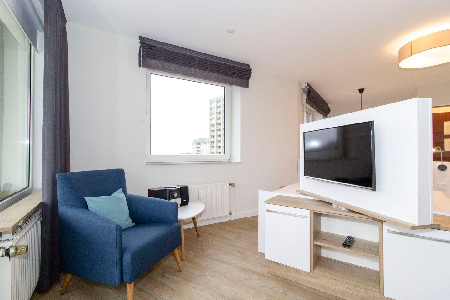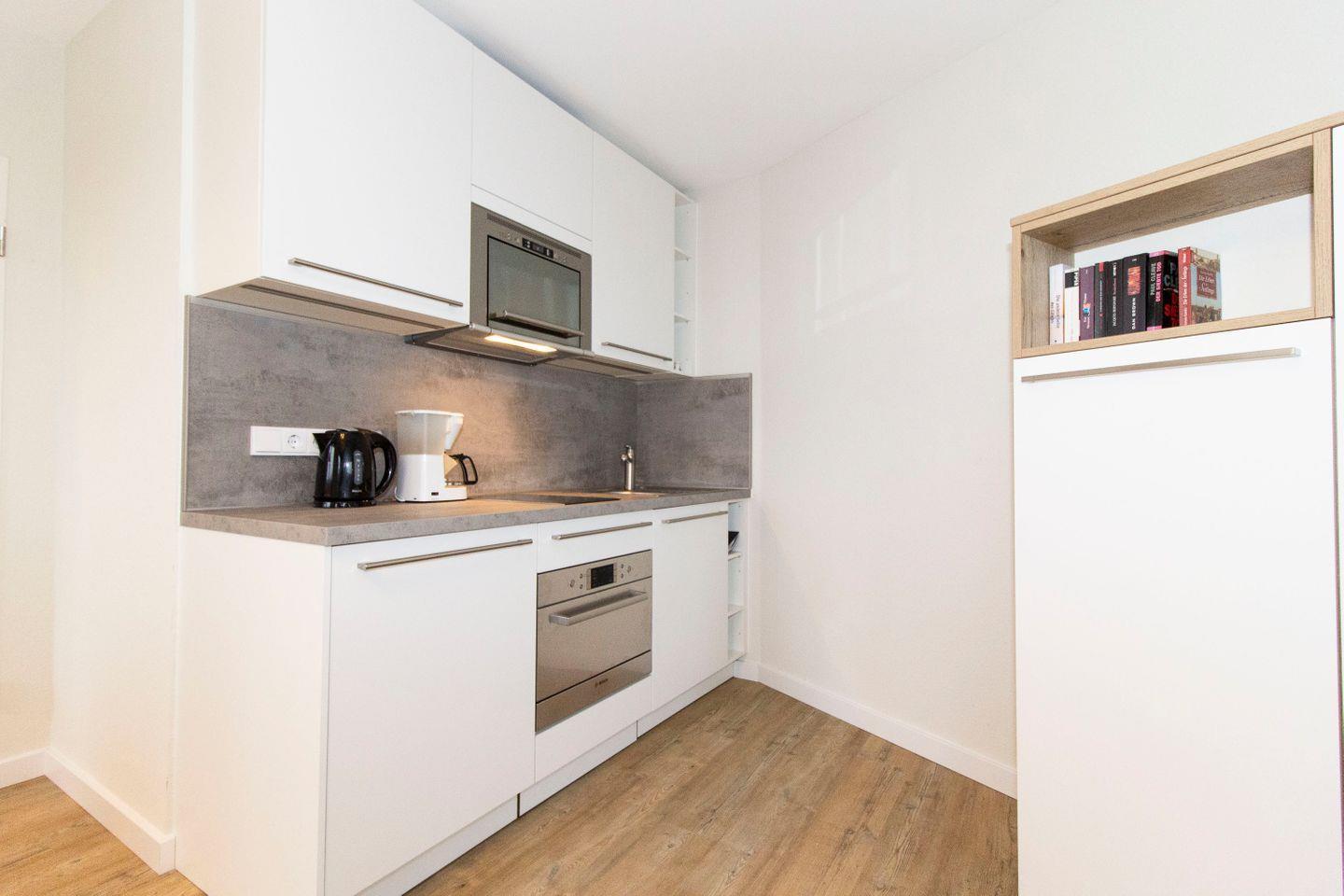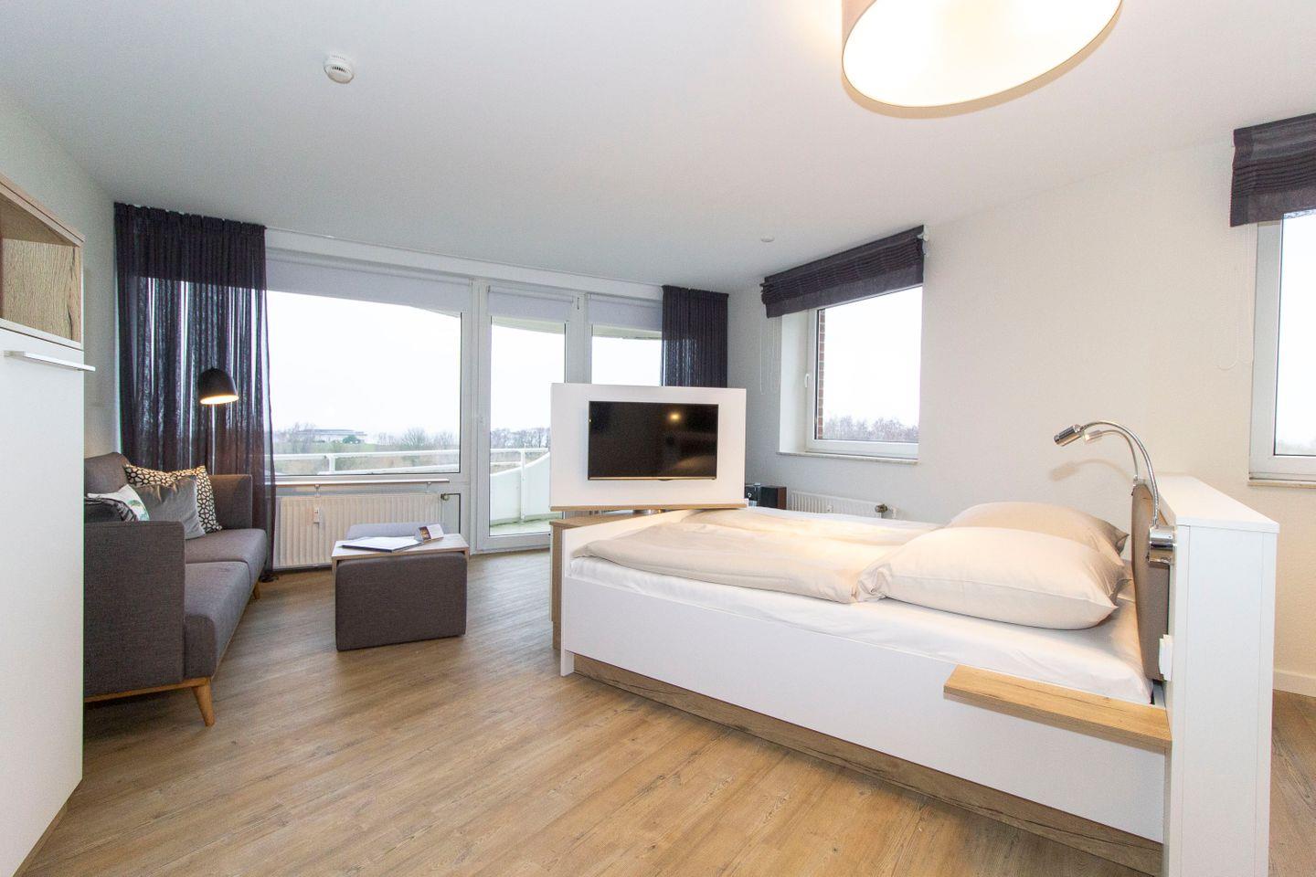 Haus "Lord Nelson", Typ 1, App.-Nr. 401, bis 2 Pers., 4. Etage, ca. 43 qm, Meerblick Richtung Neuwerk und Elbmündung, Wohnbereich mit einem Doppelbett, Dusche/WC, Küchenzeile mit Geschirrspüler, Mikrowelle mit Grillfunktion und 2-Platten-Ceranfeld, Balkon, Kabel-TV, kostenl. W-Lan Zugang im App., CD-Kassetten-Radio, Tiefgaragenstellplatz, Haustiere sind auf Anfrage erlaubt, Nichtraucherwohnung, Strandkorb im Sommer 2026.
