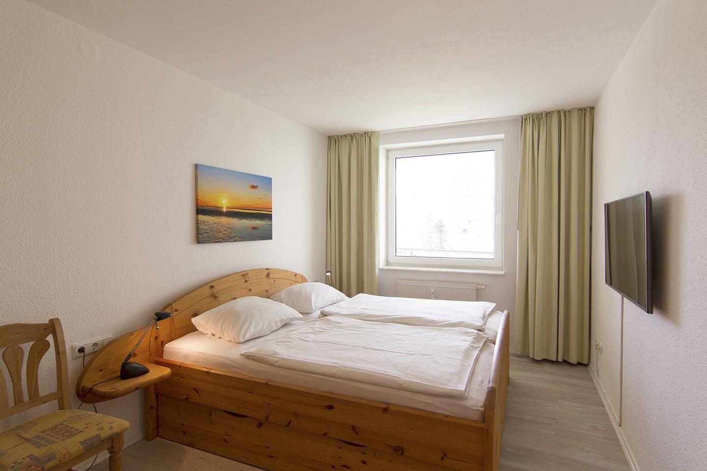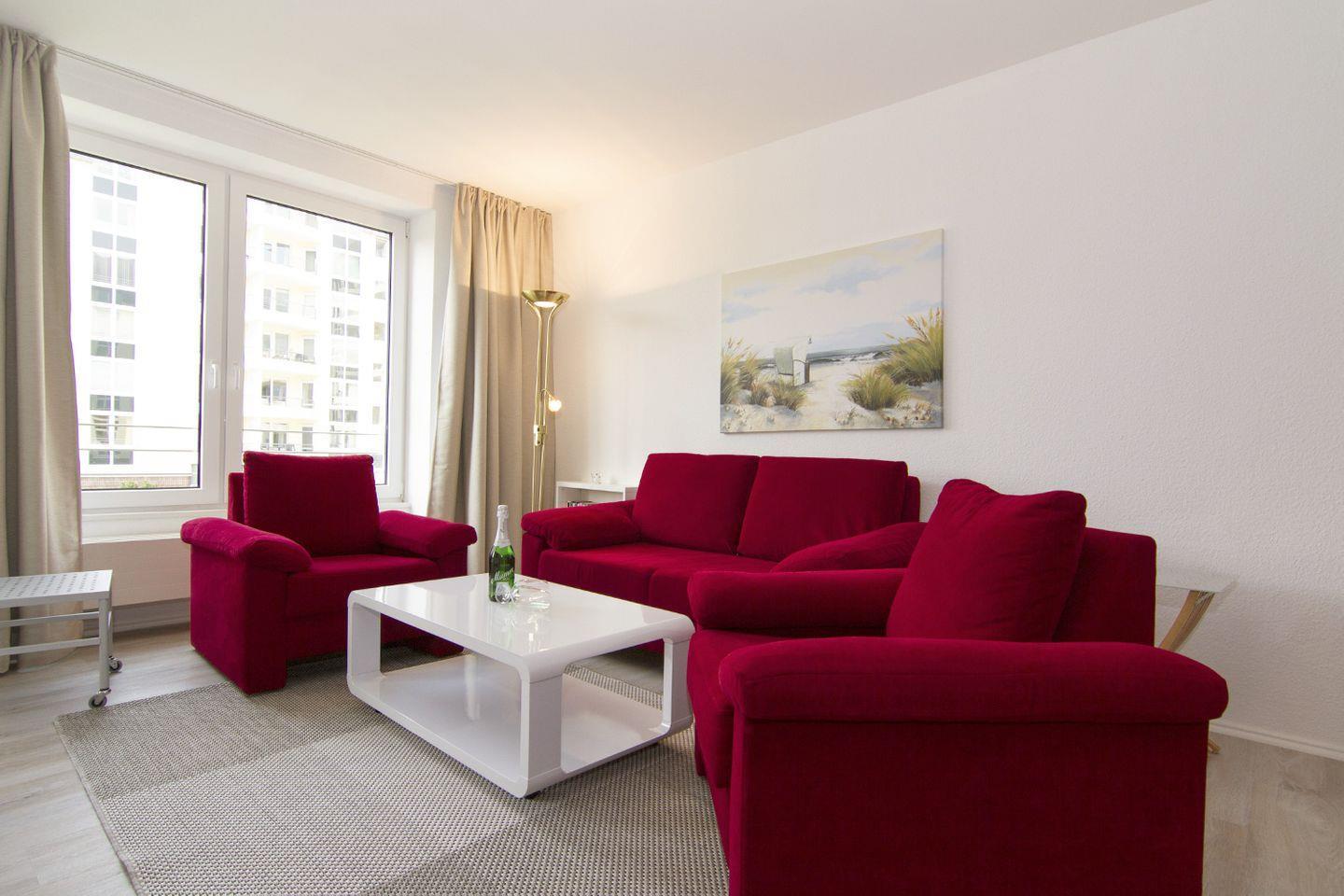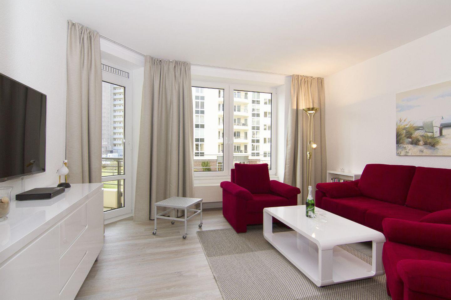 Haus "Kurpark-Residenz", Typ D1, App.-Nr. "134", bis 6 Pers., 1. OG, Südseite ("Parkseite"), ca. 66 m² Größe, Wohnzimmer mit Schlafcouch, sep. Schlafzimmer mit Doppelbett und Ausziehbett und 2. TV-Gerät, Dusche/WC, Gäste-WC, Küchenzeile mit Mikrowelle, Backofen und Geschirrspüler, Loggia, SAT-TV, Tiefgaragenstellplatz, Haustiere sind nicht gestattet, Strandkorb im Sommer 2026.