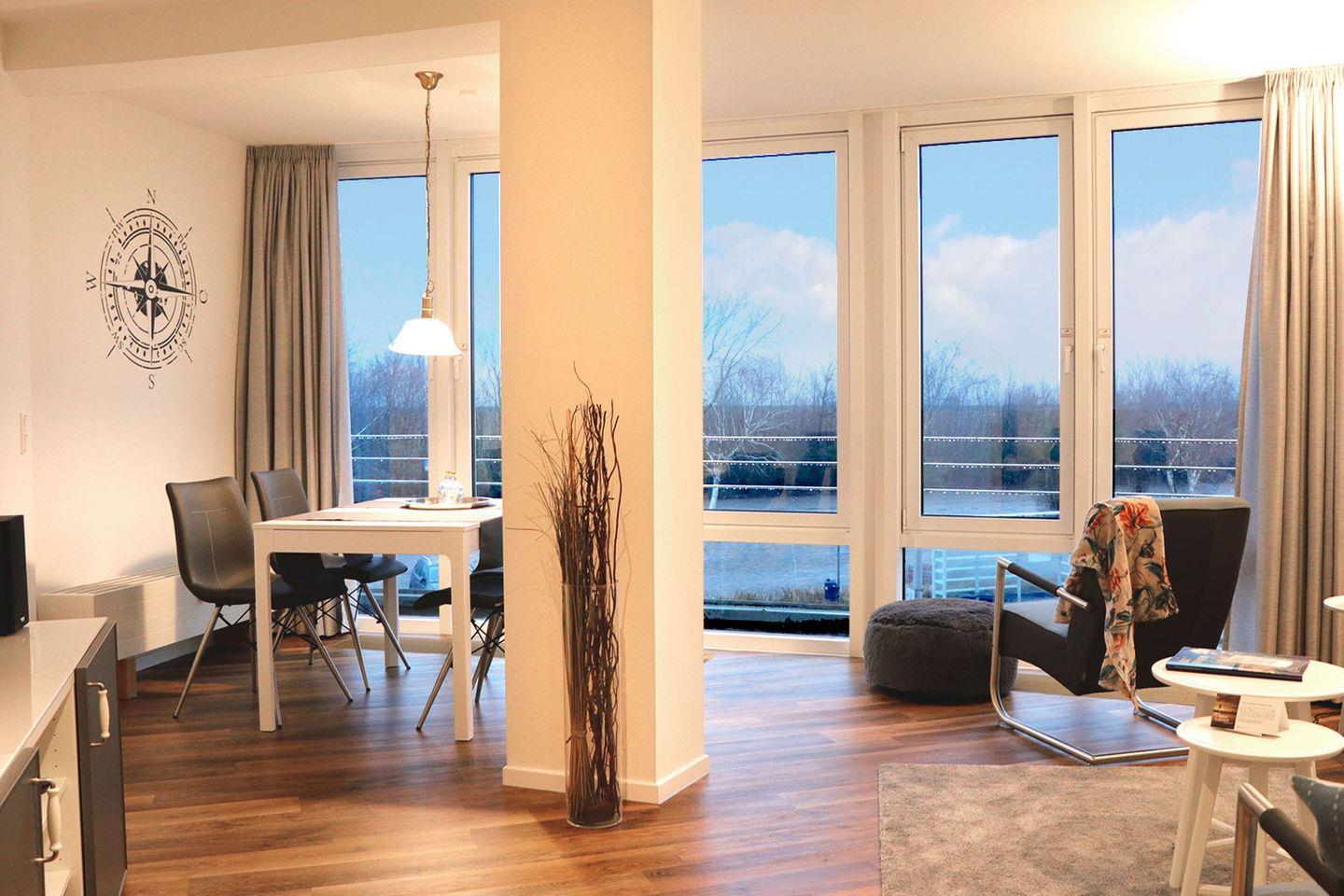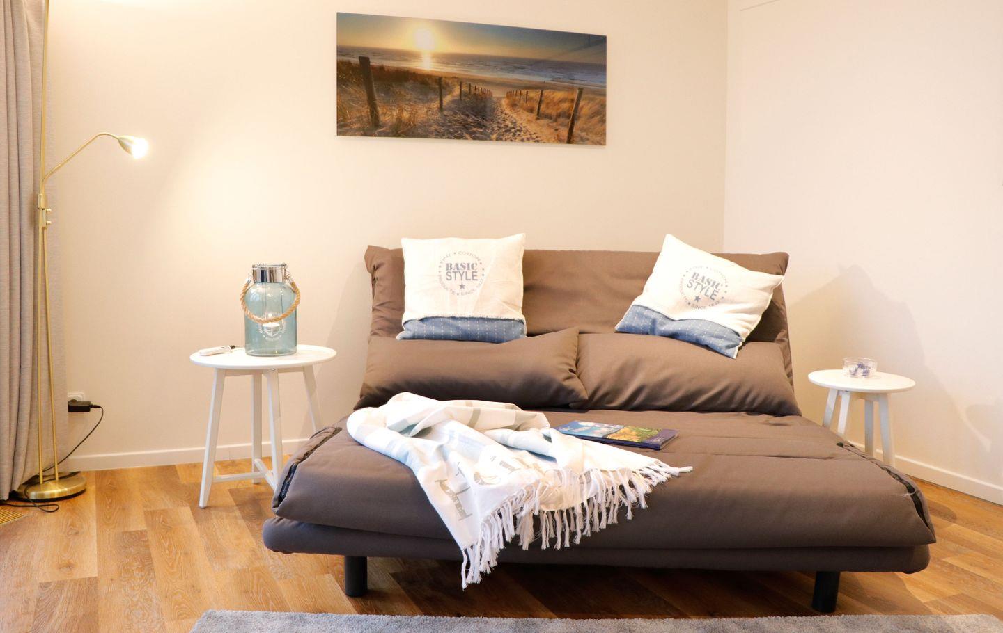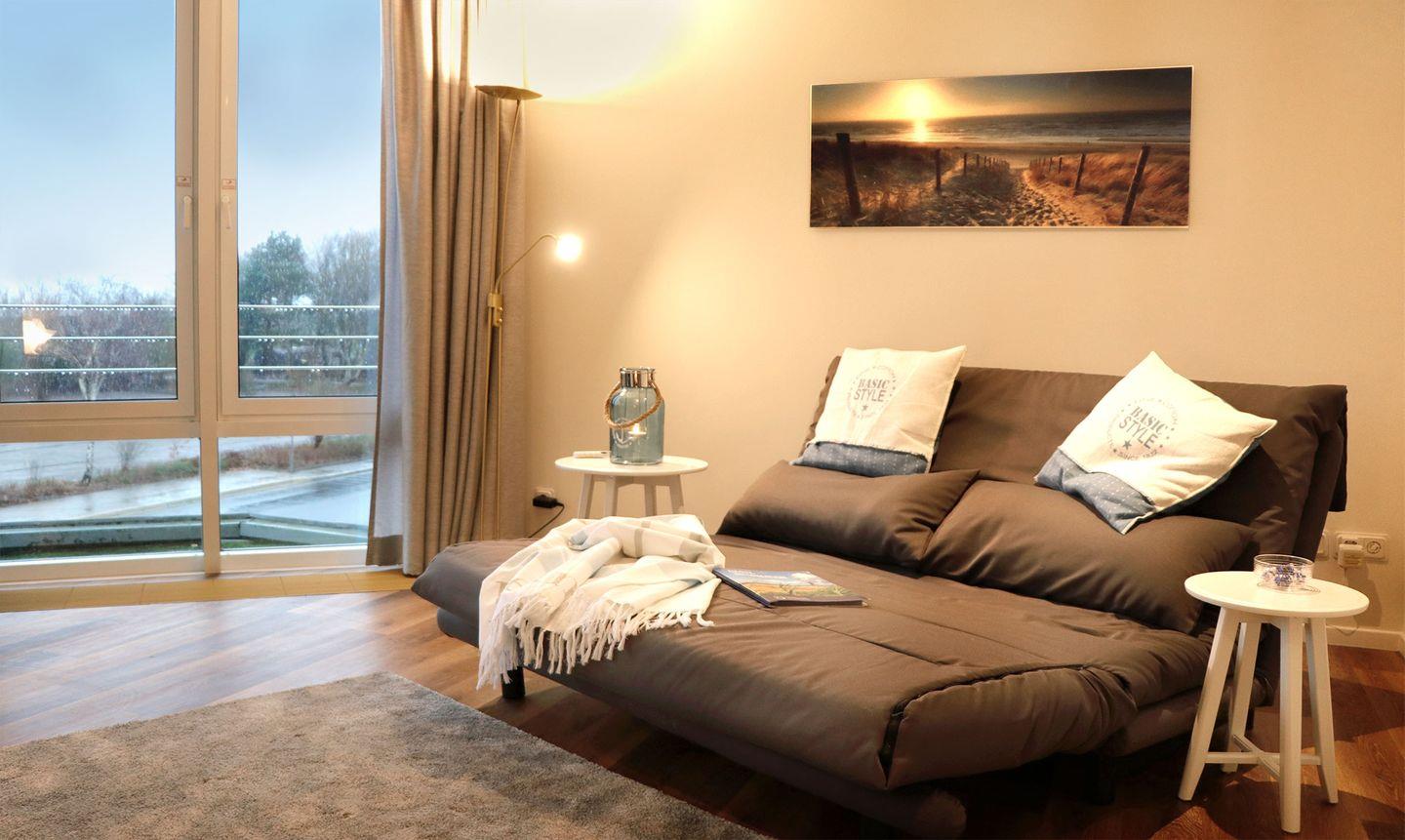 Lichtdurchflutetes Appartement im maritimen Stil mit Schlafsofa Multy im Wohnbereich, dessen große Fensterfront direkt auf den Deich gerichtet ist. Das separate, gemütliche Schlafzimmer bietet weiteren zwei Personen eine Schlafgelegenheit.