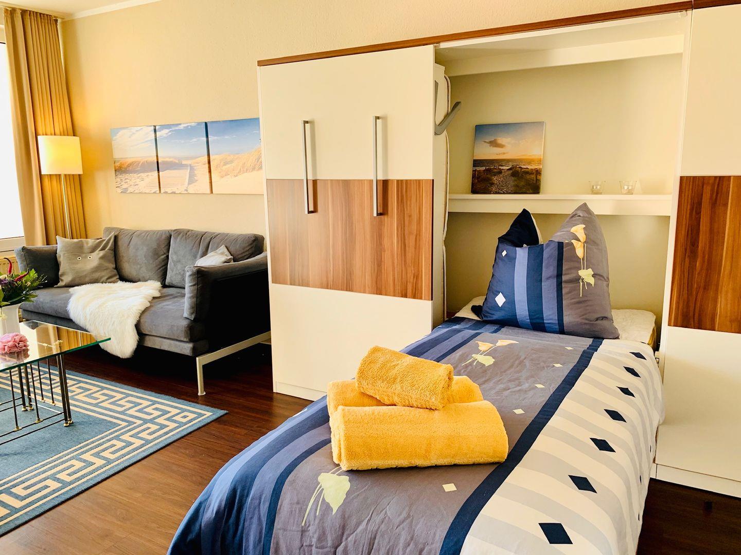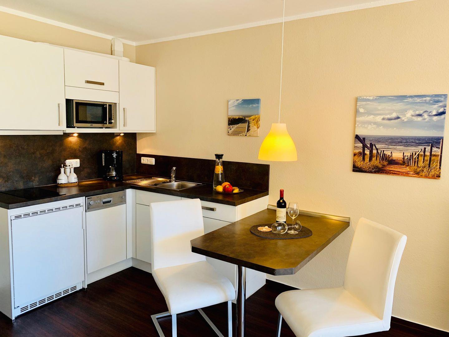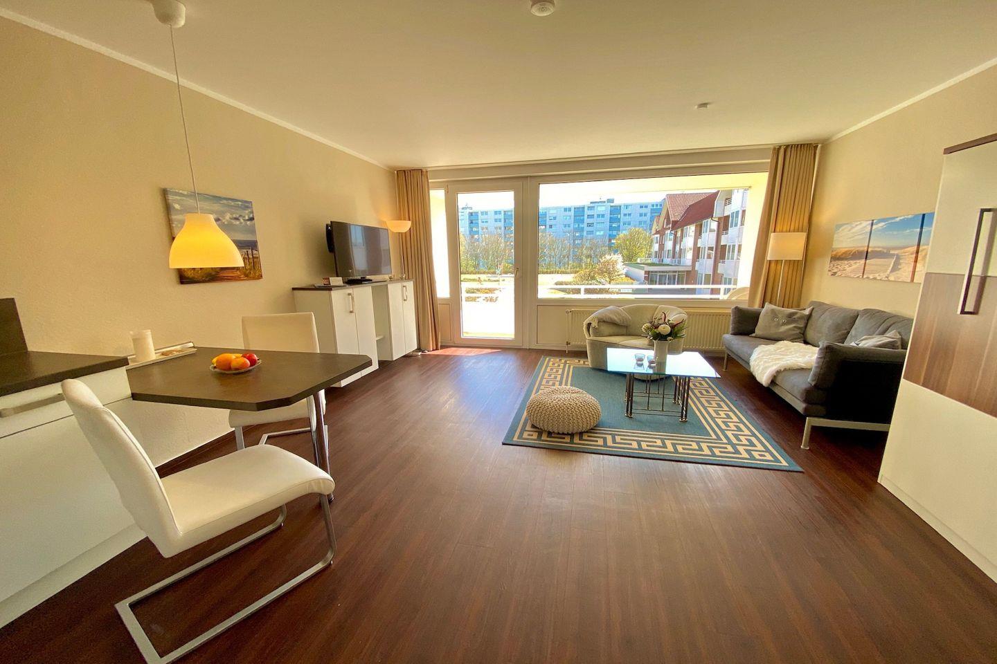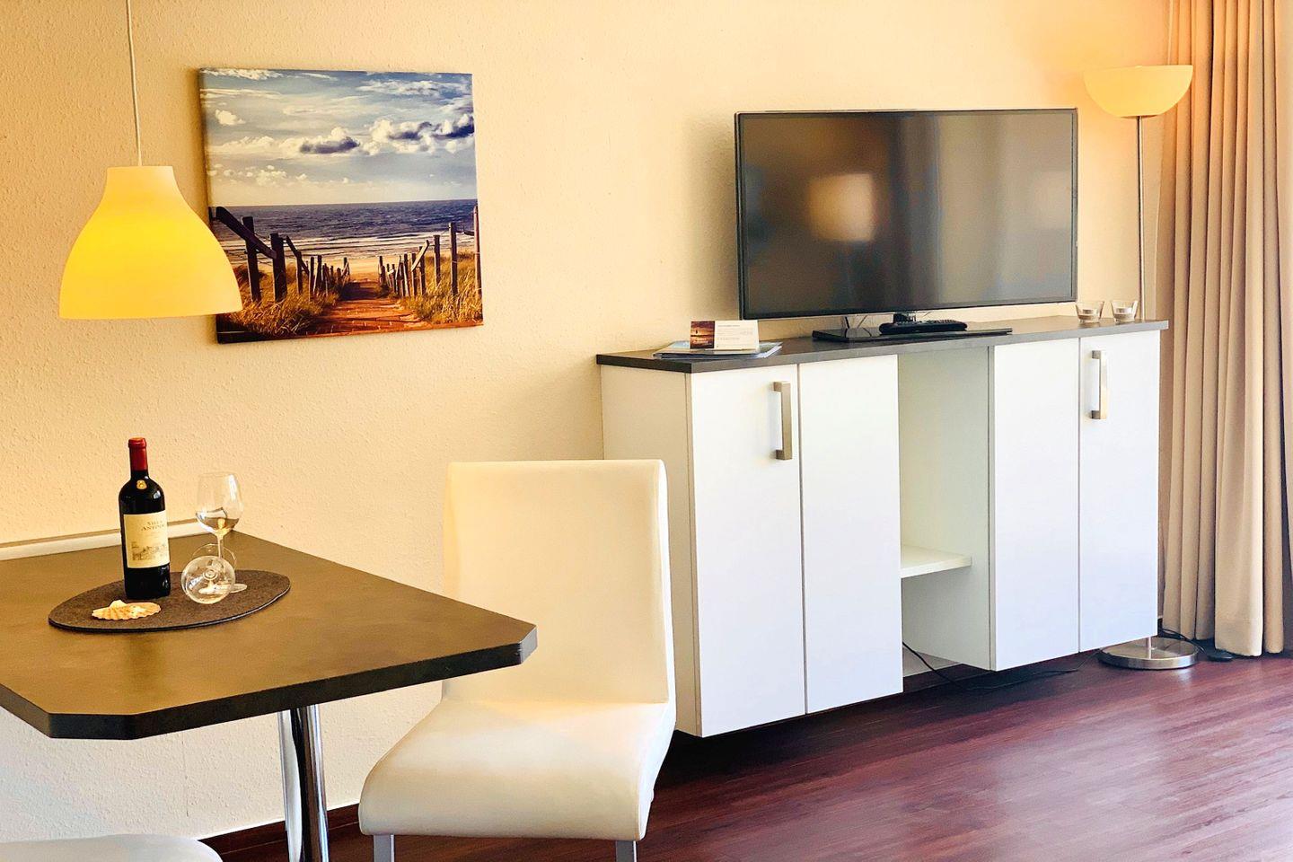 Haus "Trafalgar", Typ A-Ost, App.-Nr. 131, bis 2 Pers., 1. Etage, ca. 34 qm, Ostseite (ohne Meerblick), Wohn/Schlafbereich mit Schrankbett (einzeln klappbar), Küchenzeile mit Geschirrspüler, 2-Platten-Ceranfeld und Mikrowelle, Dusche/WC, Balkon, Kabel-TV, Tiefgaragenstellplatz, Nichtraucherwohnung, Haustiere sind nicht gestattet, kostenl. WLAN-Zugang im App., ab 5 Übernachtungen 1 Wäschepaket p.P. inkl.