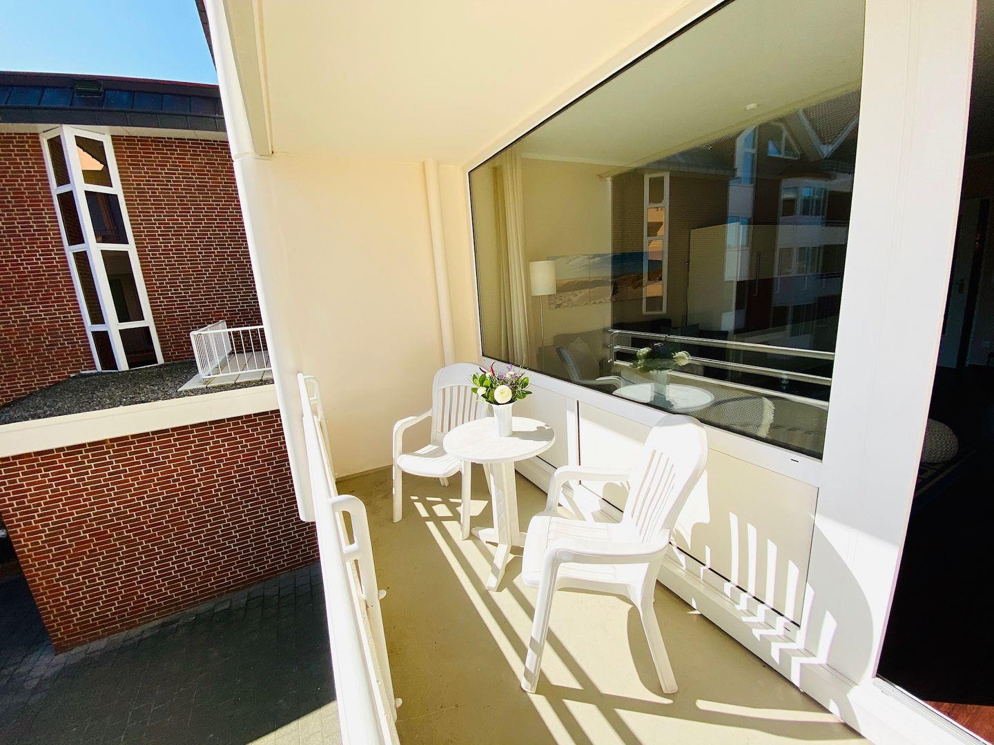 Auf dem möblierten Balkon können Urlaubsgäste am Morgen mit einem Frühstück unter freiem Himmel perfekt in den Urlaubstag starten.