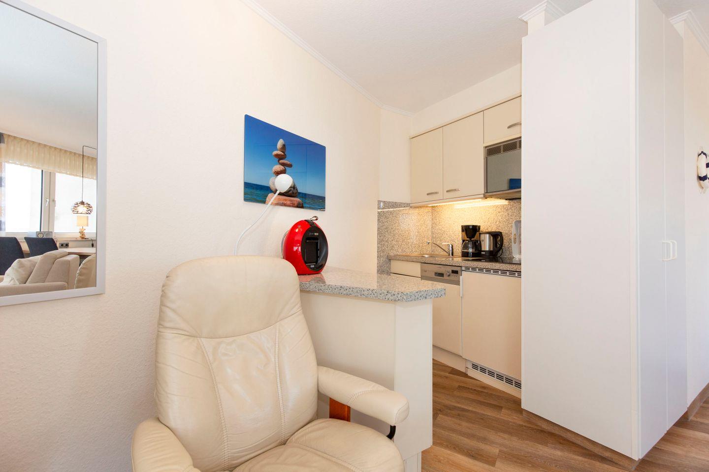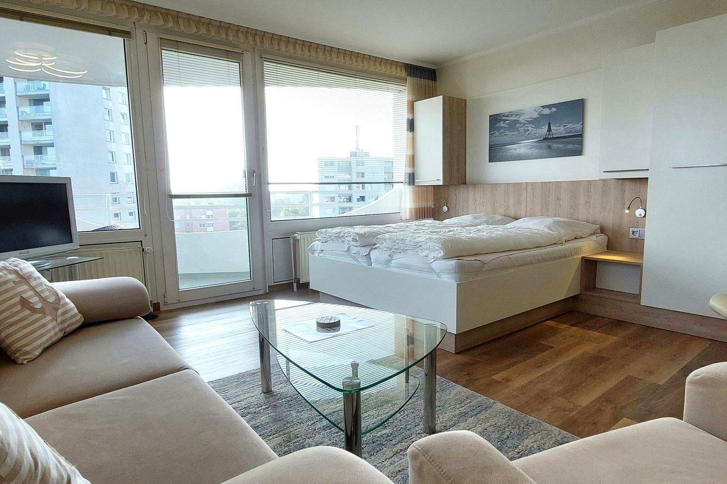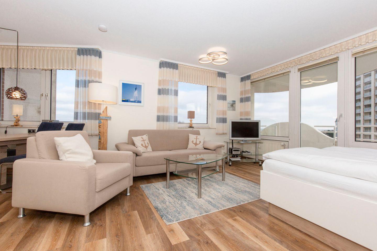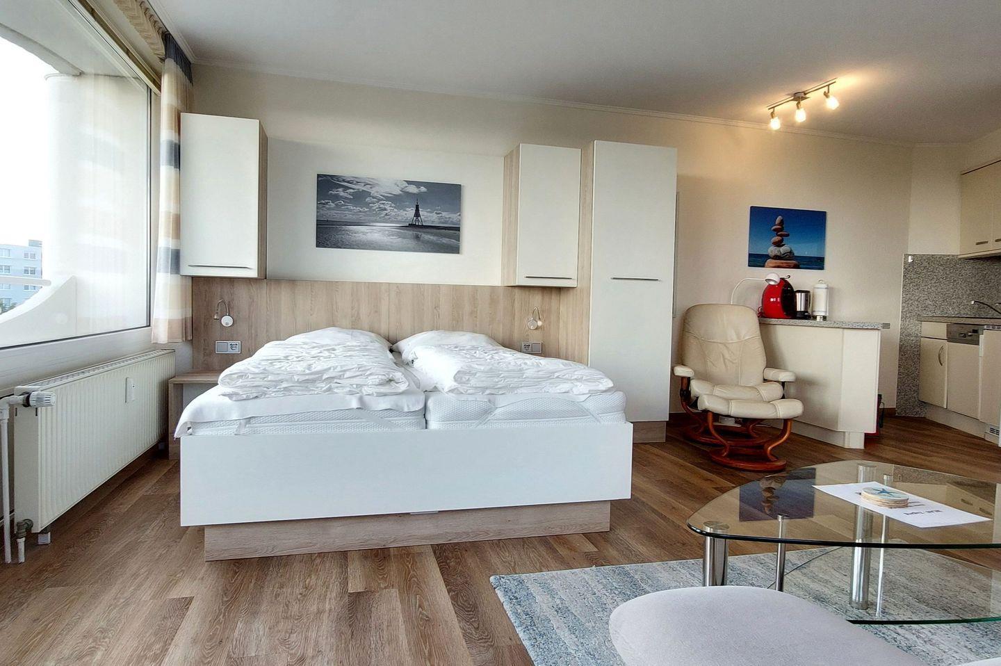 Haus "Lord Nelson", Typ 1, App.-Nr. 520, bis 2 Pers., 5. Etage, ca. 43 qm, Ostseite, Meerblick Richtung Nordsee, seitlicher Meerblick Richtung Elbe, Wohn-Schlafraum mit neuem Doppelbett (Frühjahr 2024), Dusche/WC, Küchenzeile mit Geschirrspüler und Mikrowelle, 4-Platten Ceranfeld, Balkon, Kabel-TV (Flat-Screen), kostenl. W-Lan Zugang im App., CD-Spieler, Tresor, Tiefgaragenstellplatz, Strandkorb im Sommer 2026, Haustiere sind nicht erlaubt, Nichtraucherwohnung.
