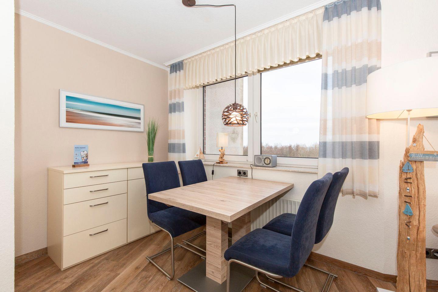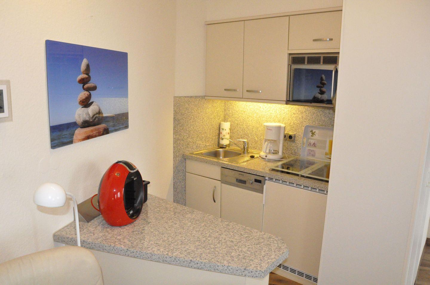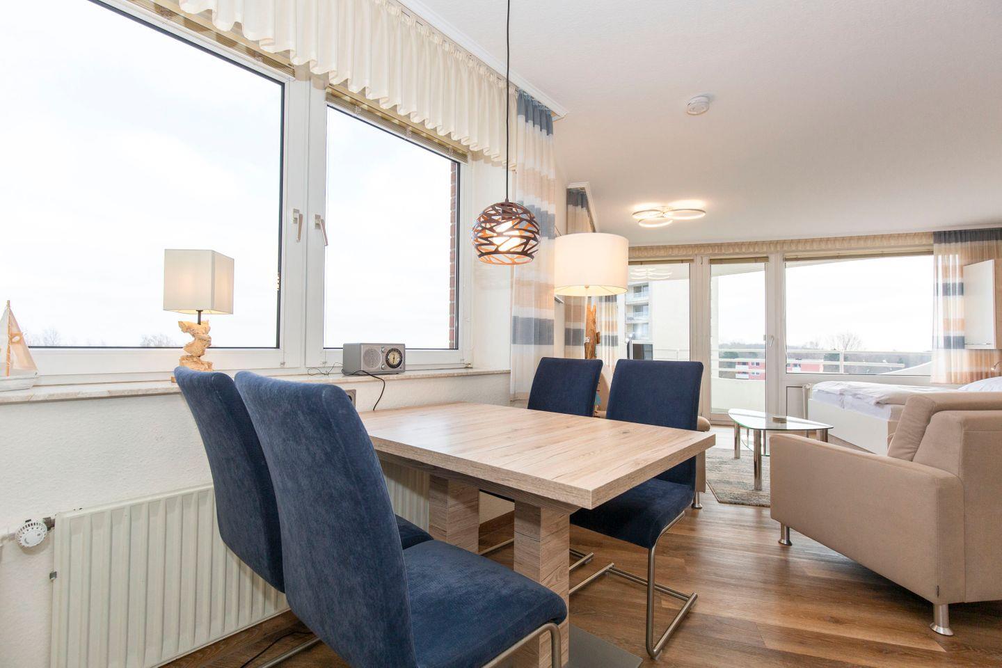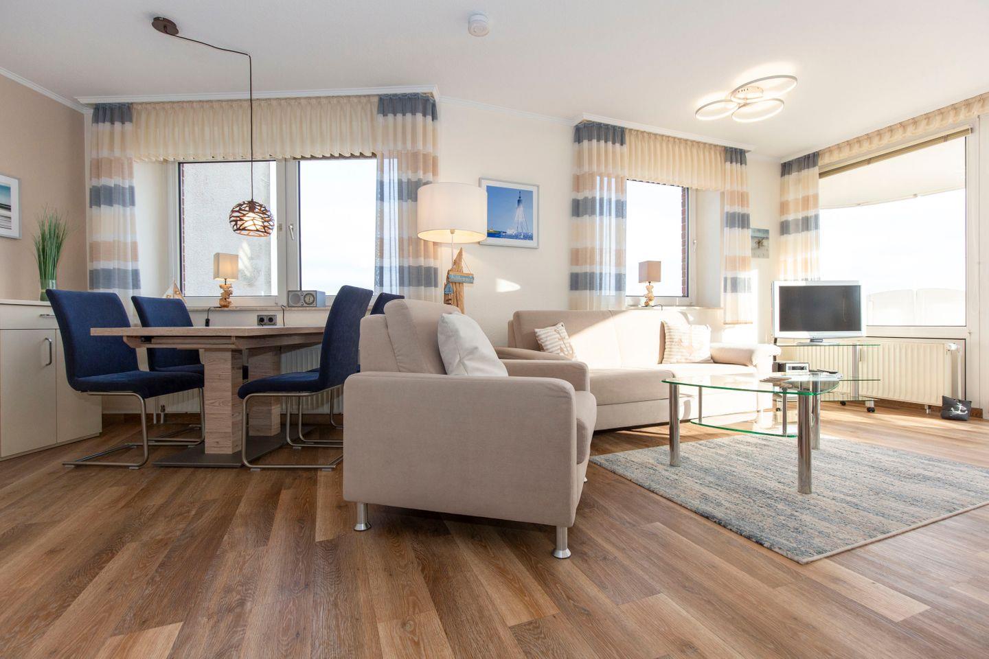 Haus "Lord Nelson", Typ 1, App.-Nr. 520, bis 2 Pers., 5. Etage, ca. 43 qm, Ostseite, Meerblick Richtung Nordsee, seitlicher Meerblick Richtung Elbe, Wohn-Schlafraum mit neuem Doppelbett (Frühjahr 2024), Dusche/WC, Küchenzeile mit Geschirrspüler und Mikrowelle, 4-Platten Ceranfeld, Balkon, Kabel-TV (Flat-Screen), kostenl. W-Lan Zugang im App., CD-Spieler, Tresor, Tiefgaragenstellplatz, Strandkorb im Sommer 2026, Haustiere sind nicht erlaubt, Nichtraucherwohnung.