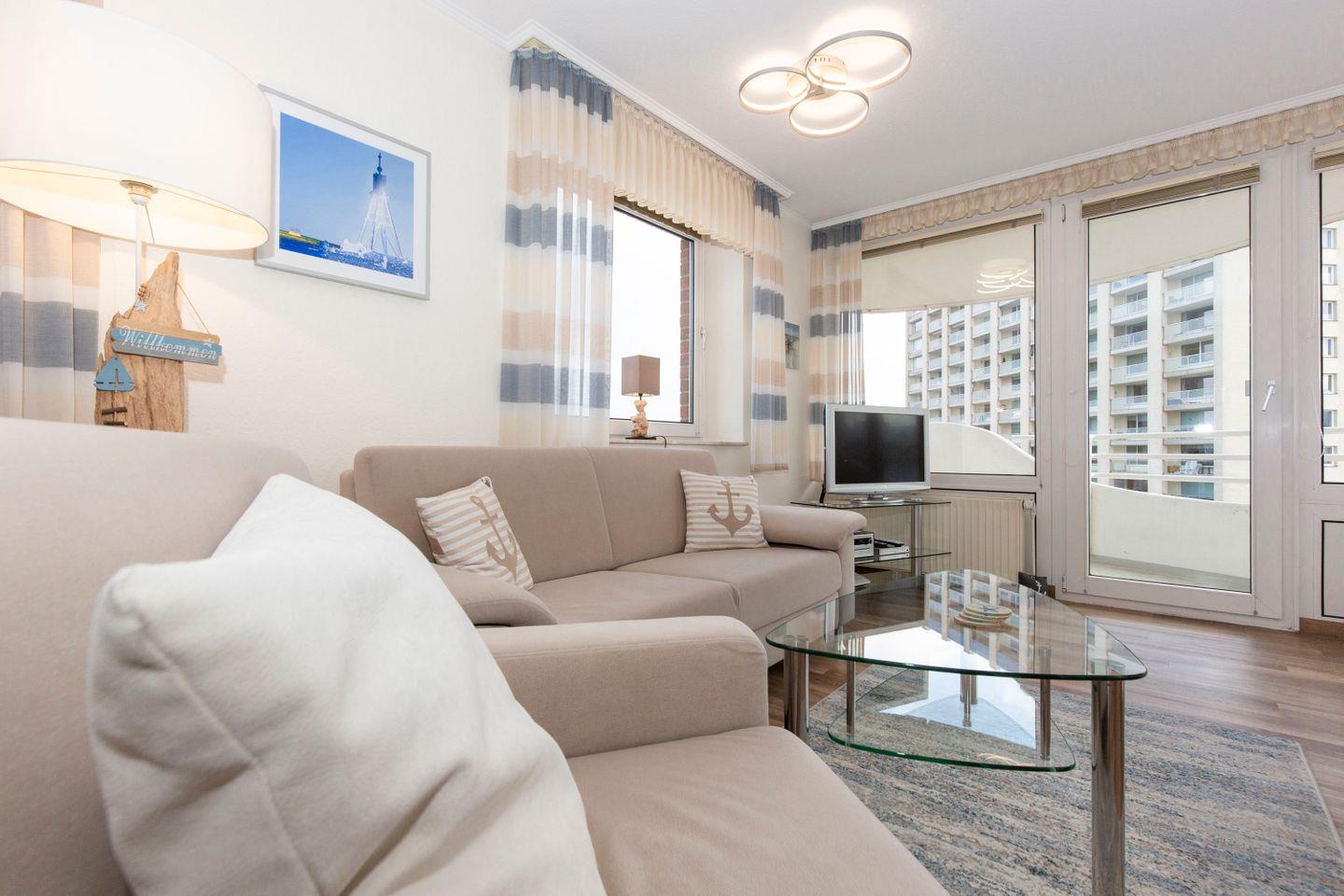 Die hell, modern und maritim eingerichtete Ferienwohnung liegt nur wenige Schritte vom feinen Sandstrand entfernt. Sie ist auf 43 m² für 2 Personen komfortabel ausgestattet mit Wohn-Schlafraum, moderner Küchenzeile mit Geschirrspüler und Mikrowelle, Duschbad/WC und Balkon. Durch mehrere Fenster genießen Sie einen traumhaften Panoramablick aus der 5. Etage auf die Nordsee und den Weltschifffahrtsweg. Durch die Top-Lage der Ferienwohnung können Sie die vorbeifahrenden Schiffe, manchmal auch Kreuzfahrtschiffe, gemütlich von mehreren Plätzen aus beobachten. Der nahegelegene Nordseestrand lädt zu ausgiebigen Wattwanderungen ein. Ganz in der Nähe befinden sich auch die Kugelbake, die das Wahrzeichen von Cuxhaven ist, sowie der Kurpark.
