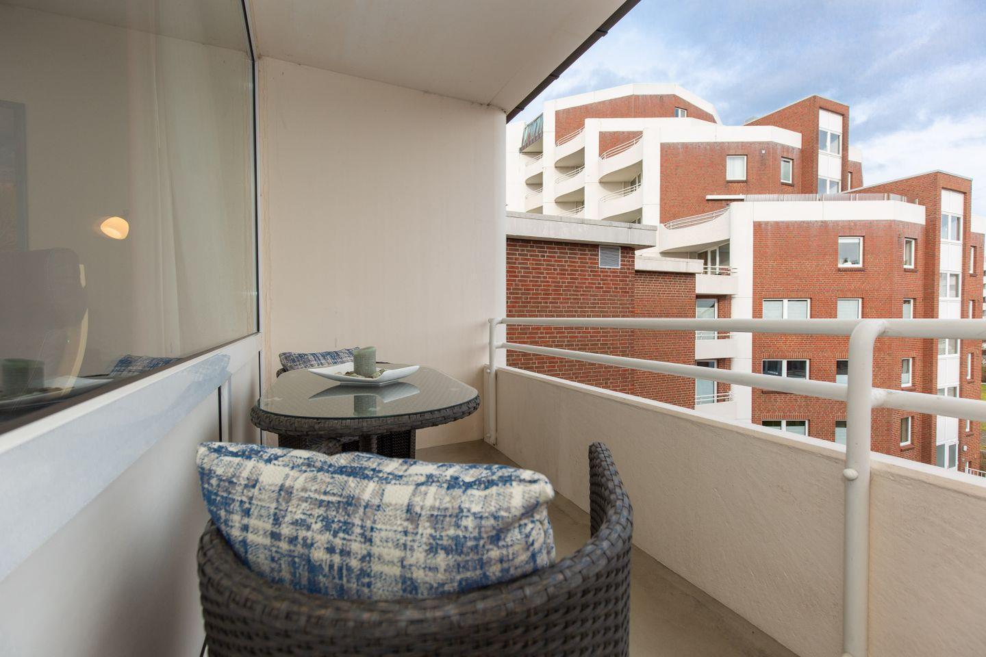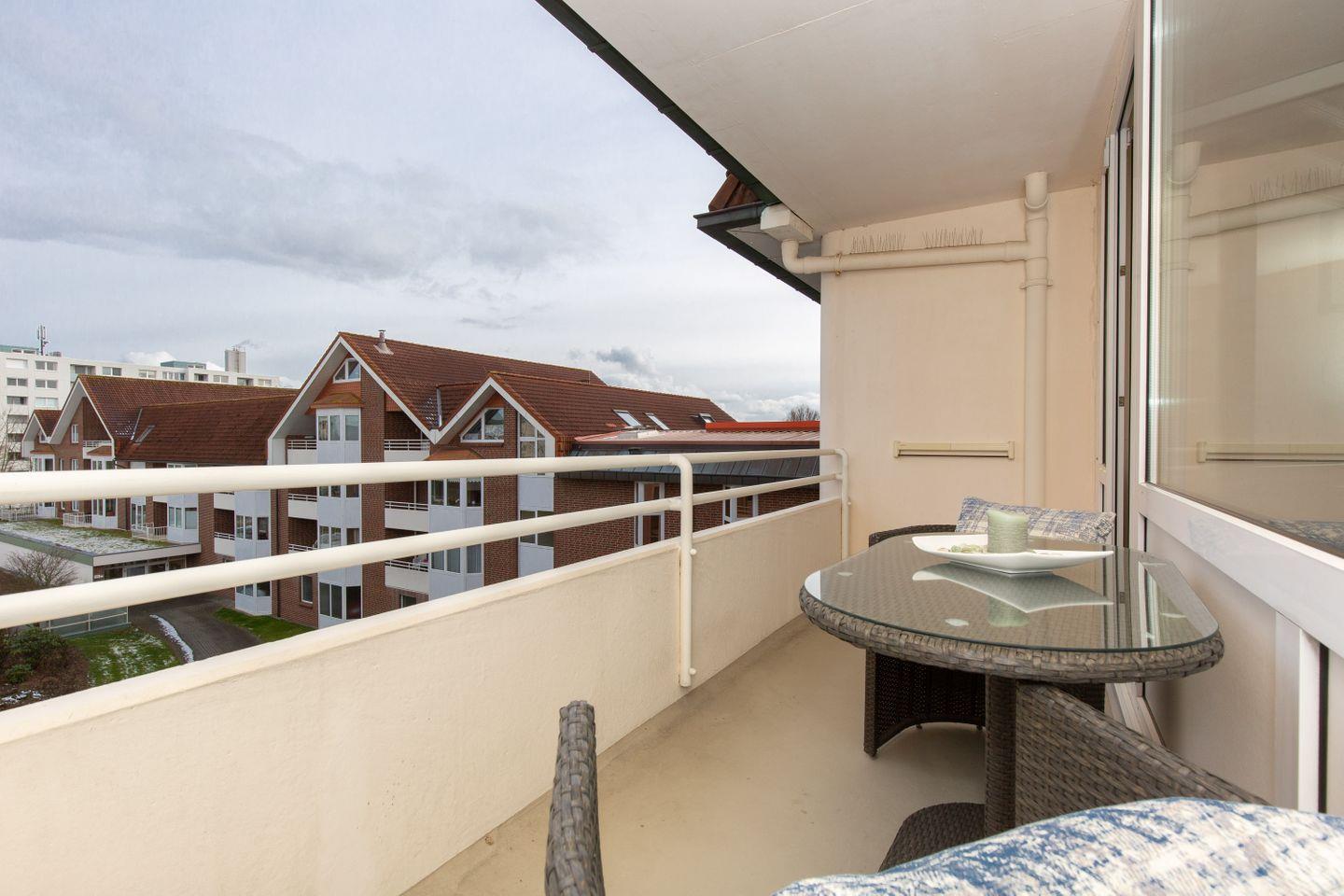 Der Balkon der FeWo ermöglicht entspannte Sonnenbäder an der frischen Nordseeluft. Mit einem Frühstück unter freiem Himmel starten unsere Gäste hier perfekt in den Urlaubstag.