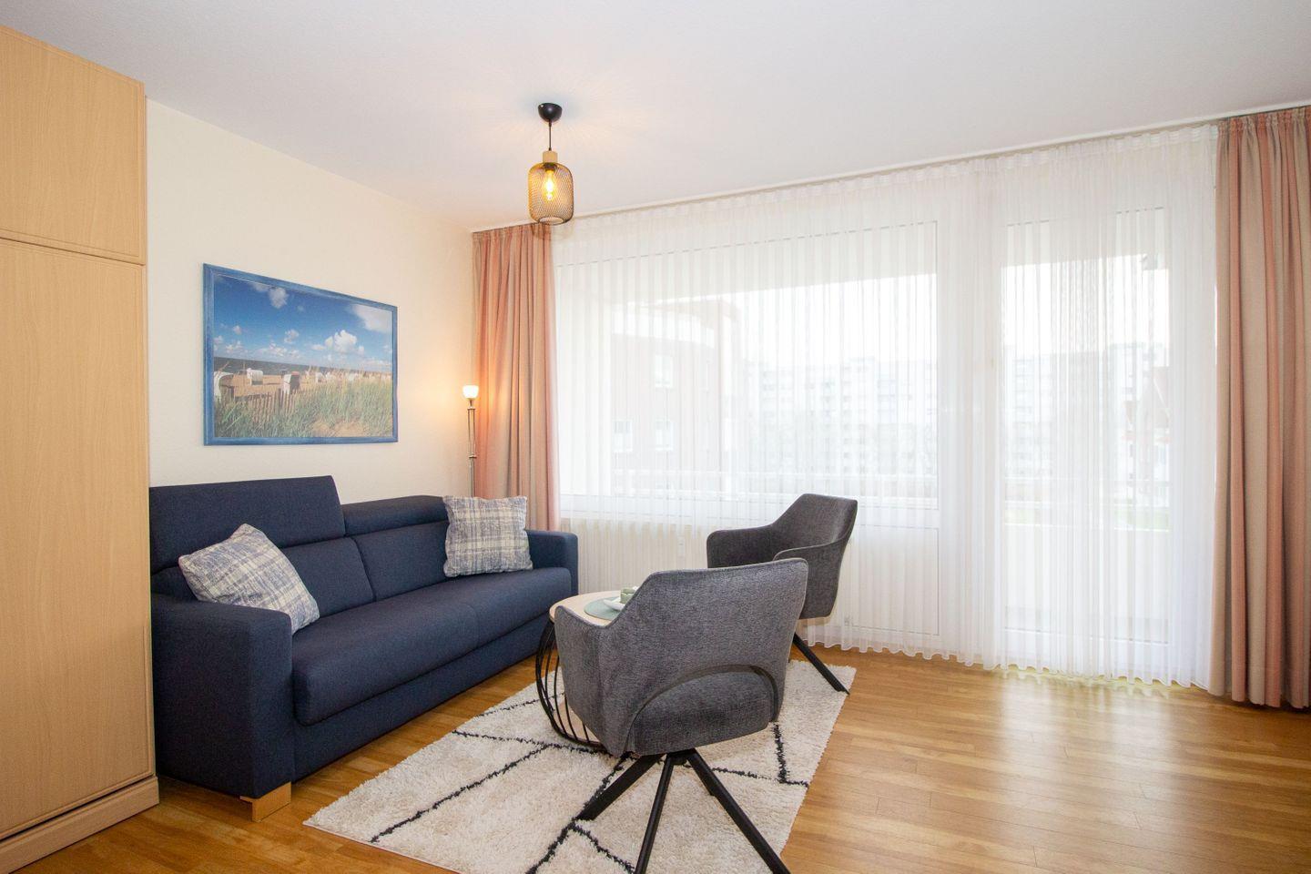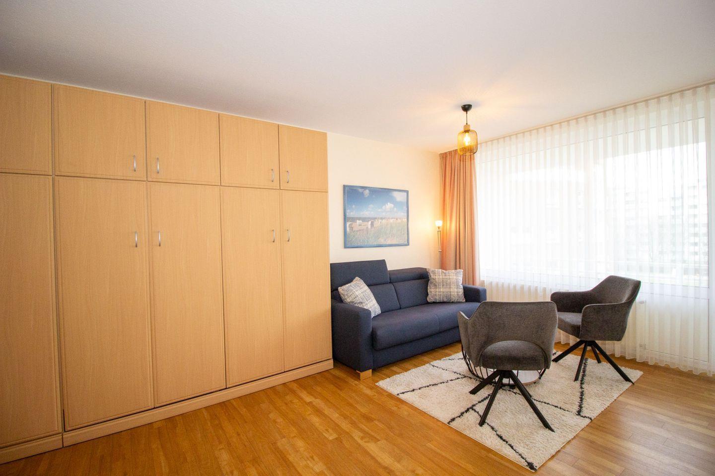 Haus "Trafalgar", Typ A-Ost, Appartement-Nr. 332, bis 4 Pers., 3. Etage, ca.34 qm, Ostseite (ohne Meerblick), Wohn/Schlafbereich mit Schrankbett (einzeln klappbar) und Schlafsofa (140m breit), Küchenzeile mit Mikrowelle, Geschirrspüler, 2 Platten Ceranfeld , Dusche/WC, Balkon, Kabel-TV (Flachbildschirm), W-Lan im App., Tiefgaragenstellplatz, Haustiere sind nicht gestattet, Nichtraucherwohnung, Strandkorb im Sommer 2025, ab 5 Übernachtungen ein Wäschepaket pro Person inkl.