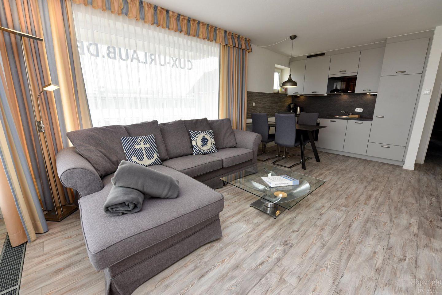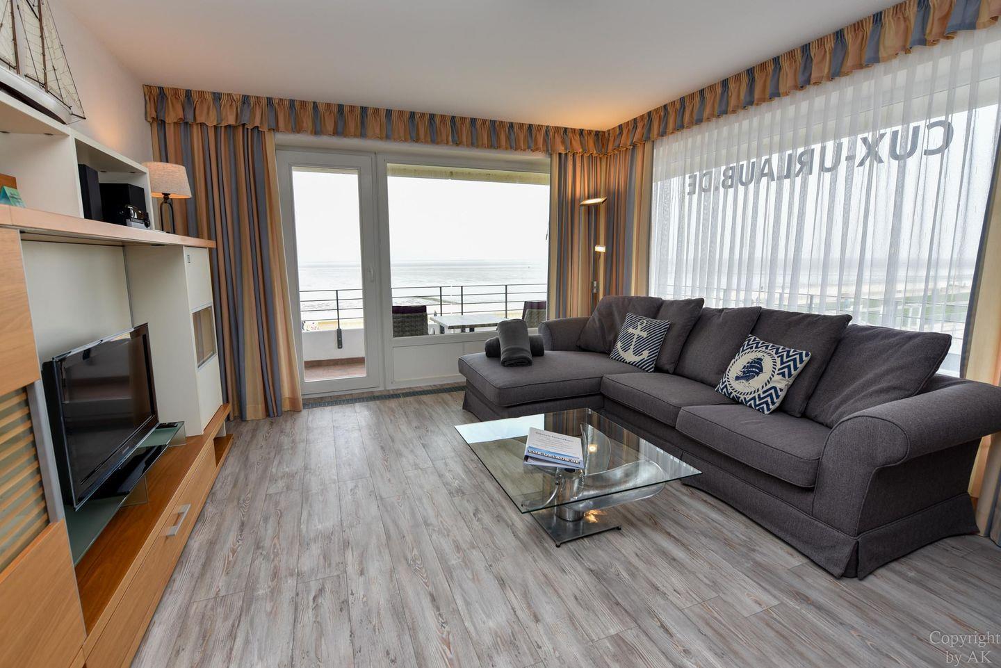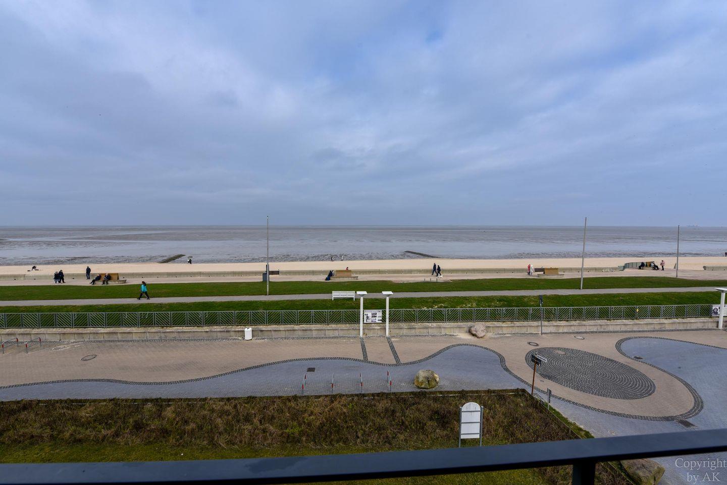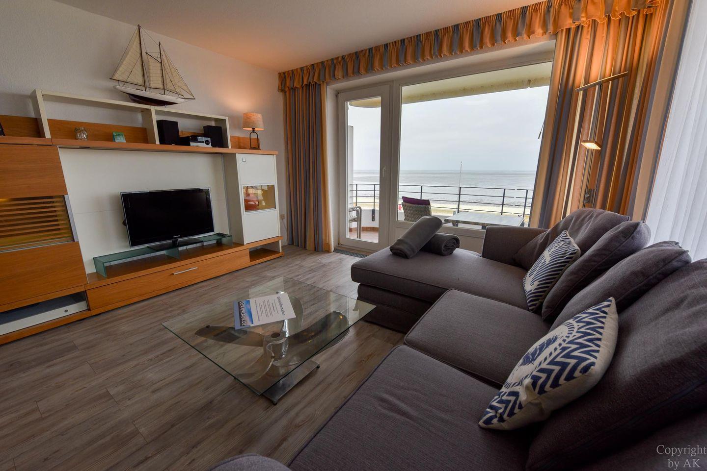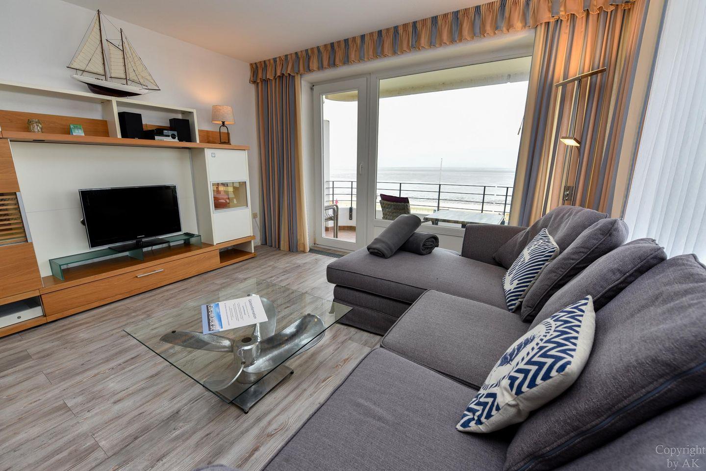 Die Eckwohnung Nr. 24 im Haus NAUTILUS befindet sich im 2. Obergeschoss und verfügt über einen möblierten Balkon mit atemberaubendem Panoramablick auf das UNESCO-Weltnaturerbe Wattenmeer und den Weltschifffahrtsweg. Die großzügig geschnittene Wohnung besteht aus einem Wohnzimmer mit einer voll ausgestatteten Küchenzeile, einem Schlafzimmer mit Doppelbett sowie einem zusätzlichen Zimmer mit einem Etagenbett (Maße: 2x90x200 cm). Das Badezimmer ist mit einer bodentiefen Dusche ausgestattet, und es gibt ein separates WC.