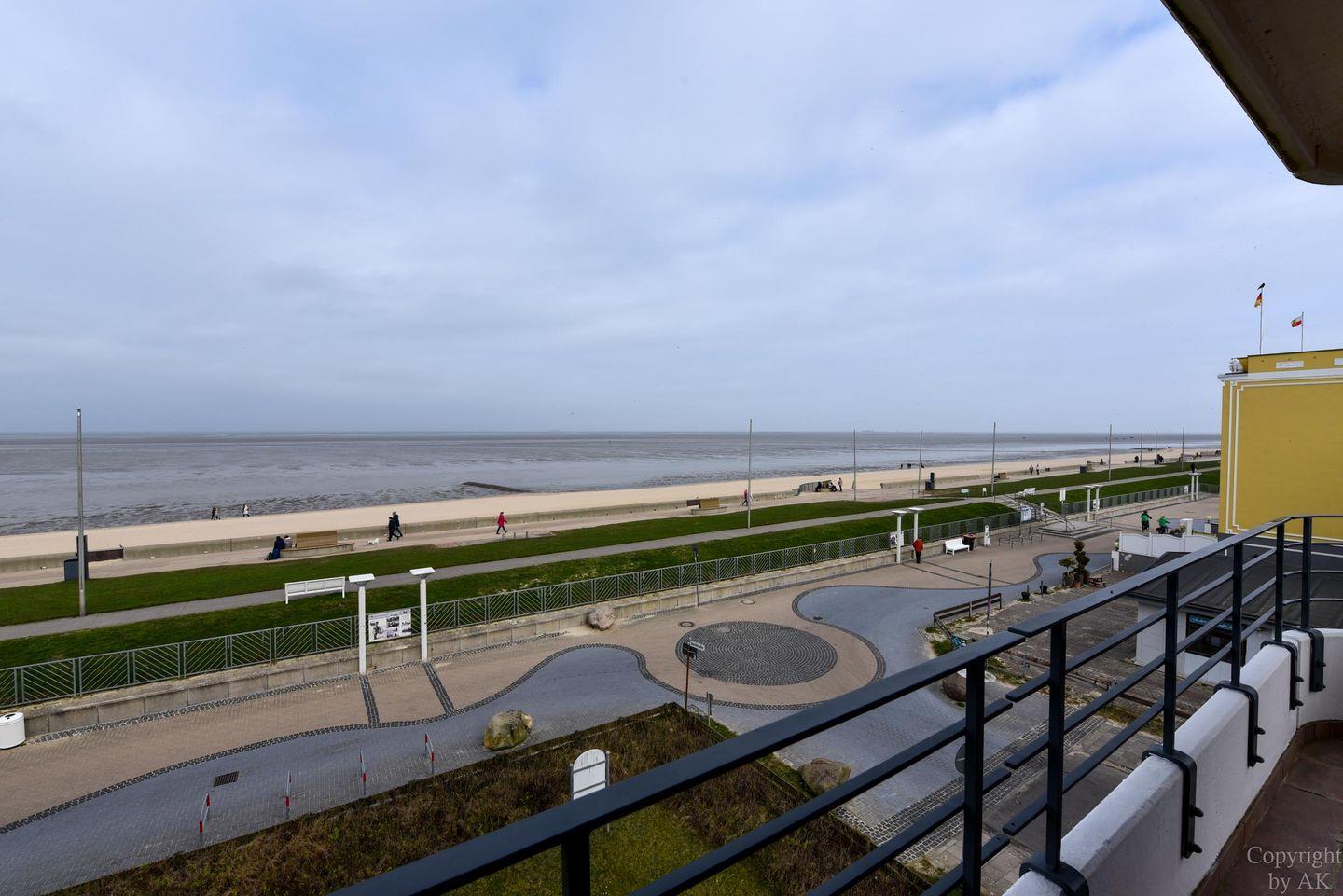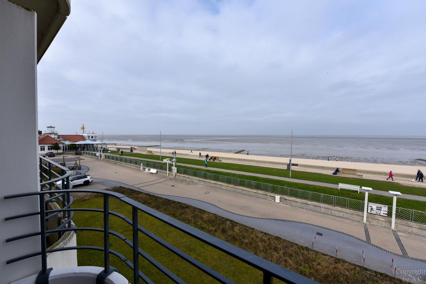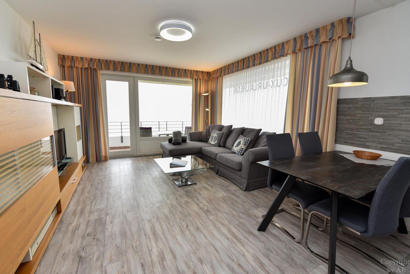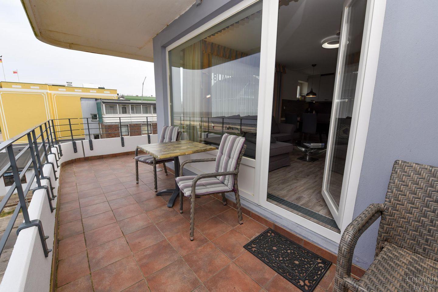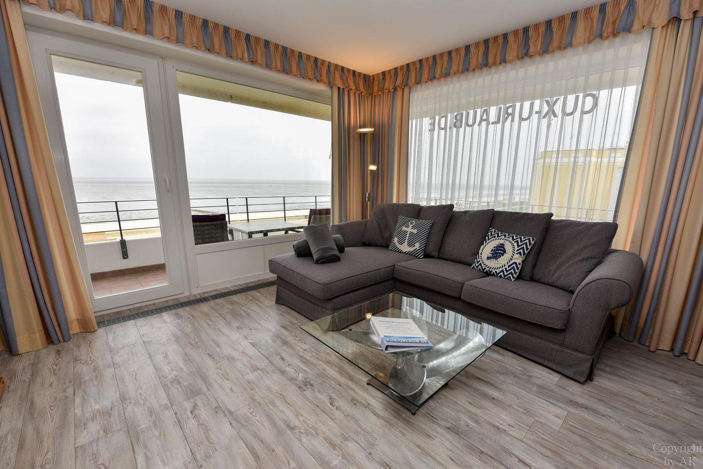Die Eckwohnung Nr. 24 im Haus NAUTILUS befindet sich im 2. Obergeschoss und verfügt über einen möblierten Balkon mit atemberaubendem Panoramablick auf das UNESCO-Weltnaturerbe Wattenmeer und den Weltschifffahrtsweg. Die großzügig geschnittene Wohnung besteht aus einem Wohnzimmer mit einer voll ausgestatteten Küchenzeile, einem Schlafzimmer mit Doppelbett sowie einem zusätzlichen Zimmer mit einem Etagenbett (Maße: 2x90x200 cm). Das Badezimmer ist mit einer bodentiefen Dusche ausgestattet, und es gibt ein separates WC.
