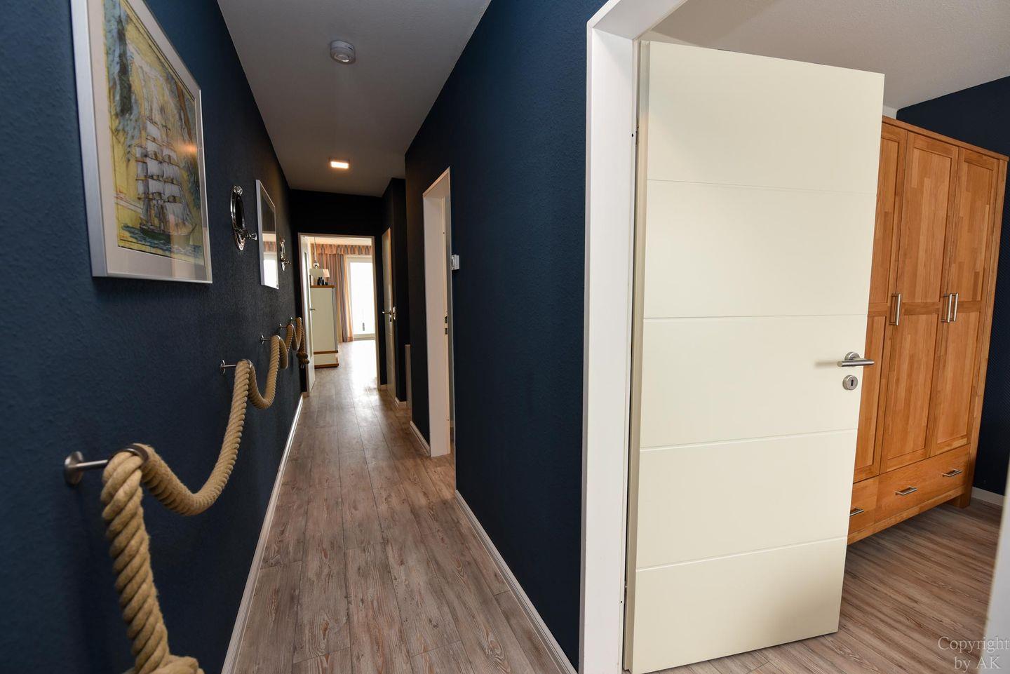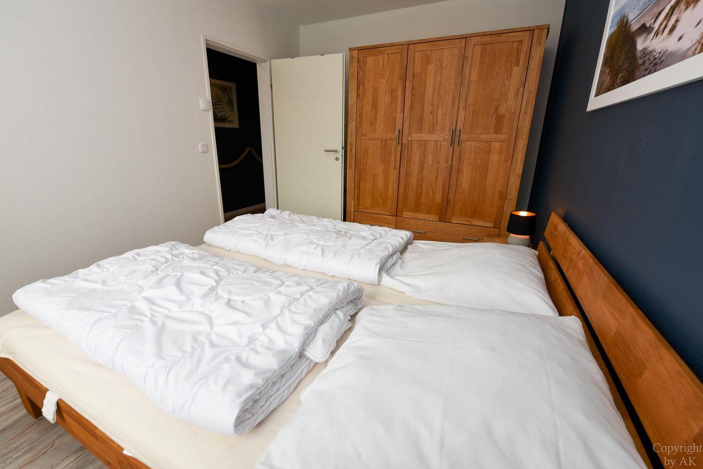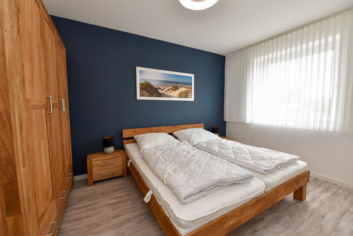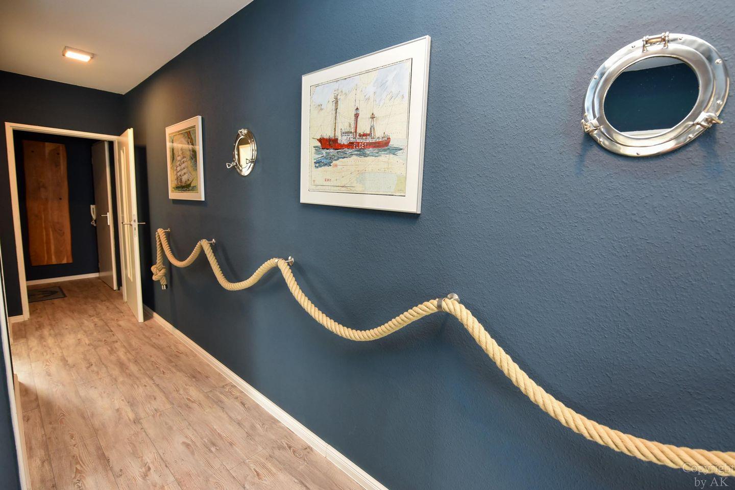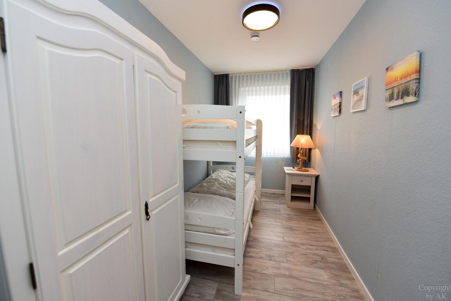 Die Eckwohnung Nr. 24 im Haus NAUTILUS befindet sich im 2. Obergeschoss und verfügt über einen möblierten Balkon mit atemberaubendem Panoramablick auf das UNESCO-Weltnaturerbe Wattenmeer und den Weltschifffahrtsweg. Die großzügig geschnittene Wohnung besteht aus einem Wohnzimmer mit einer voll ausgestatteten Küchenzeile, einem Schlafzimmer mit Doppelbett sowie einem zusätzlichen Zimmer mit einem Etagenbett (Maße: 2x90x200 cm). Das Badezimmer ist mit einer bodentiefen Dusche ausgestattet, und es gibt ein separates WC.