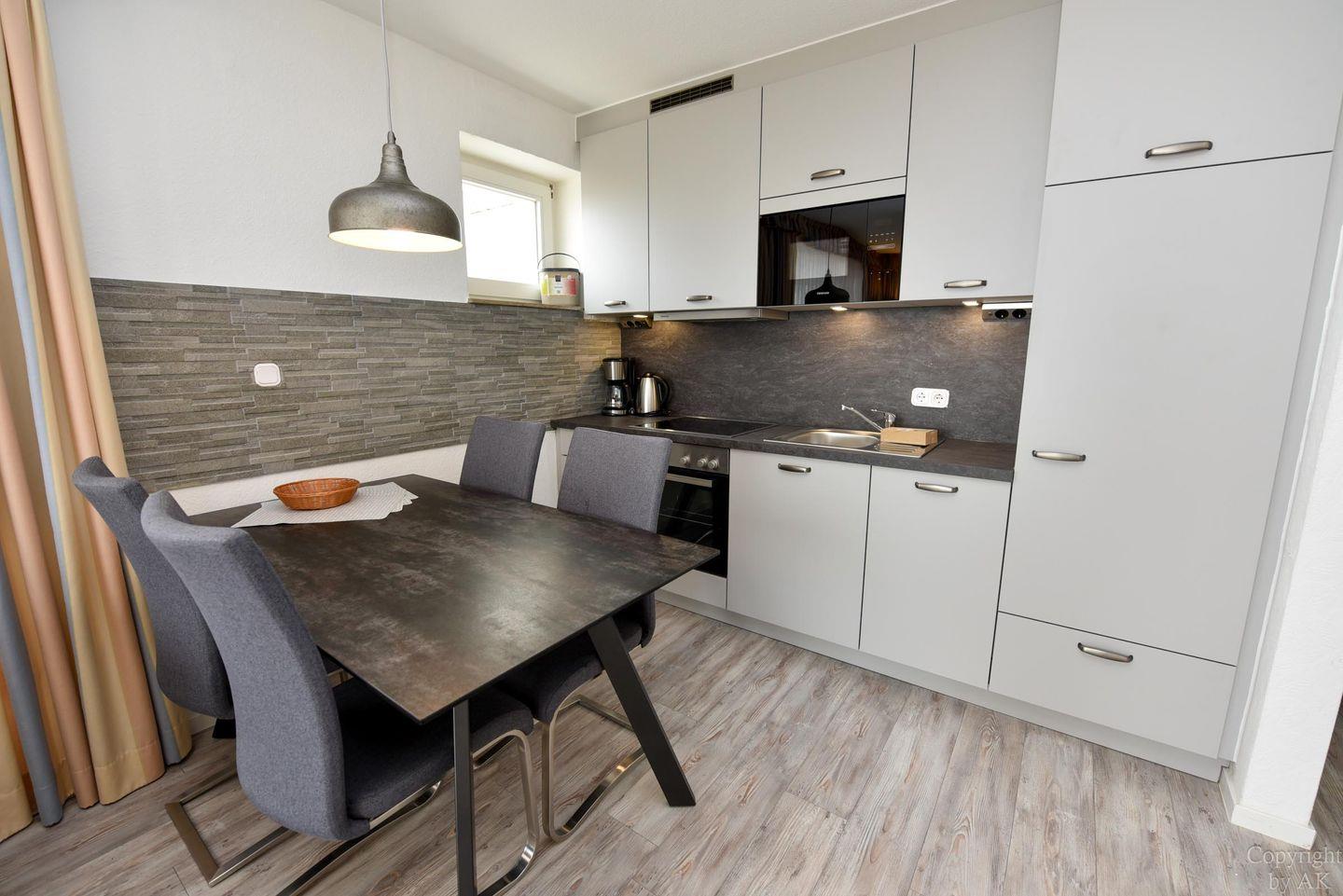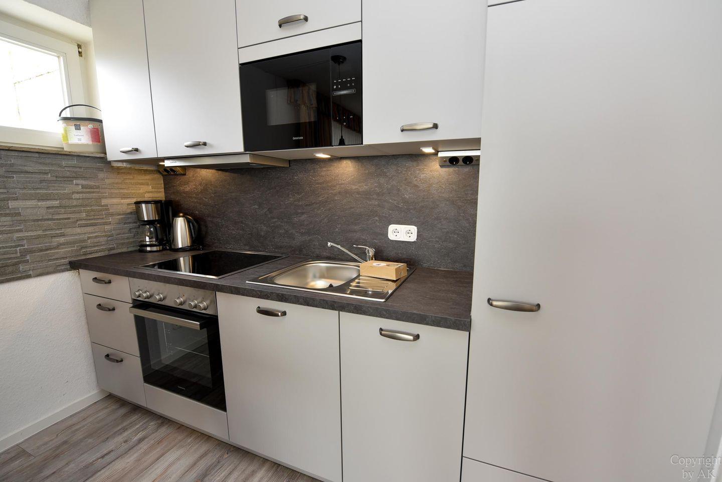 Die Küche bietet eine Vielzahl an Annehmlichkeiten, darunter einen Kühlschrank, einen Gefrierschrank, einen Elektroherd mit Cerankochfeld, einen Geschirrspüler, eine Kaffeemaschine, einen Wasserkocher, einen Toaster und eine Mikrowelle.