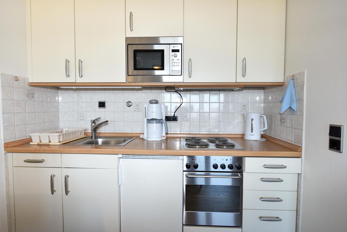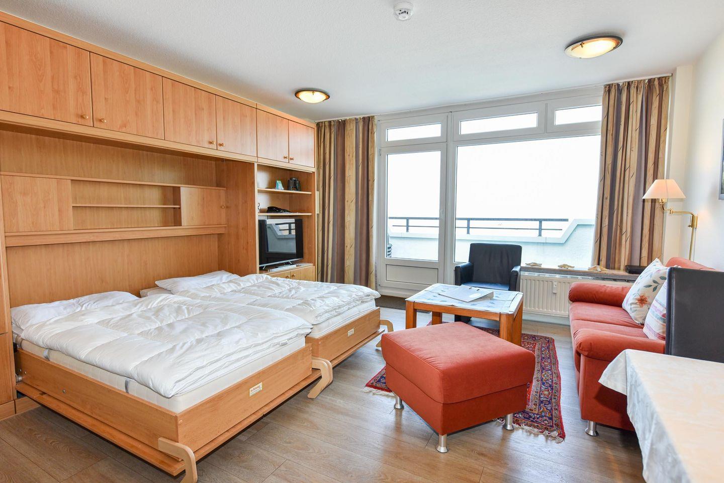 1 Wohn-/Schlafraum mit 2 Schrankklappbetten; Küchenzeile mit Kühlschrank, Kaffeemaschine, E-Herd; Flachbildfernseher vorhanden; Bad mit Dusche und WC; Pkw-Tiefgaragenstellplatz. Lage: 2. Etage mit Balkon, direkte Seesicht
