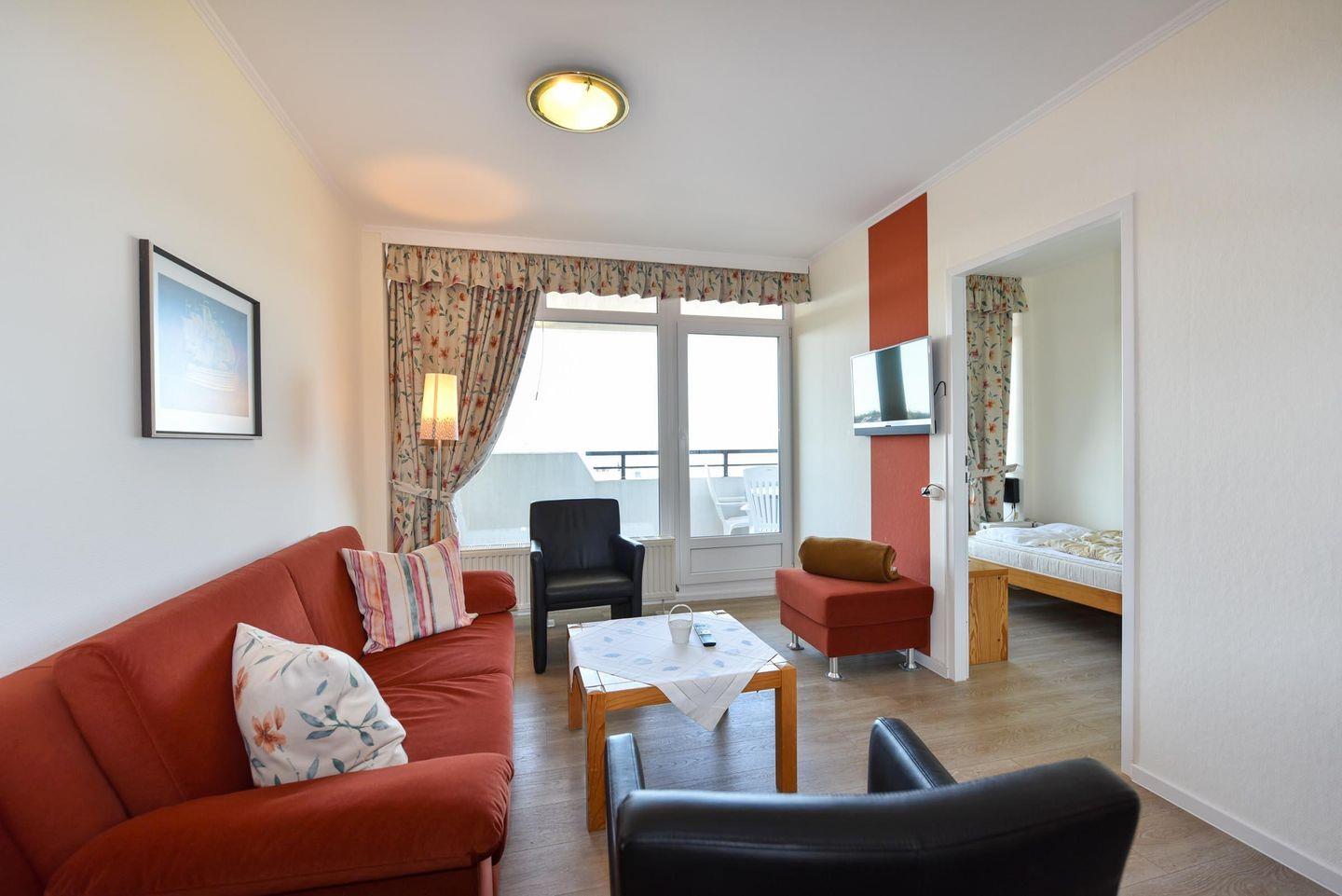 Die charmante Wohnung Nr. 99 erwartet Sie im 7. Stock des Haus Panorama und bietet einen atemberaubenden Blick auf die Nordsee in Richtung der Insel Neuwerk.