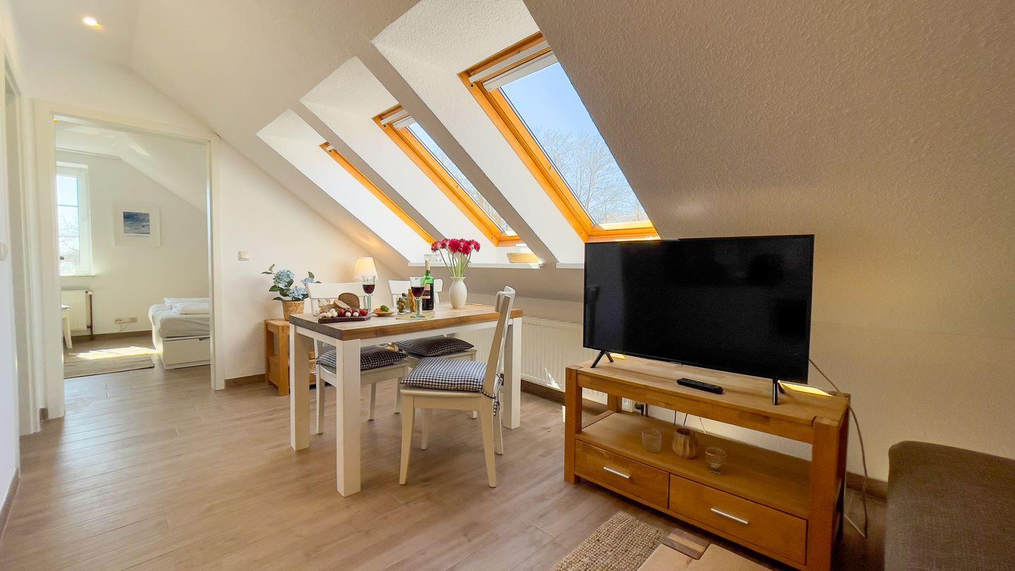 Mit einer Fläche von 40 m² bietet die Ferienwohnung Platz für bis zu vier Personen. Sie befindet sich im ersten Stock eines freistehenden Hauses und empfängt Sie mit einer einladenden Atmosphäre. Im Wohnbereich finden Sie ein komfortables Schlafsofa, das zum Verweilen einlädt, sowie einen Esstisch für gemeinsame Mahlzeiten.