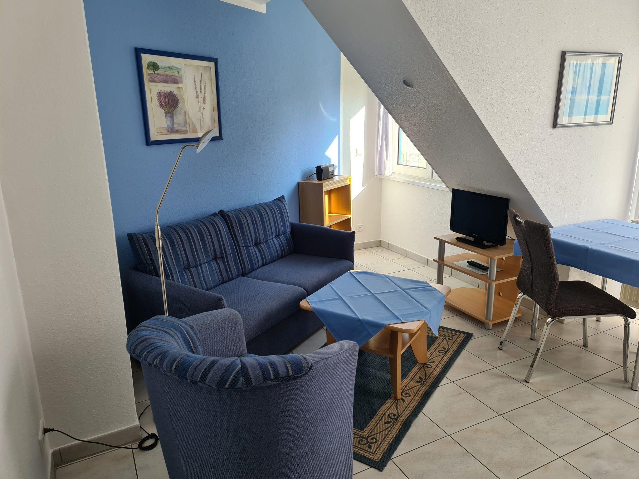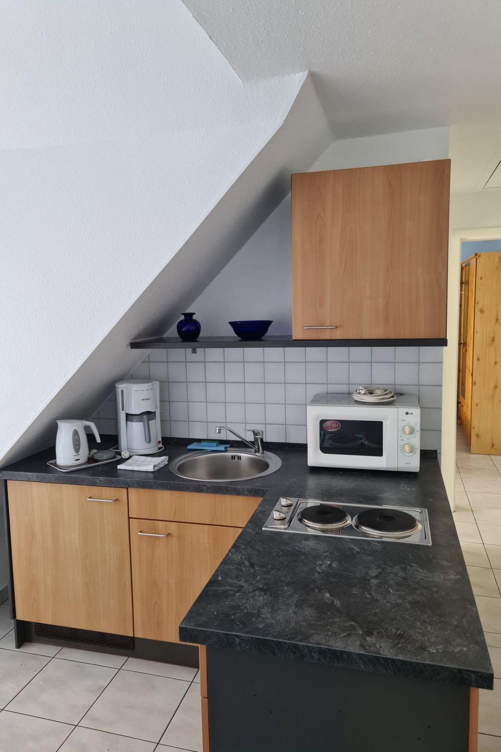 This is a lovely 38m² two-room apartment on the first floor, with some sloped ceilings on one side, fully-equipped and furnished for up to three people. It provides a bedroom with a double bed, a combined living room and bedroom with a sofa bed, a kitchen unit with two rings, a microwave, cable TV, a shower and WC, a balcony, a hallway, tiled throughout and suitable for allergy sufferers.
