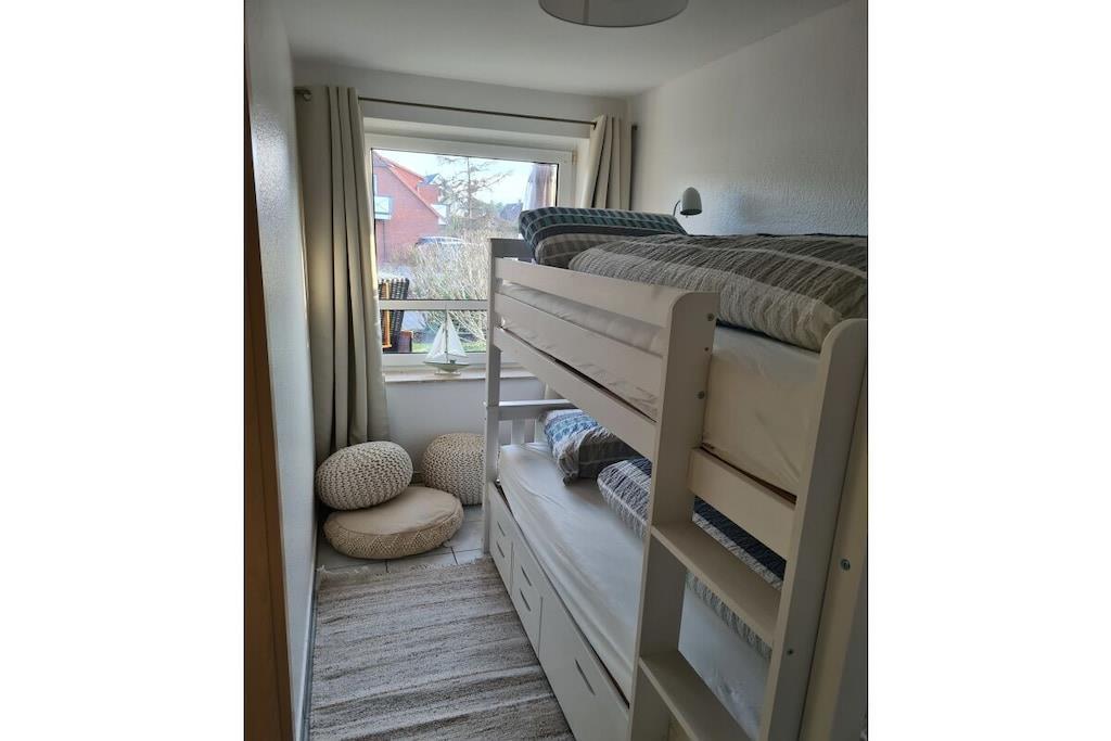 Vår lille, men koselige ferieleilighet har tre rom. I tillegg til den store stuen med tilstøtende kjøkken, er det to soverom. Ett romslig soverom er møblert med en stor dobbeltseng, mens det mindre soverommet har en køyeseng med to senger, perfekt for to barn. Badet er utstyrt med en romslig dusj. Når været tillater det, kan måltidene nytes ute på terrassen. En strandstol og en liten hage inviterer deg også til å slappe av. Hunder er velkomne mot et lite rengjøringsgebyr og vil finne et komfortabelt sted å sove i stuen.