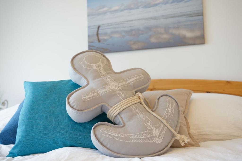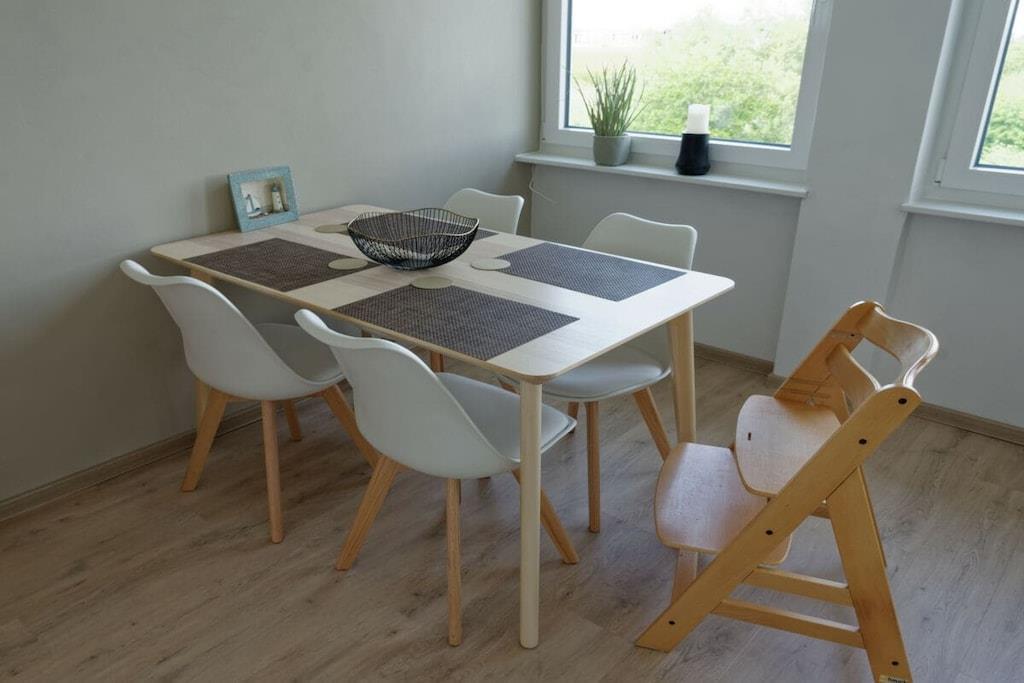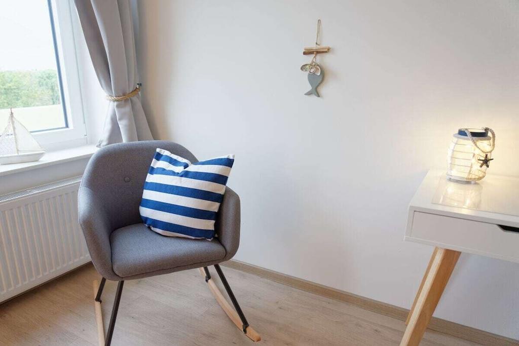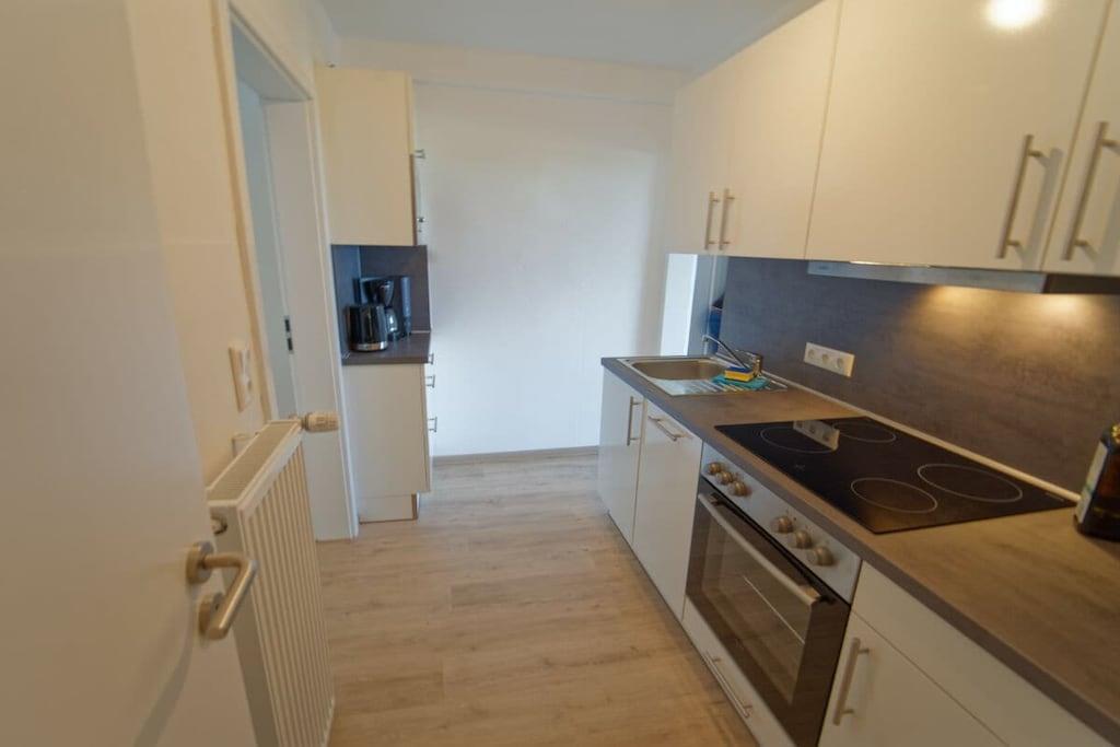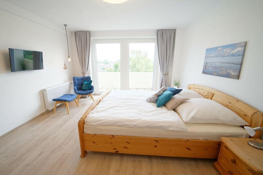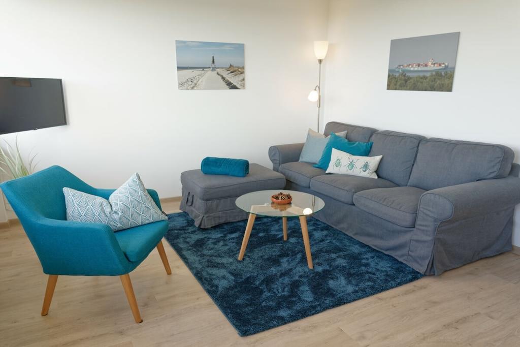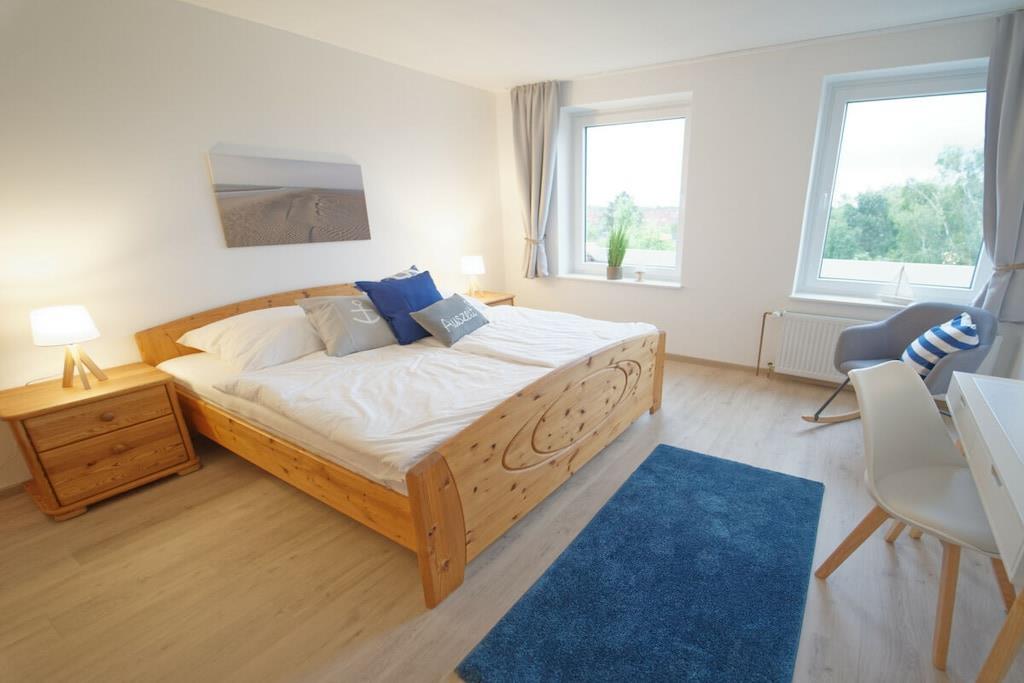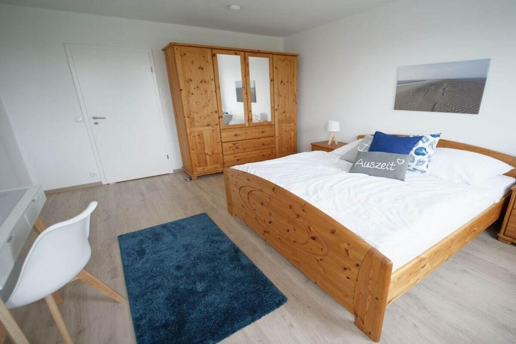 Nyt en avslappende ferie i vår kjærlig møblerte leilighet med eksepsjonell havutsikt. Vår lyse ferieleilighet (81 m², 3. etasje) i moderne landlig stil ligger rett bak diket (200 m til stranden) og tilbyr god plass til 4 personer og en baby/småbarn. Barneseng og barnestol er tilgjengelig. Leiligheten har to romslige soverom, begge med dobbeltseng, samt en stue og spisestue med panoramautsikt over Nordsjøen og den internasjonale skipsruten. Badet med dusj/toalett inkluderer også vaskemaskin. Det moderne og fullt utstyrte kjøkkenet tilbyr all komfort, inkludert keramisk koketopp, stekeovn, mikrobølgeovn, oppvaskmaskin og kjøleskap med fryseboks. Den solrike sørvendte balkongen har en fantastisk utsikt over det omkringliggende grøntområdet. Gratis Wi-Fi. To LG Smart-TV-er lar deg se favorittprogrammene dine med Netflix- eller Amazon-kontoen din (osv.). Gratis parkering er tilgjengelig rett foran bygningen. Utleiekontoret ligger i bygningen. Vær oppmerksom på at det ikke er heis.