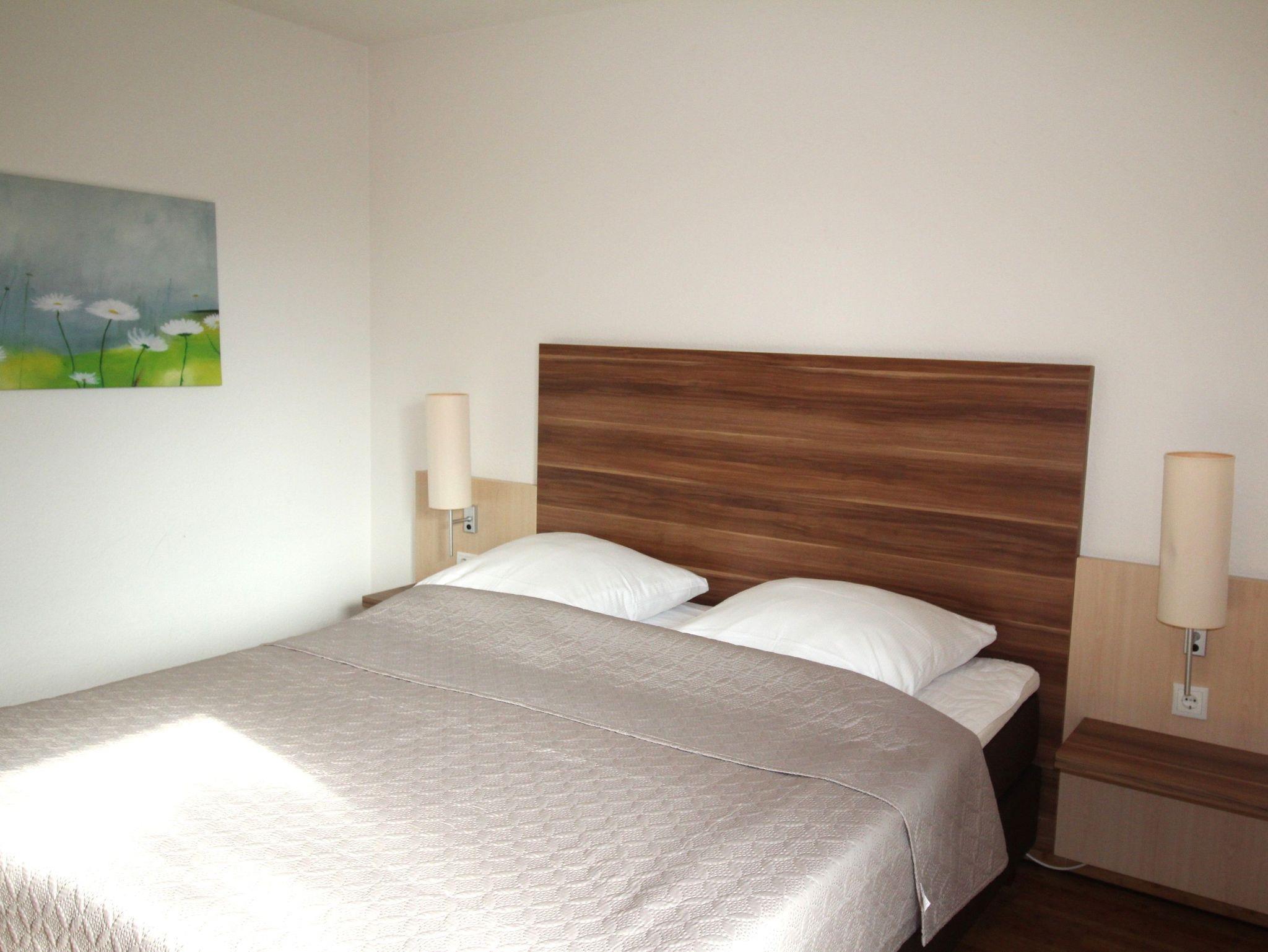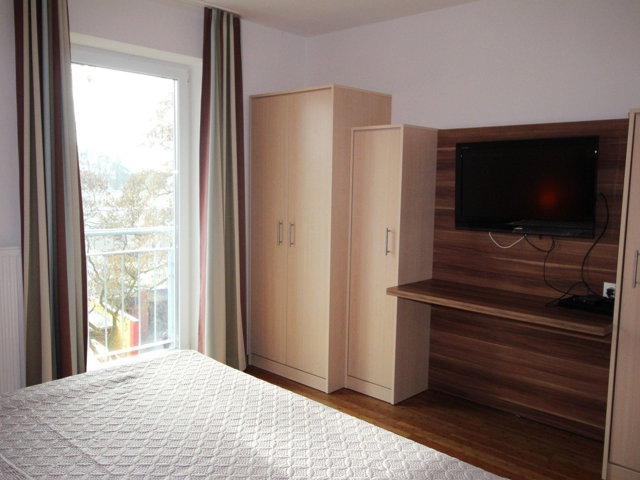 Doppelbett (180 x 200 cm), Schrankwand mit integrierter Schreibtischplatte, zweiter Flachbildfernseher (32 Zoll) u. Blu-Ray-Player,