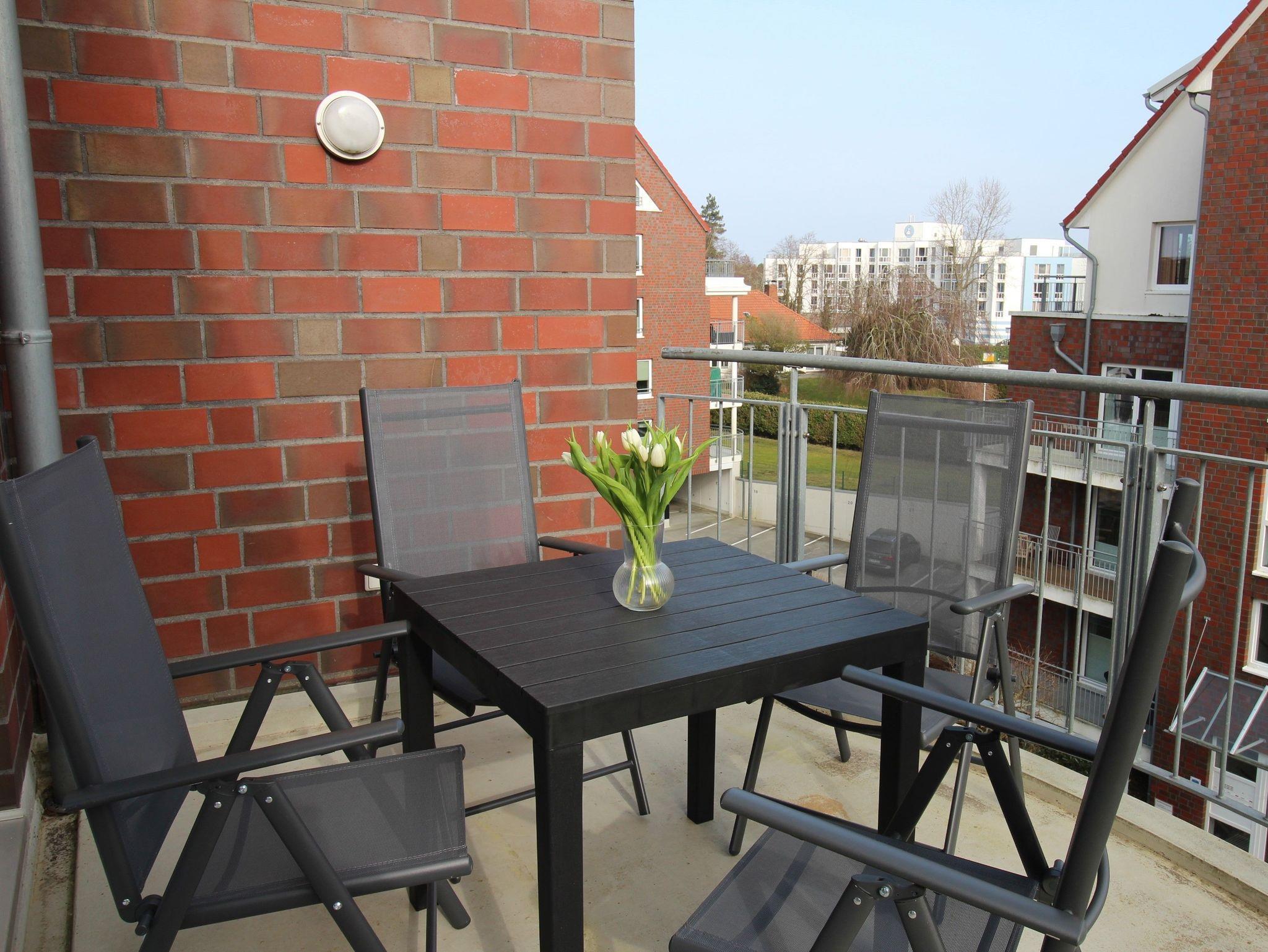 Aufdem großen Balkon (8 m²) befindet sich eine bequeme Sitzgruppe. Hier können Sie beim Frühstück die Morgensonne genießen. Sonnenliege u. Elektro-Tischgrill sind ebenfalls vorhanden.