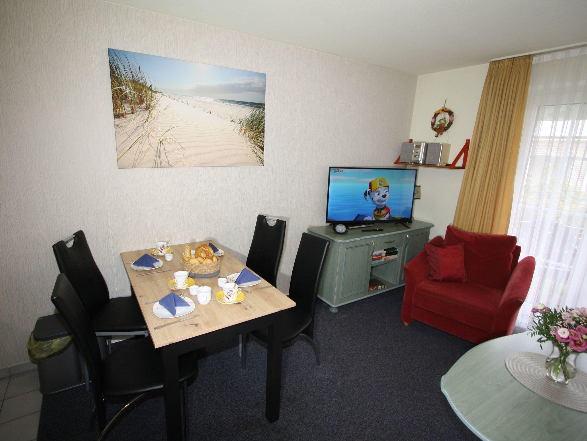 Sie wohnen in einem 3-Zimmer-Appartement für bis zu 6 Personen auf ca. 50 m² im Erdgeschoss. Ein Schlafzimmer mit Doppelbett, ein Schlafzimmer mit Etagenbett, ein Wohn-/Schlafraum mit bequemer Doppelbettcouch, separater Essplatz, voll ausgestatteter Küchenbereich mit Backofen, Geschirrspüler und Mikrowelle, großer Kühlschrank mit sep. 40 l Gefrierfach, Dusche/WC, Balkon, ULTRA HD LCD-TV.