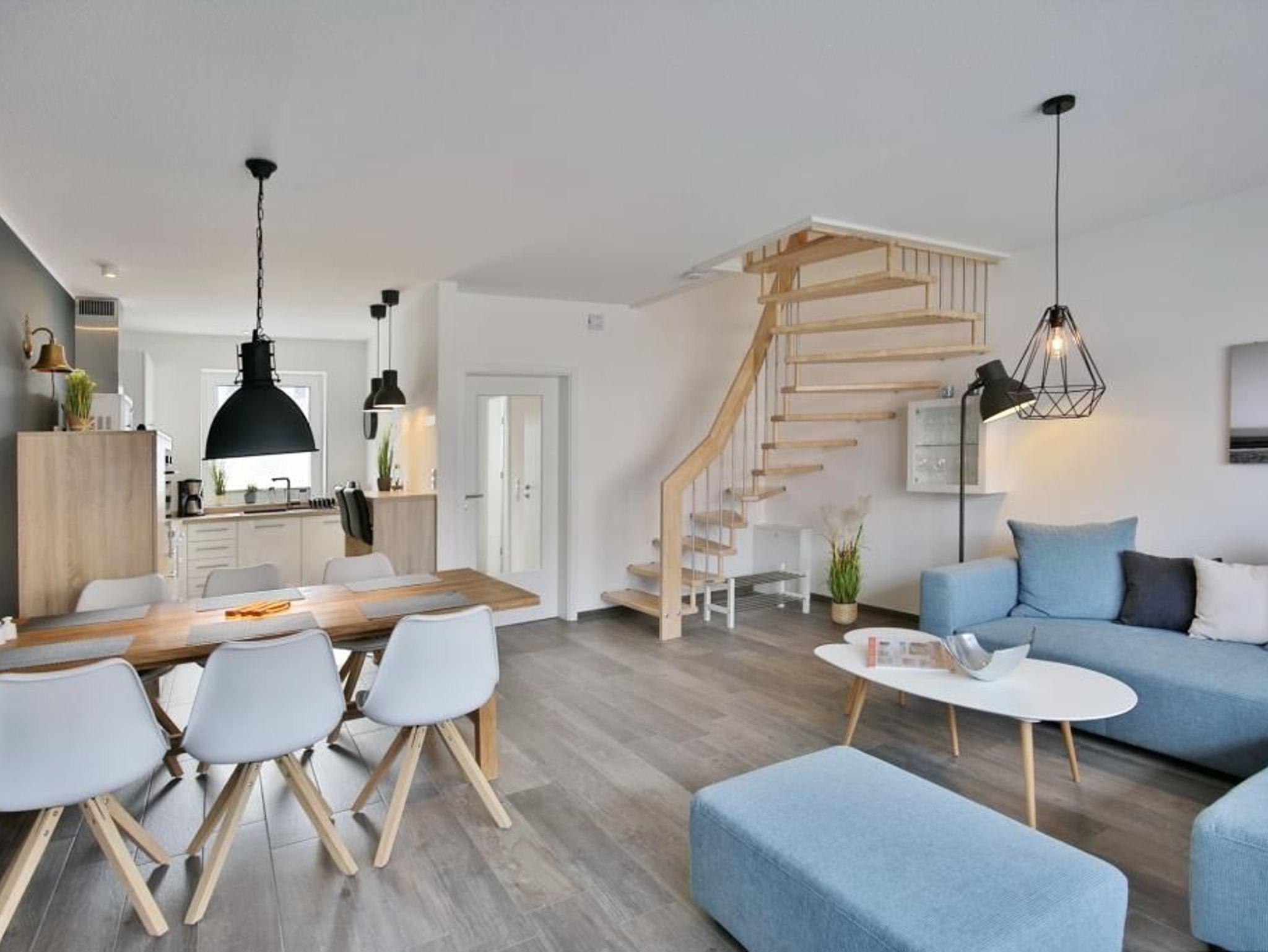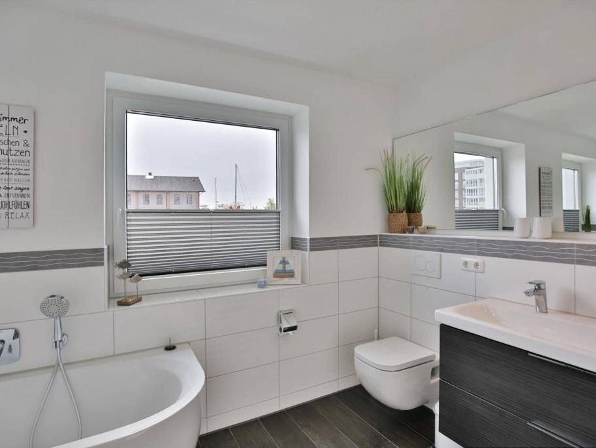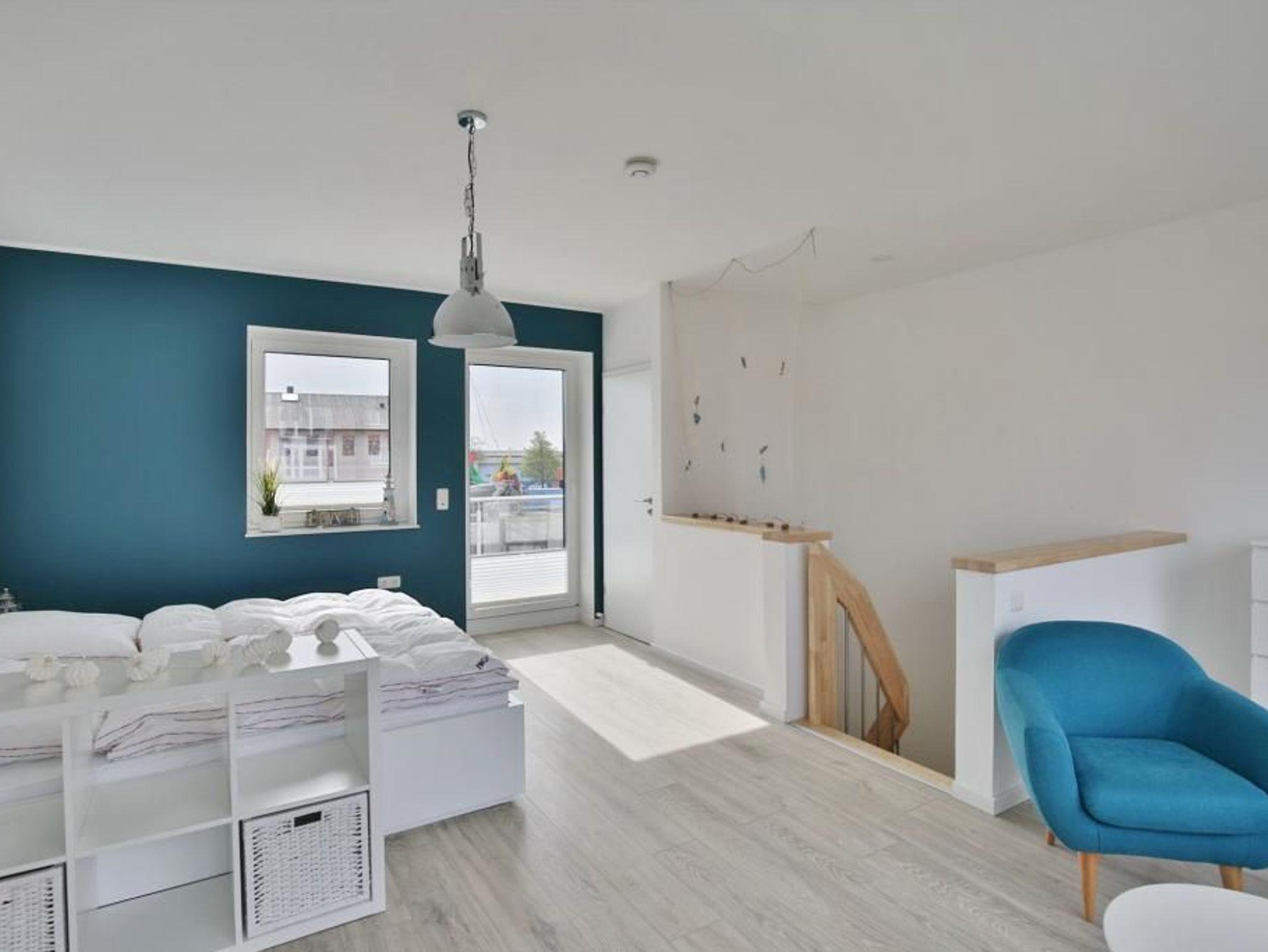 Geschmackvolles, modernes Stadthaus im Yachthafen für bis zu 6 Pers. auf 3 Etagen mit absoluter Vollausstattung. Großzügiges Wohnzimmer mit offener Küchenzeile (Backofen, Geschirrspüler, Waschmaschine, Nespresso Kaffeemaschine etc.) mit Tresen, große Terrasse (west) mit Blick in die City Marina, Kabel-TV, Gäste/WC. 1.OG: 2 komfortable Schlafzimmer mit Doppelbetten und jeweils mit TV, großes Bad/Du/WC, Föhn, 2.OG: Großzügige Lounge mit Doppelbett, TV, große Dachterrasse (west) [&] Balkon (ost), Abstellraum mit Waschmaschine [&] Trockner. Kostenfreies W-Lan im ganzen Haus. Privater Fahrradschuppen, 1 PKW-Stellplatz am Haus.