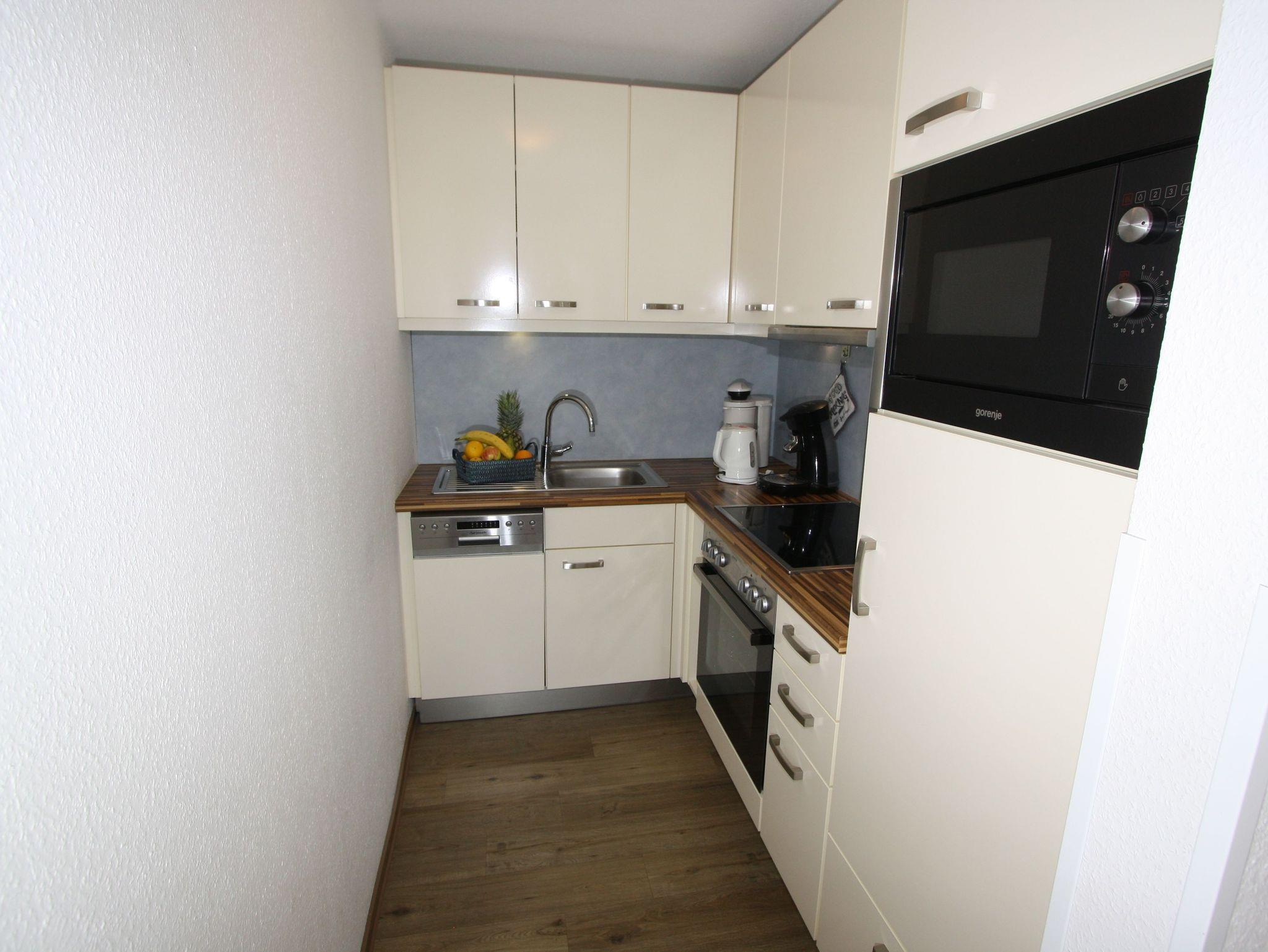 voll ausgestatteter Küchenbereich mit Geschirrspüler, Mikrowelle und Senseo-Kaffeemaschine,