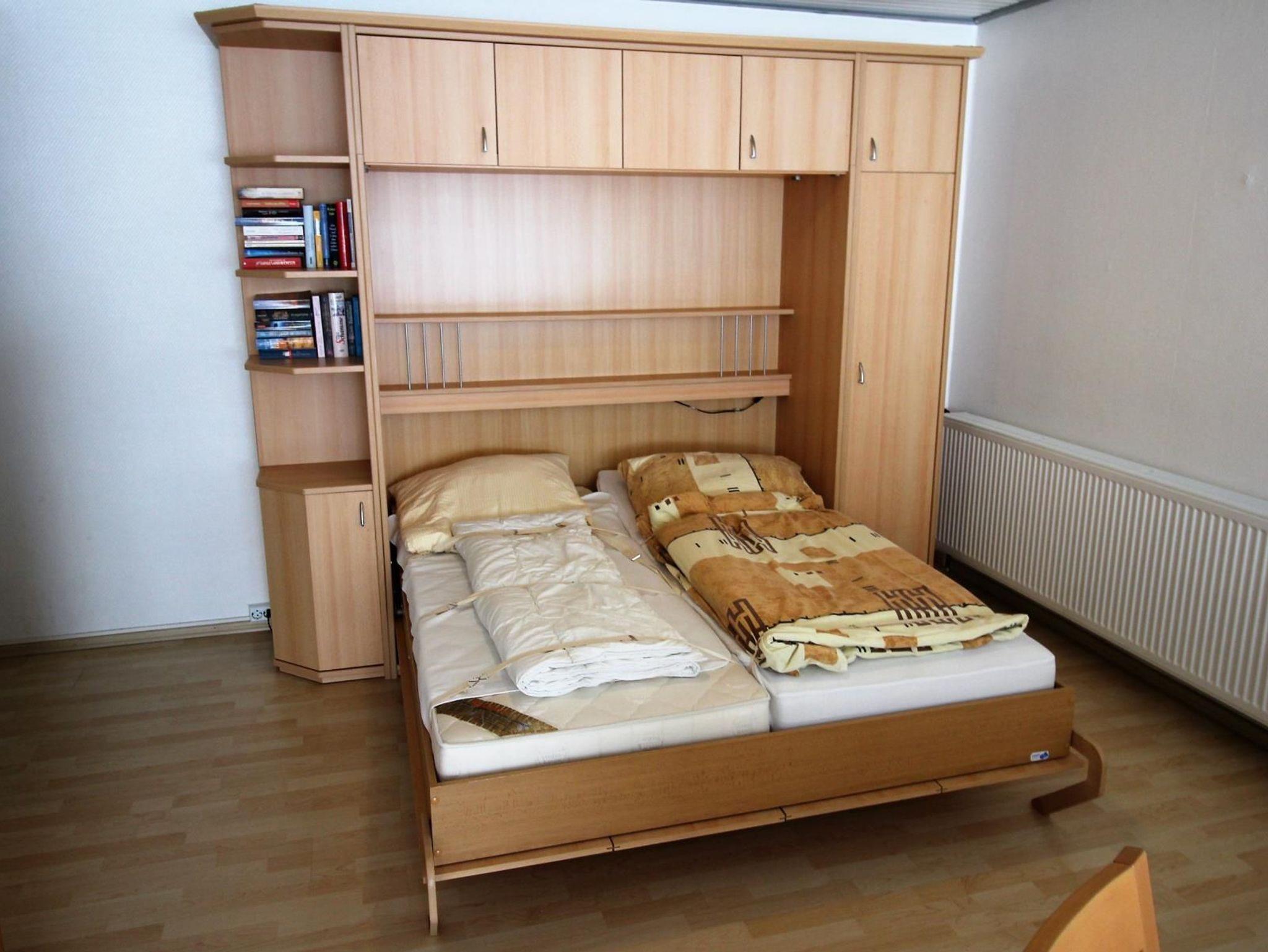 Sie wohnen in einer 2-Zimmer-Ferienwohnung mit Wohnraum und offener, voll ausgestatteter Kuche und einem Schrankbett fur bis zu 2 Personen, einem Schlafzimmer mit Doppelbett, Badezimmer und Balkon.