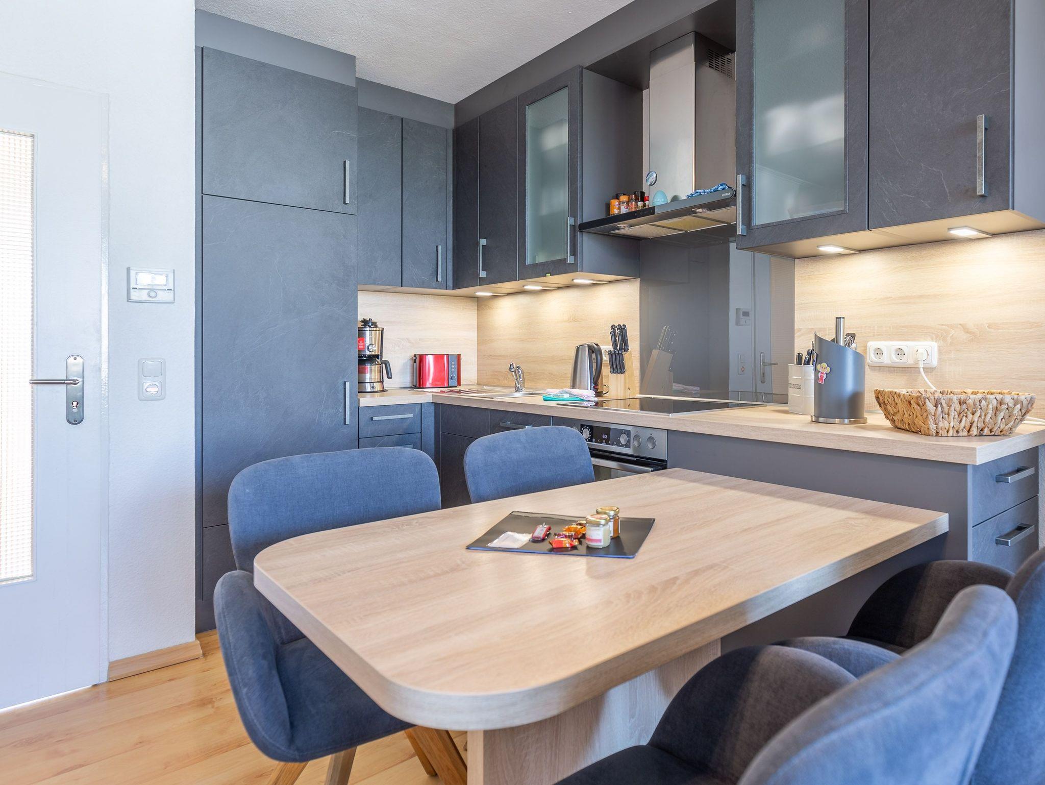 Die großzügige Küche ist vollständig mit Backofen, Geschirrspüler sowie Kühlschrank mit Gefrierfach ausgestattet und lässt für Selbstversorger keine Wünsche offen. Ein LCD-Fernseher gewährleistet, dass Sie im Urlaub nicht auf Ihre Lieblingsserie verzichten müssen. Ferienwohnung Nautic 205 ist mit elektrischen Außenjalousien ausgestattet, sodass Sie nicht von der Morgensonne geweckt werden. Der kombinierte Wohn- und Schlafbereich ist mit einem Schlafsofa ausgestattet. Ein Einzelbett im Vorraum ermöglicht getrenntes Schlafen.