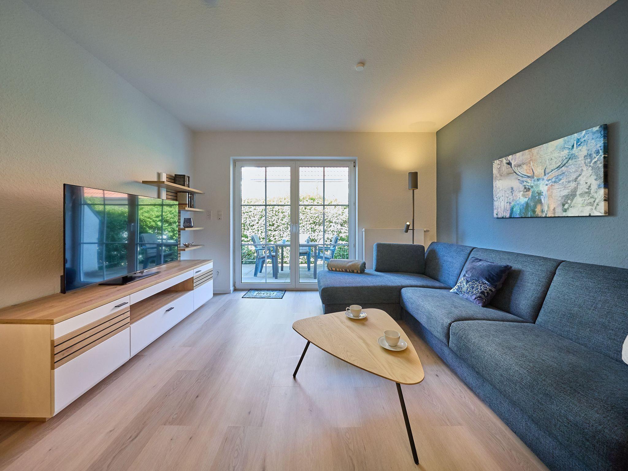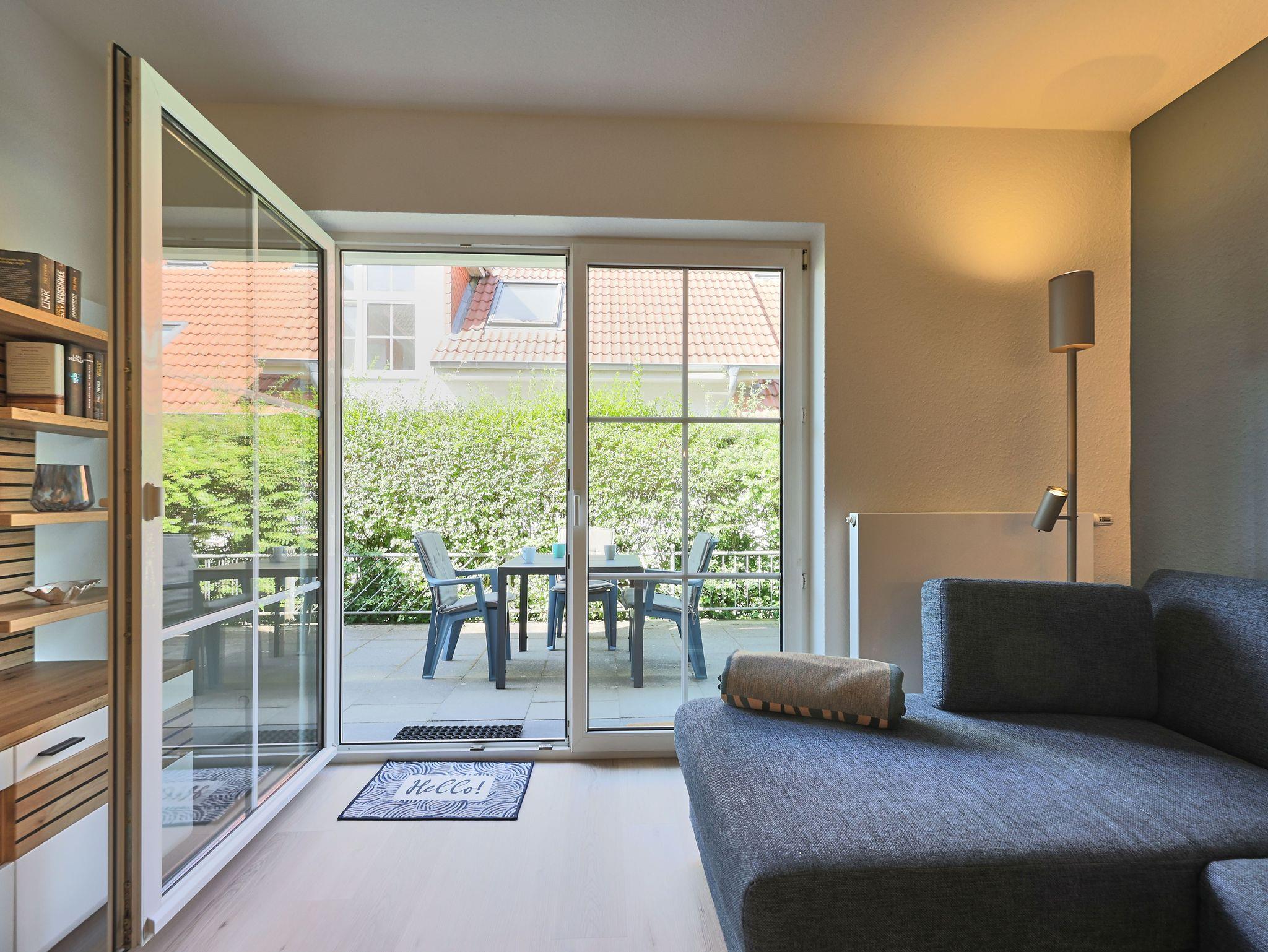 Wohnbereich mit Schlafsofa und Zugang zur sonnigen Terrasse