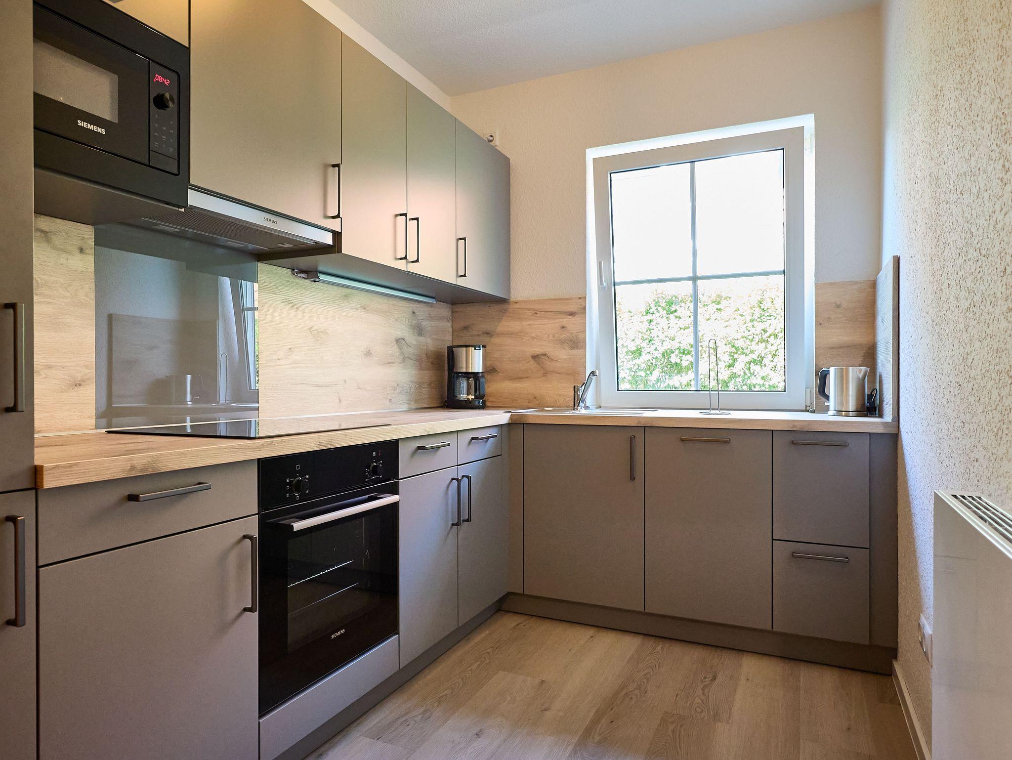 Die Küche ist mit Induktionskochfeld, Backofen, Mikrowelle und Geschirrspüler hochwertig ausgestattet. Hier können Sie Ihre Mahlzeiten zubereiten und auf der 15 qm großen Sonnenterasse genießen.