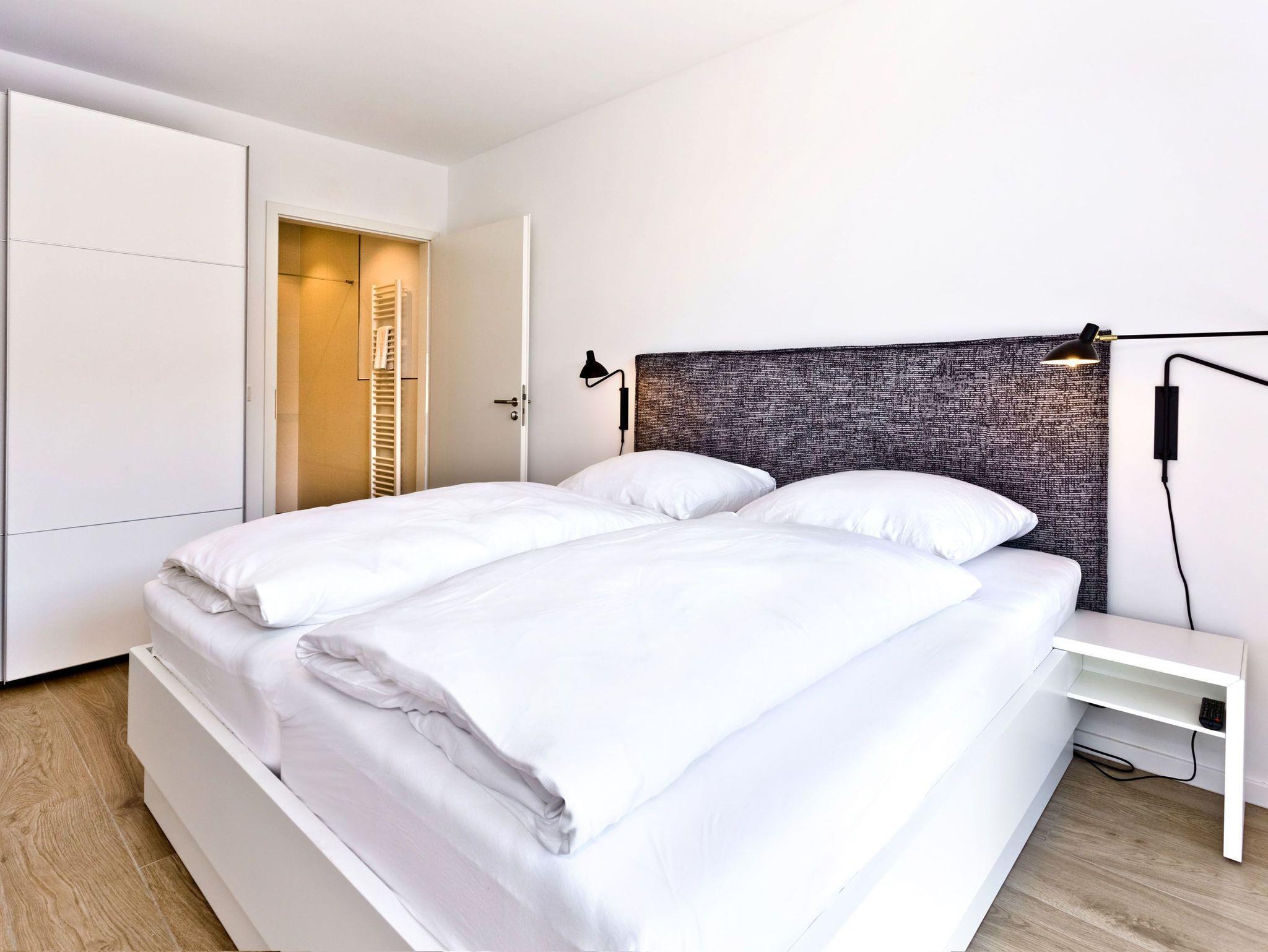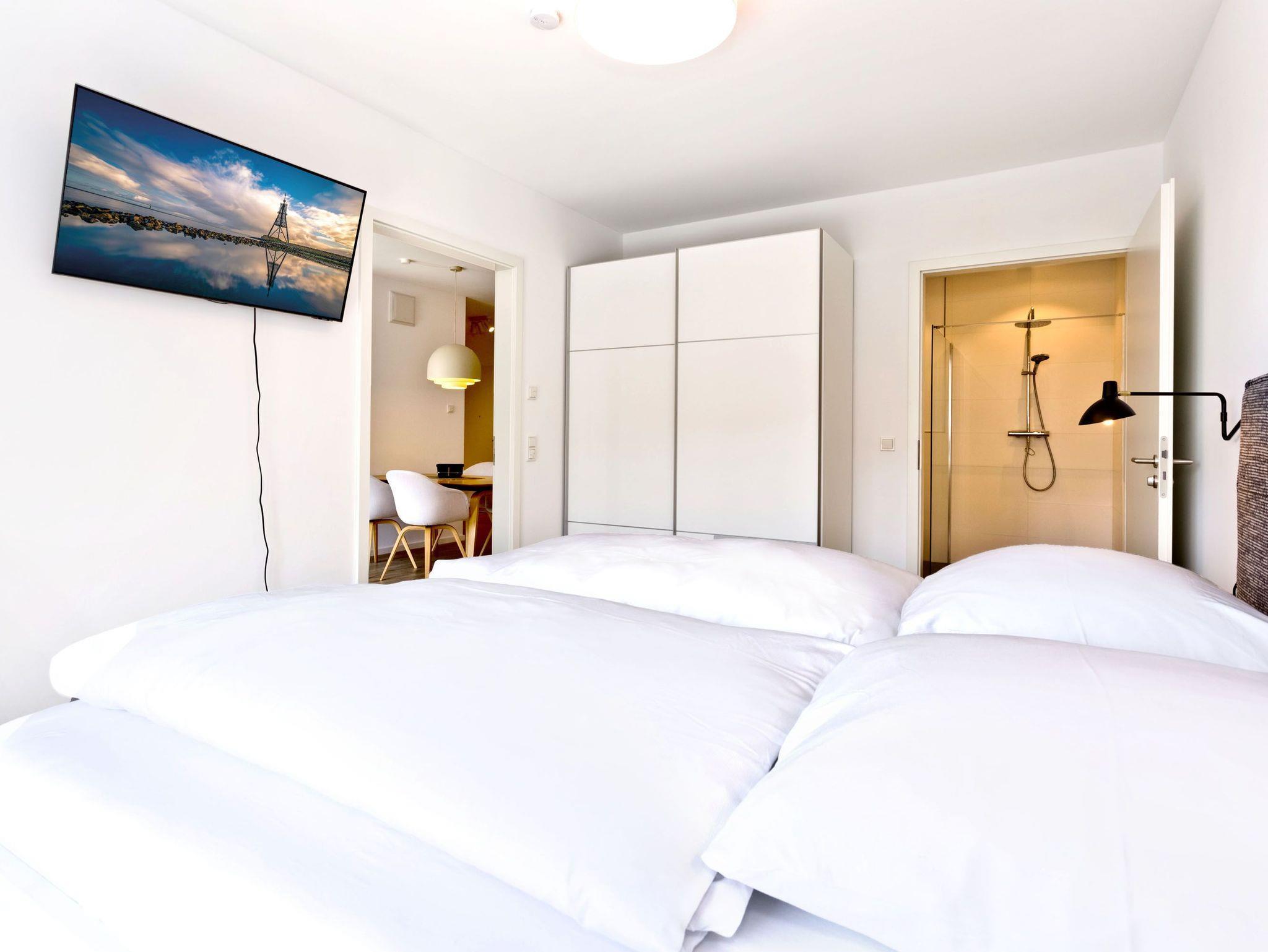 Schlafzimmer mit Doppelbett (2 x 0,90m), TV, Außenjalousien u. Plissees.