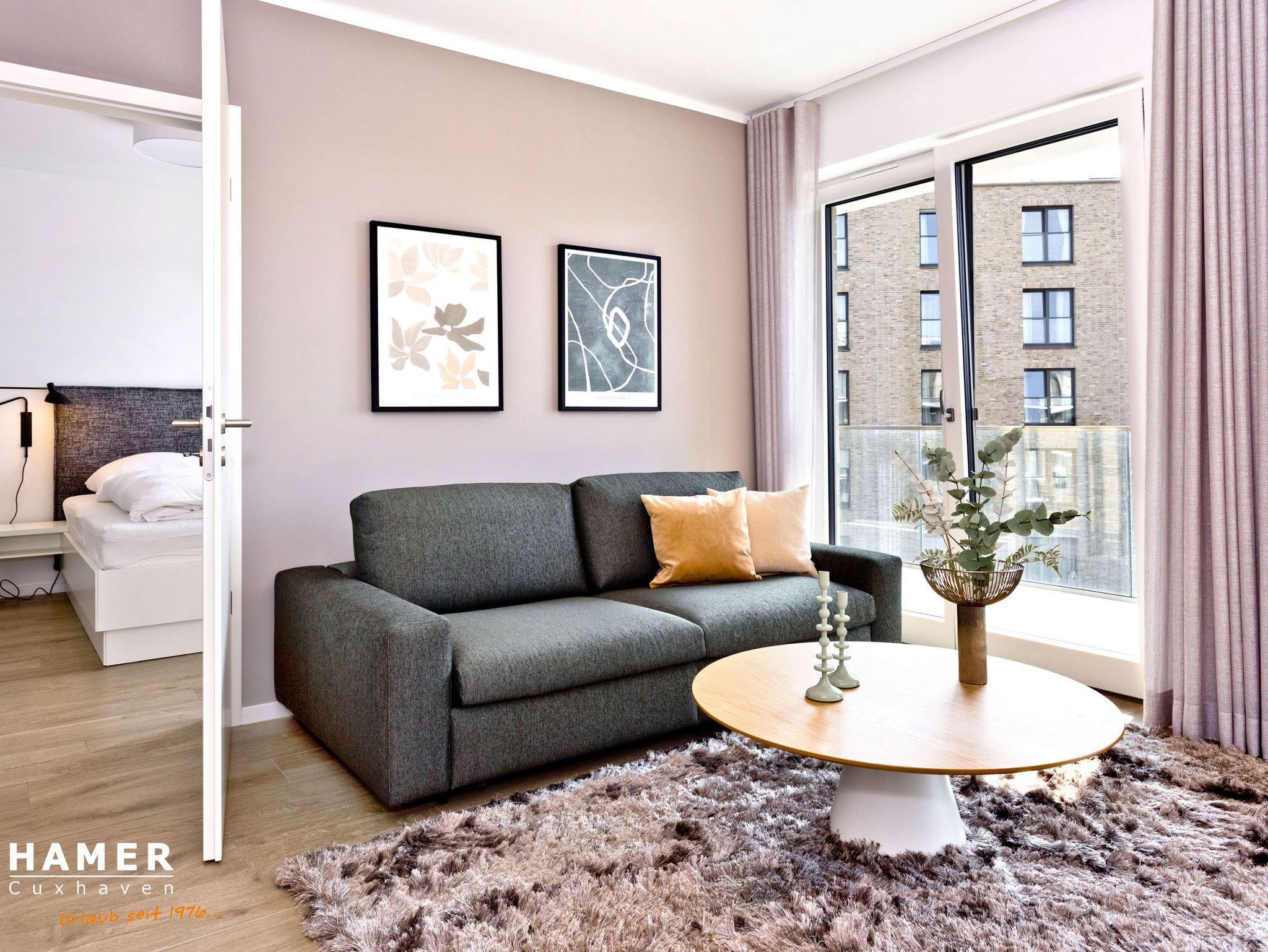 Sehr schöne, großzügige 2-Raum-Ferienwohnung auf ca. 55m² für bis zu 4 Personen (max. 2 Erw. 2 Kinder bis 16J.) geeignet. Sonniges Wohn- / Schlafzimmer mit hochwertiger Schlafcouch, TV, Radio, kostenloses W-LAN-Internet, Essplatz, Außenjalousien u. Plissees, Zugang zum sonnigen Südbalkon.
