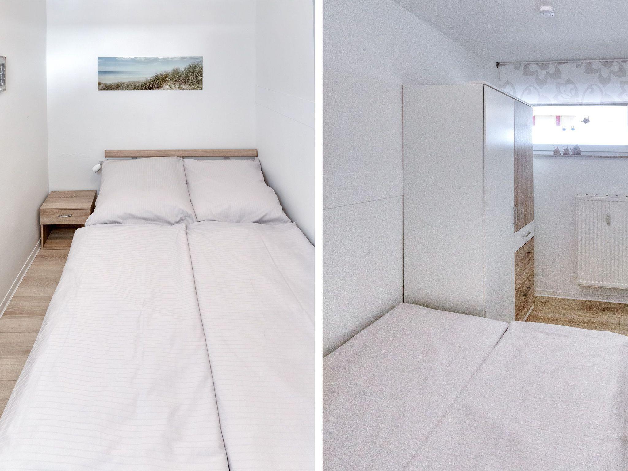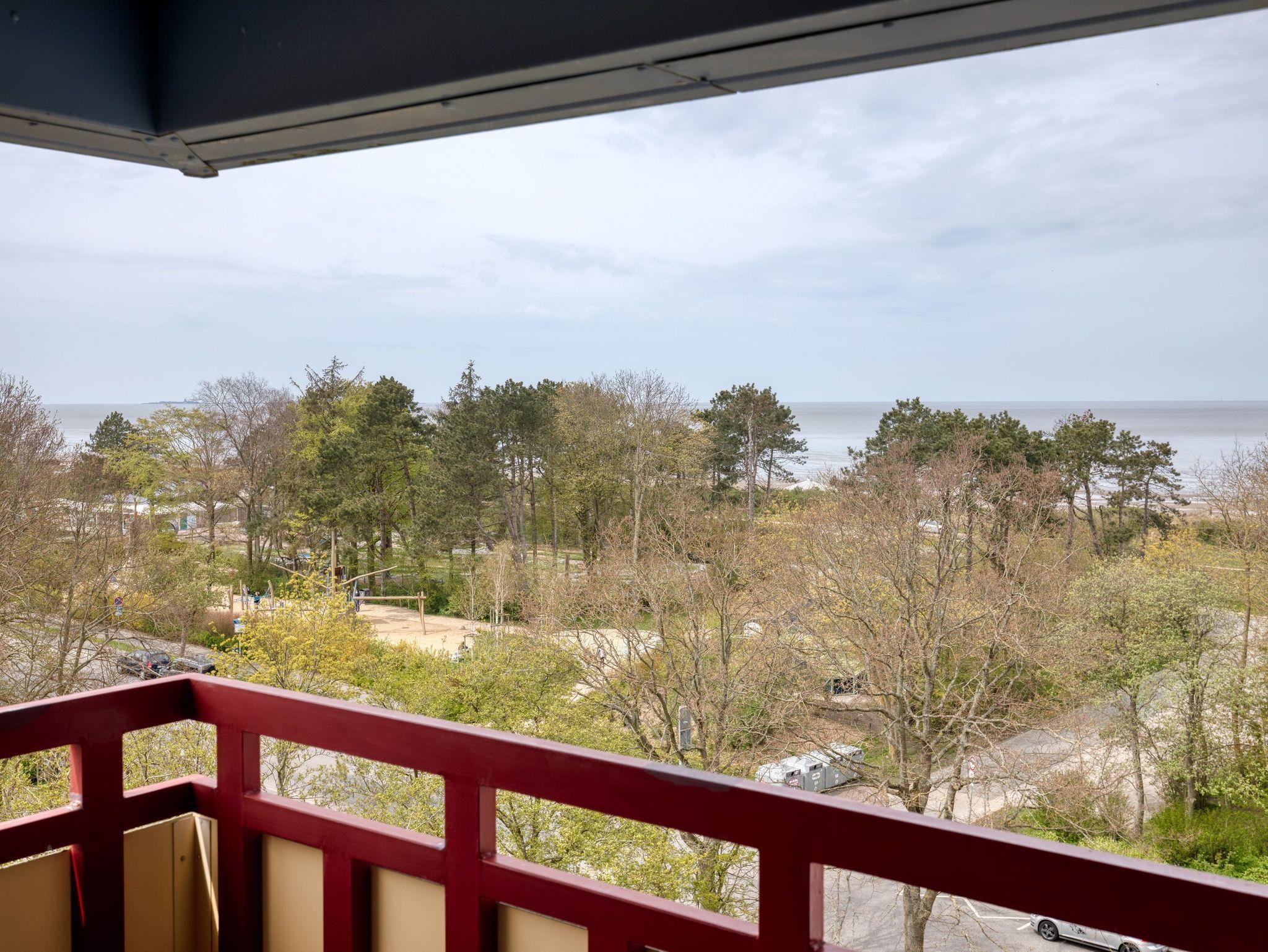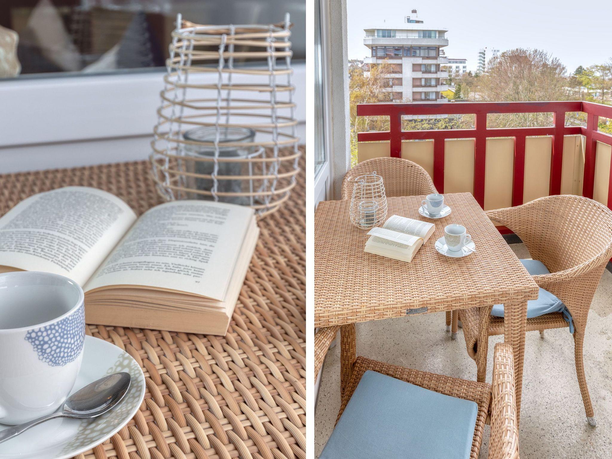 Das Apartment 73 ist ein 2-Raum-Apartment im 6. Obergeschoss für bis zu 4 Personen mit 35 qm. Der möblierte Westbalkon mit Meerblick bietet morgens Schatten und nachmittags Sonne.