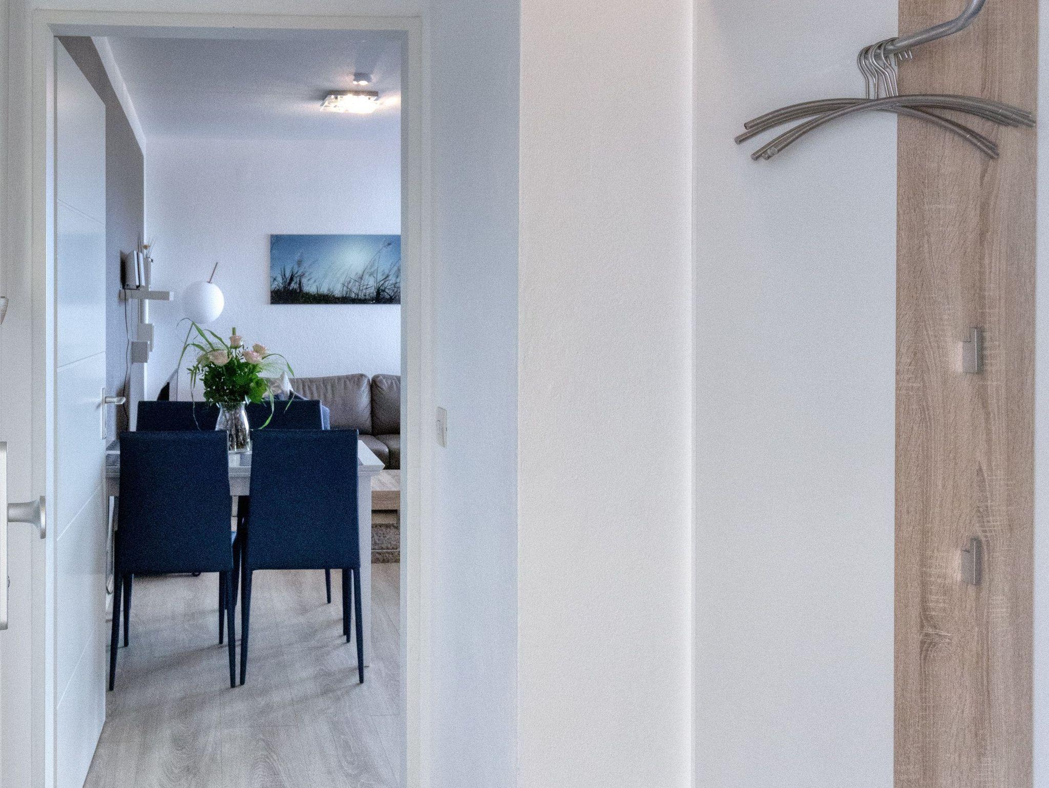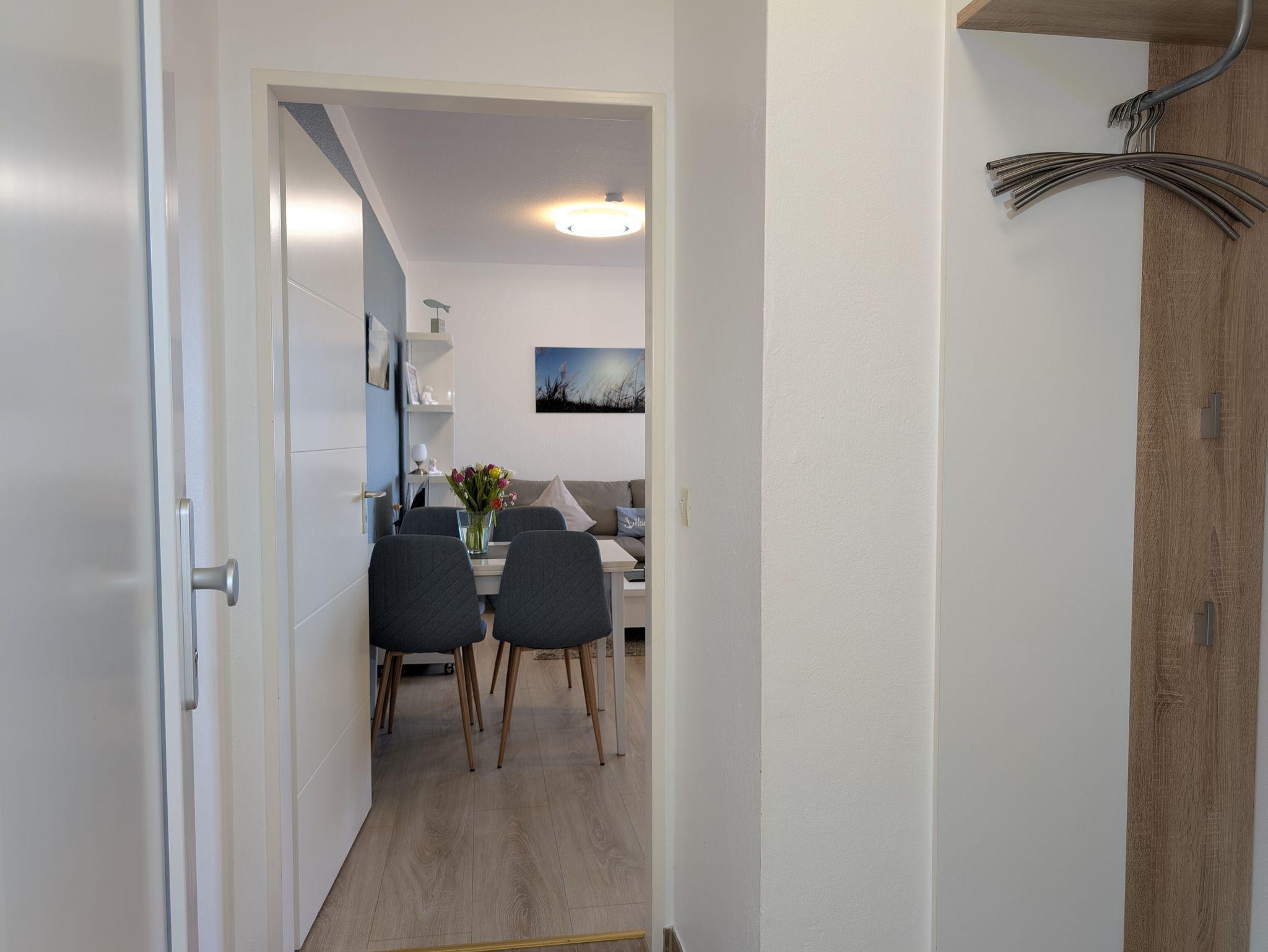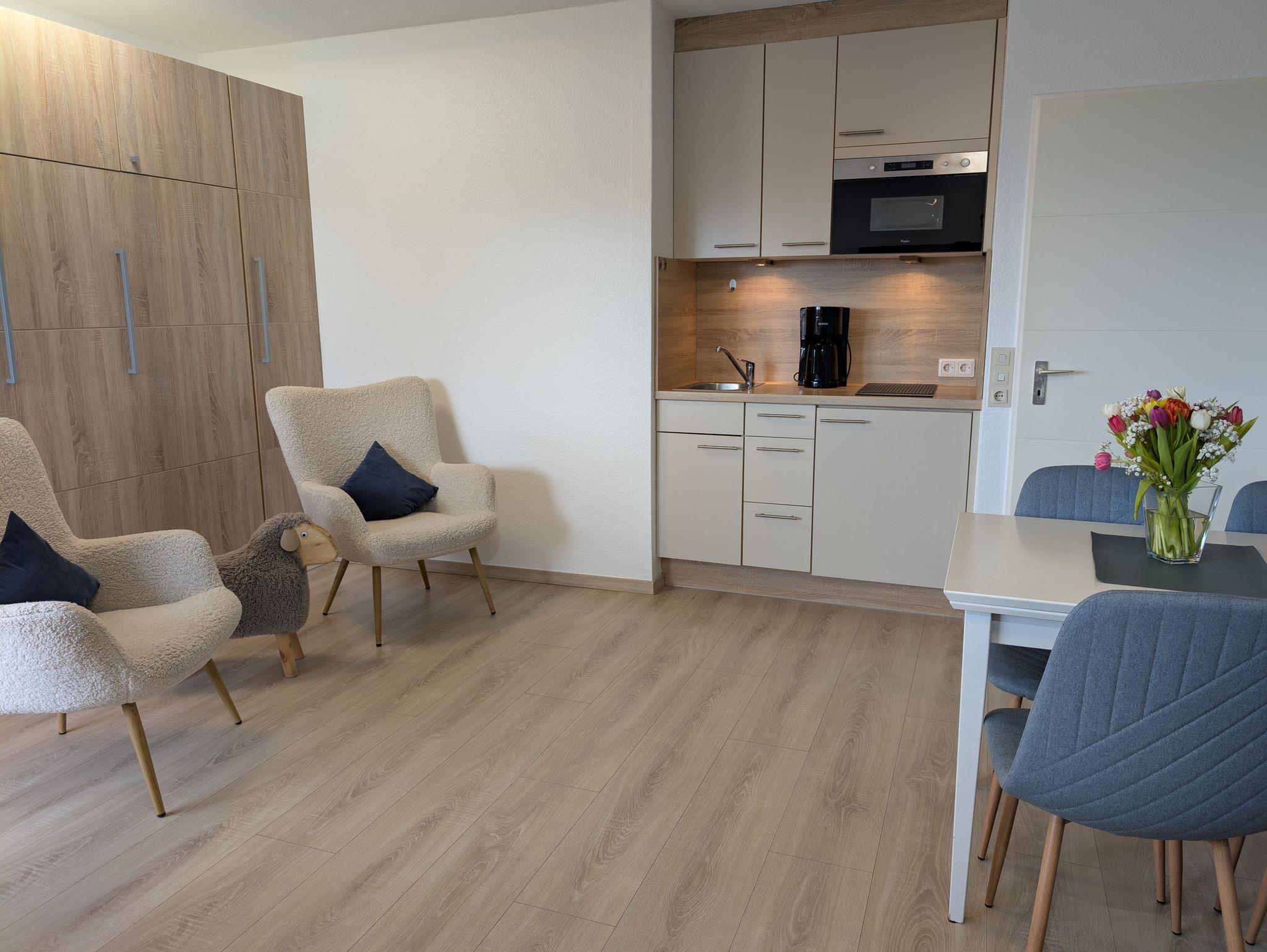Das Apartment 73 ist ein 2-Raum-Apartment im 6. Obergeschoss für bis zu 4 Personen mit 35 qm. Der möblierte Westbalkon mit Meerblick bietet morgens Schatten und nachmittags Sonne.