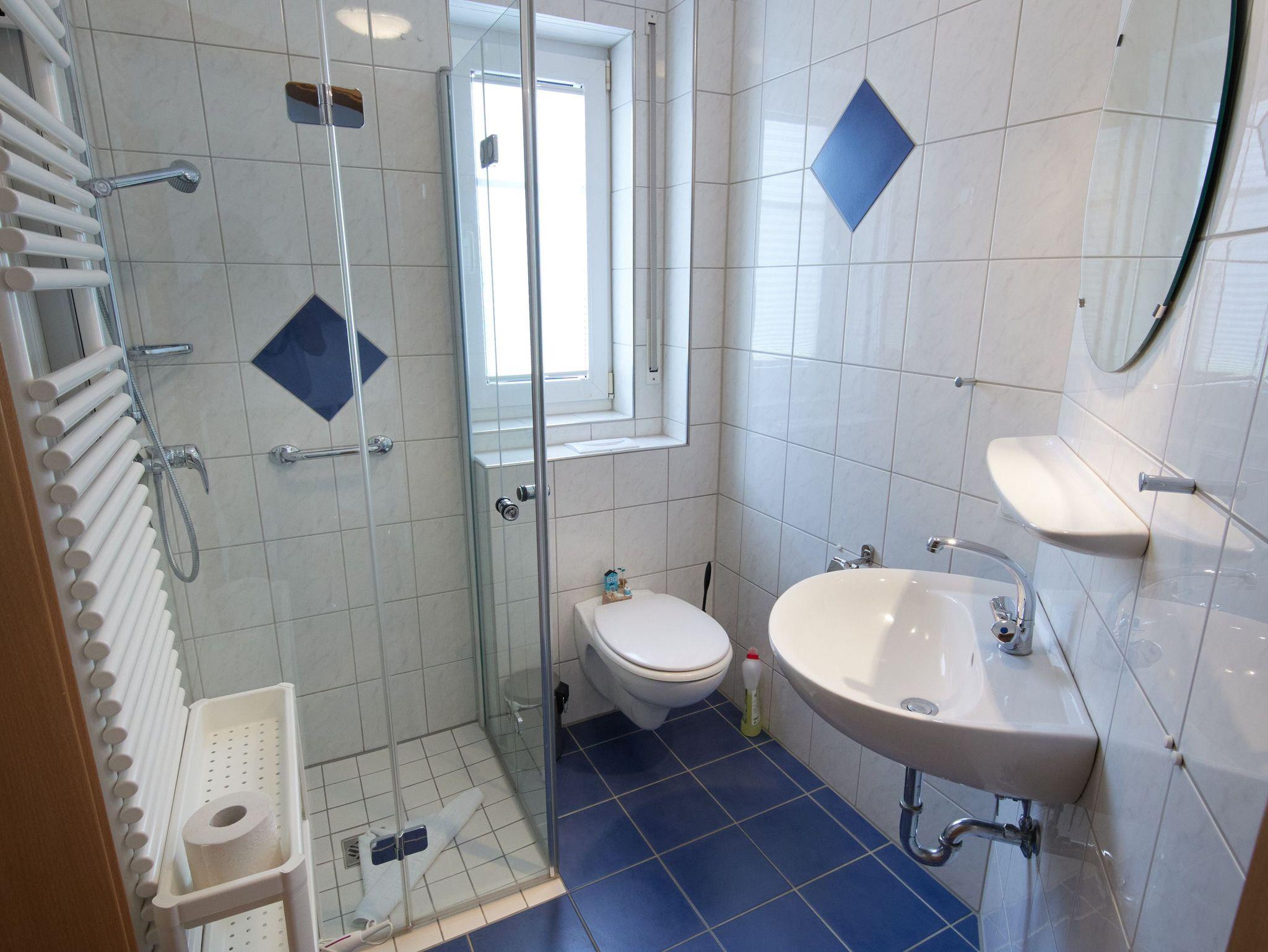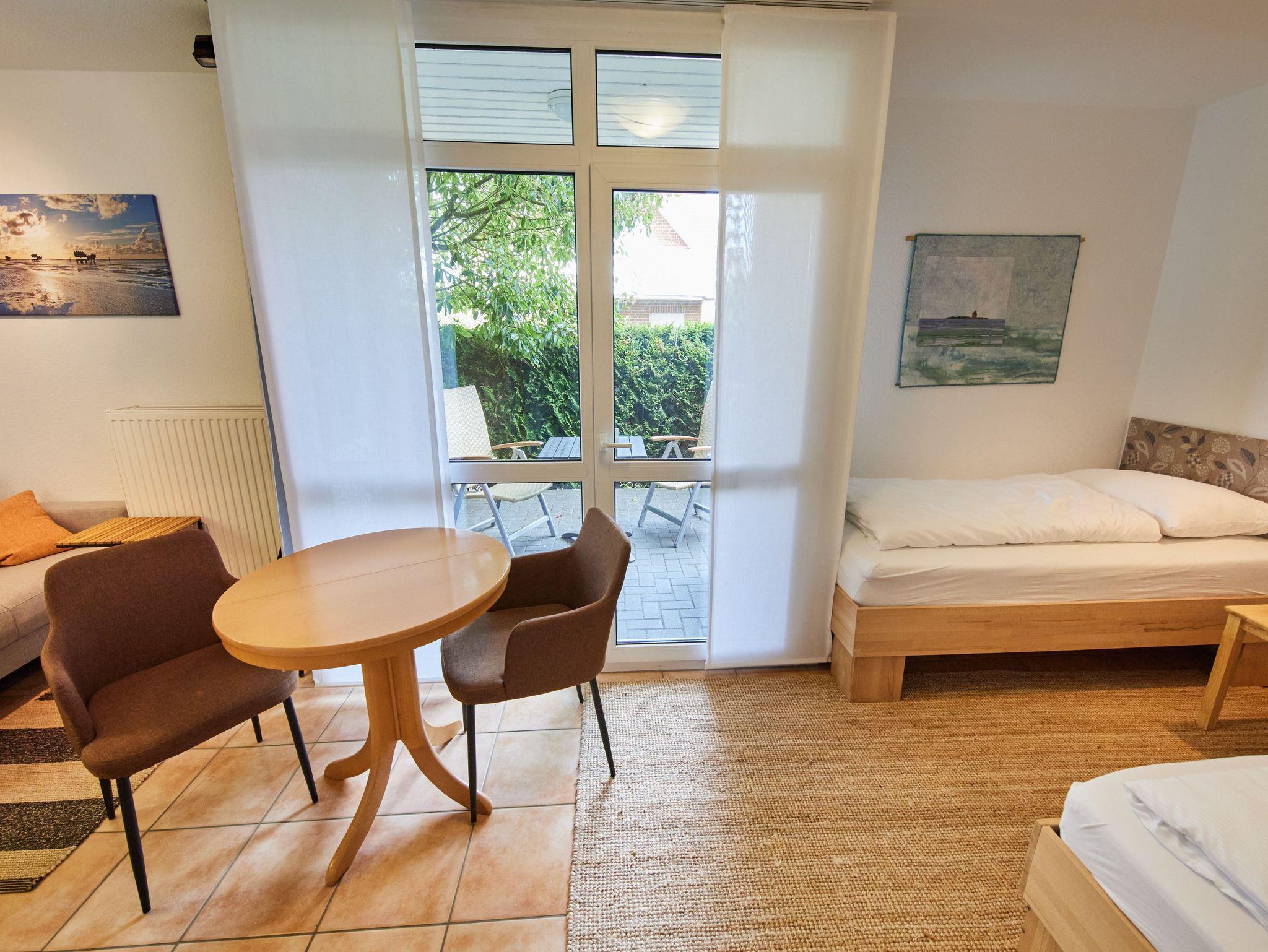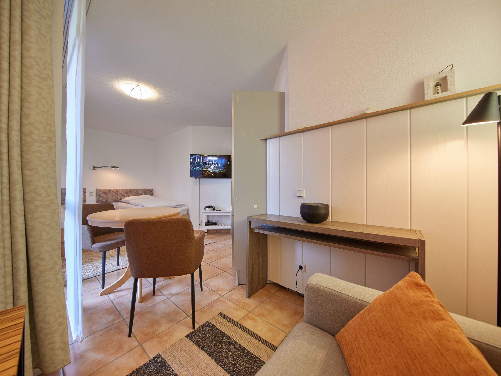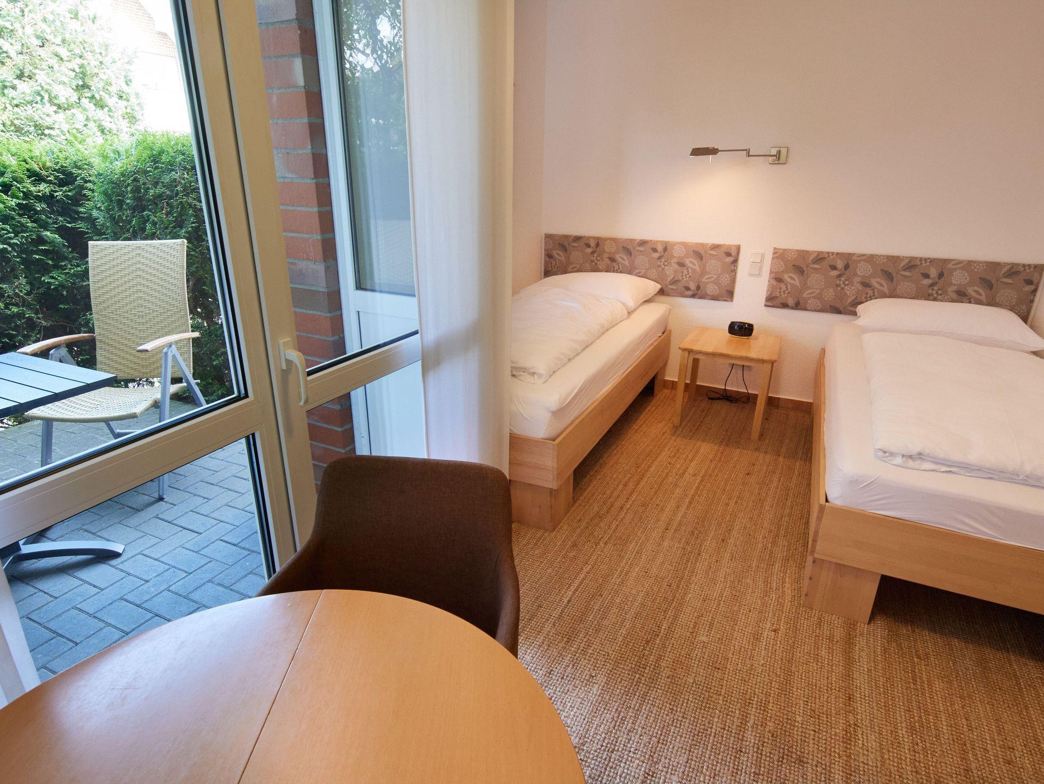 Diese kleine, aber hochwertige 1-Raum Appartement ist gemütlich für 2 Personen ausgestattet. Es befinden sich in diesem kombinierten Einzelzimmer mit Terrasse, der Schlafbereich und ein Wohnbereich, sowie das Duschbad. Das Duschbad mit WC/Fußbodenheizung ist mit einem Rollstuhl - Türen 100cm breit - mit Hilfe einer weiteren Person befahrbar und daher bedingt barrierefrei. Zwei Einzelbetten, eine kleine Sitzecke und im Vorflur des Appartements ein eigener Kühlschrank mit Gefrierbox und eine eigene Mikrowelle.