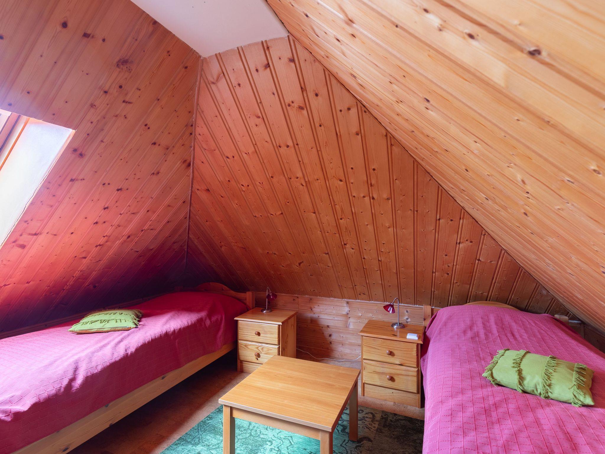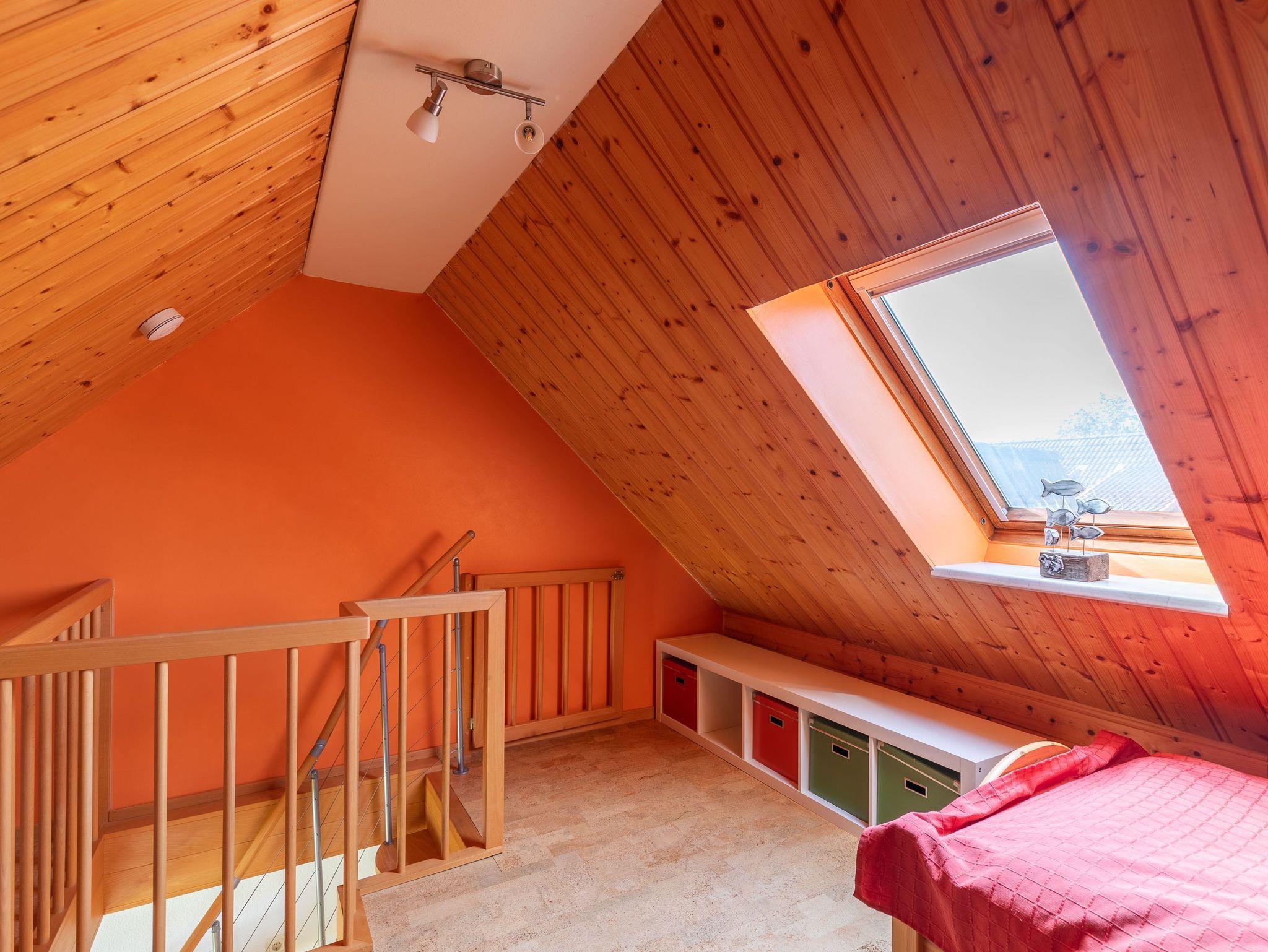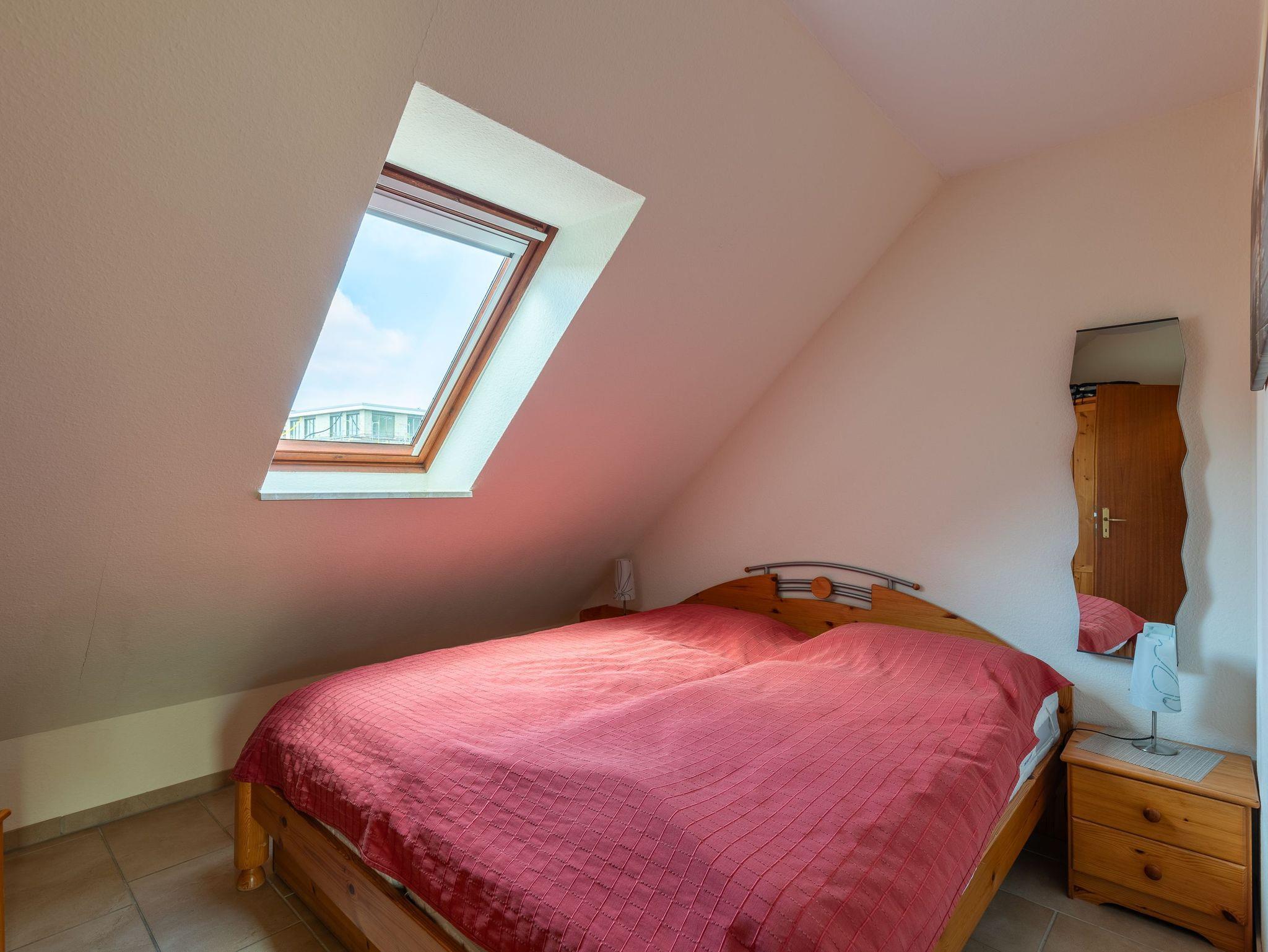 Schlafzimmer mit Doppelbett. Ein weiteres Zimmer gibt es im Dachgeschoss, welches über eine Raumspartreppe aus dem Wohn-/Essbereich erreichbar ist (Treppe ist relativ steil). Hier befinden sich zwei weitere Einzelbetten. Bad mit Waschbecken, Waschmaschine, Dusche und WC. Kleine, sonnige Dachloggia mit Gartenstühlen und Bistrotisch.