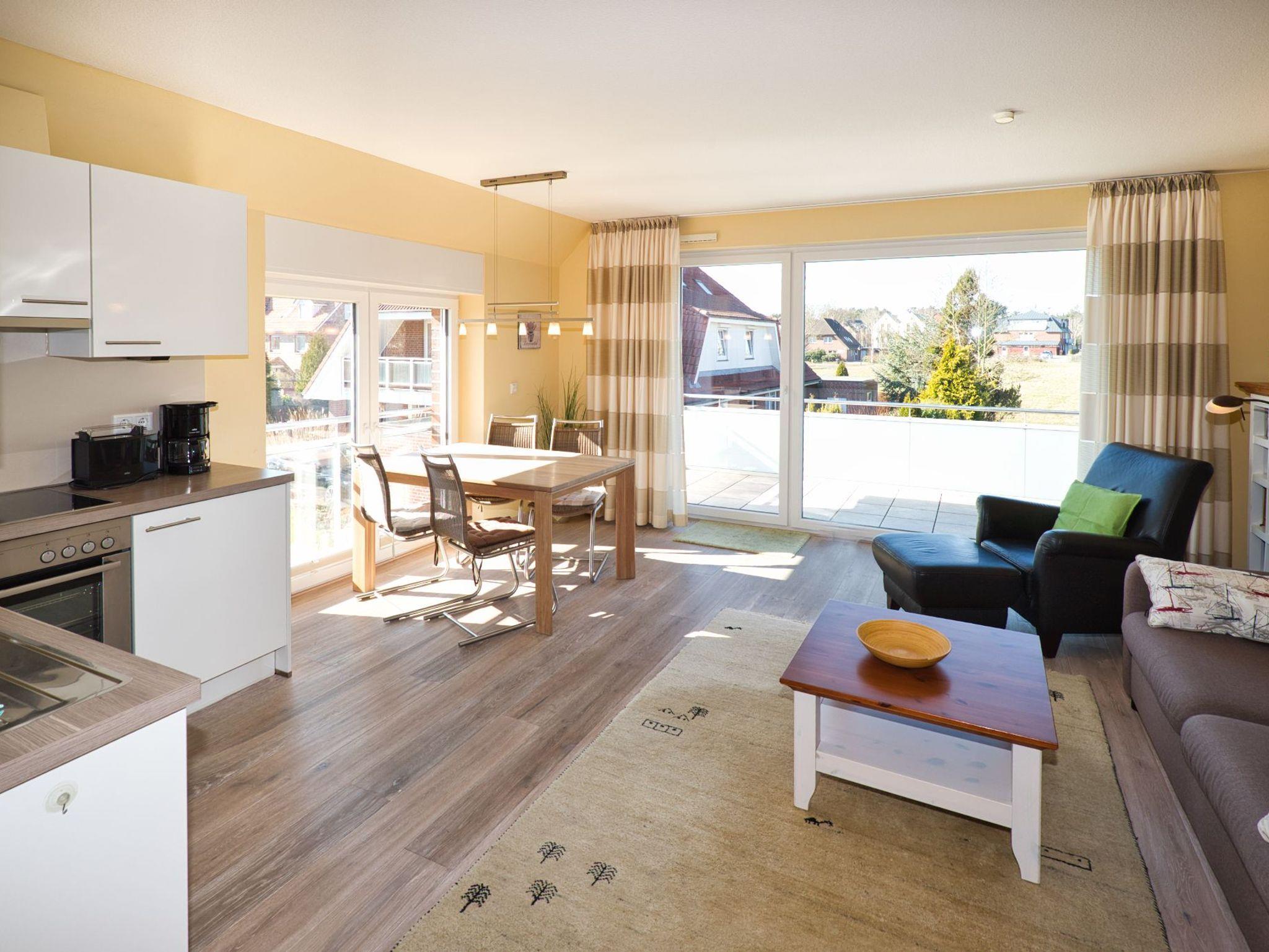 Dünenflair. FeWo 7. Eine luxuriöse 2-Raum Ferienwohnung auf 58m² erwartet Sie hier. Ein wunderschöner Neubau wurde hier geschaffen. Die Wohnung, welche großzügig geschnitten ist befindet sich im 1.OG und erstreckt sich auf ein geräumigen Eingangsbereich mit Garderobe und einem kleinen Abstellraum. Vom Flur aus kommen Sie ebenso ins Badezimmer mit einer tollen Runddusche, sowie in das geräumige Schlafzimmer mit einem großen Kleiderschrank und einem Abstellbereich für Ihre Koffer, sowie einer Sitzbank. Der offene Flur führt direkt in den hellen Wohn- und Essbereich mit Blick auf Felder und Wiesen. Der große Westbalkon mit Balkonmöbeln wird Sie begeistern. Die Einbauküche ist hochwertig und komplett ausgestattet. Die großzügige Gartenanlage, die dem Haus ihren Namen -Dünenflair- gab, verschafft zusätzliche Freiräume. Hier wurde auch eine Grillecke angelegt. Urlaub erleben.