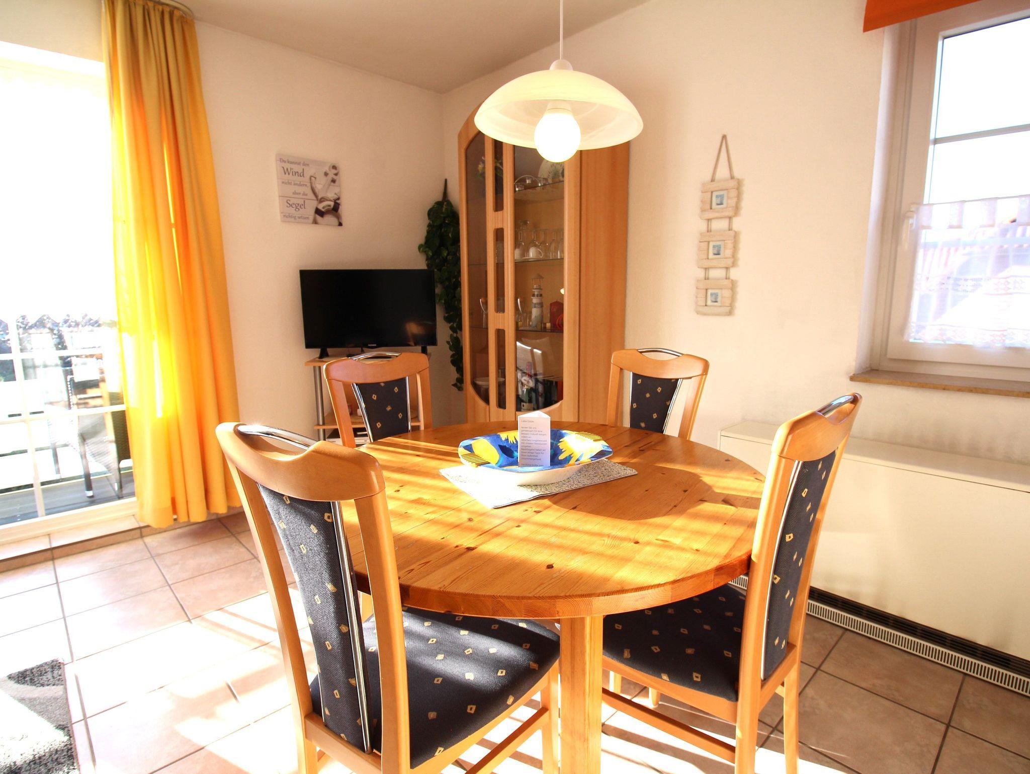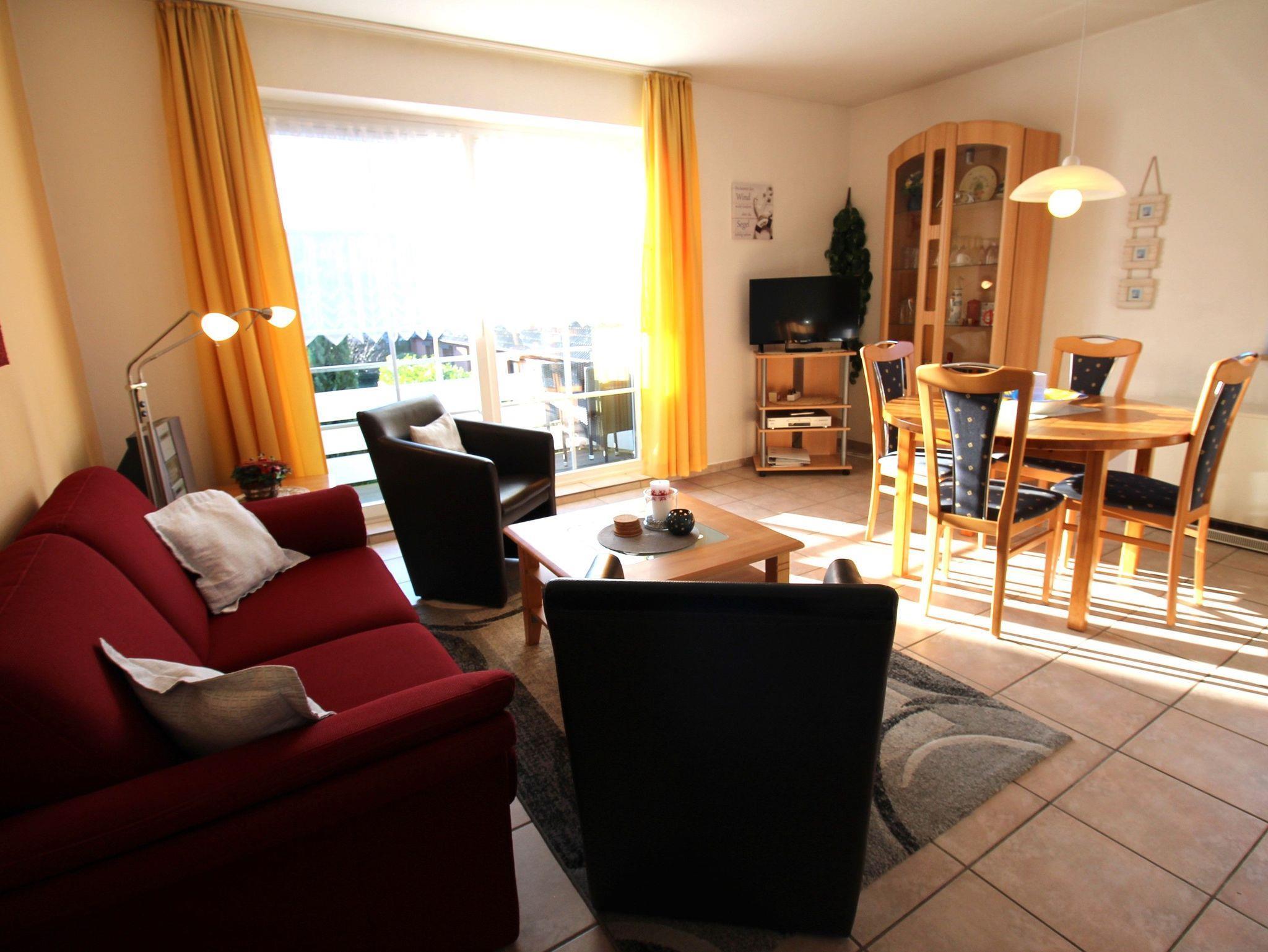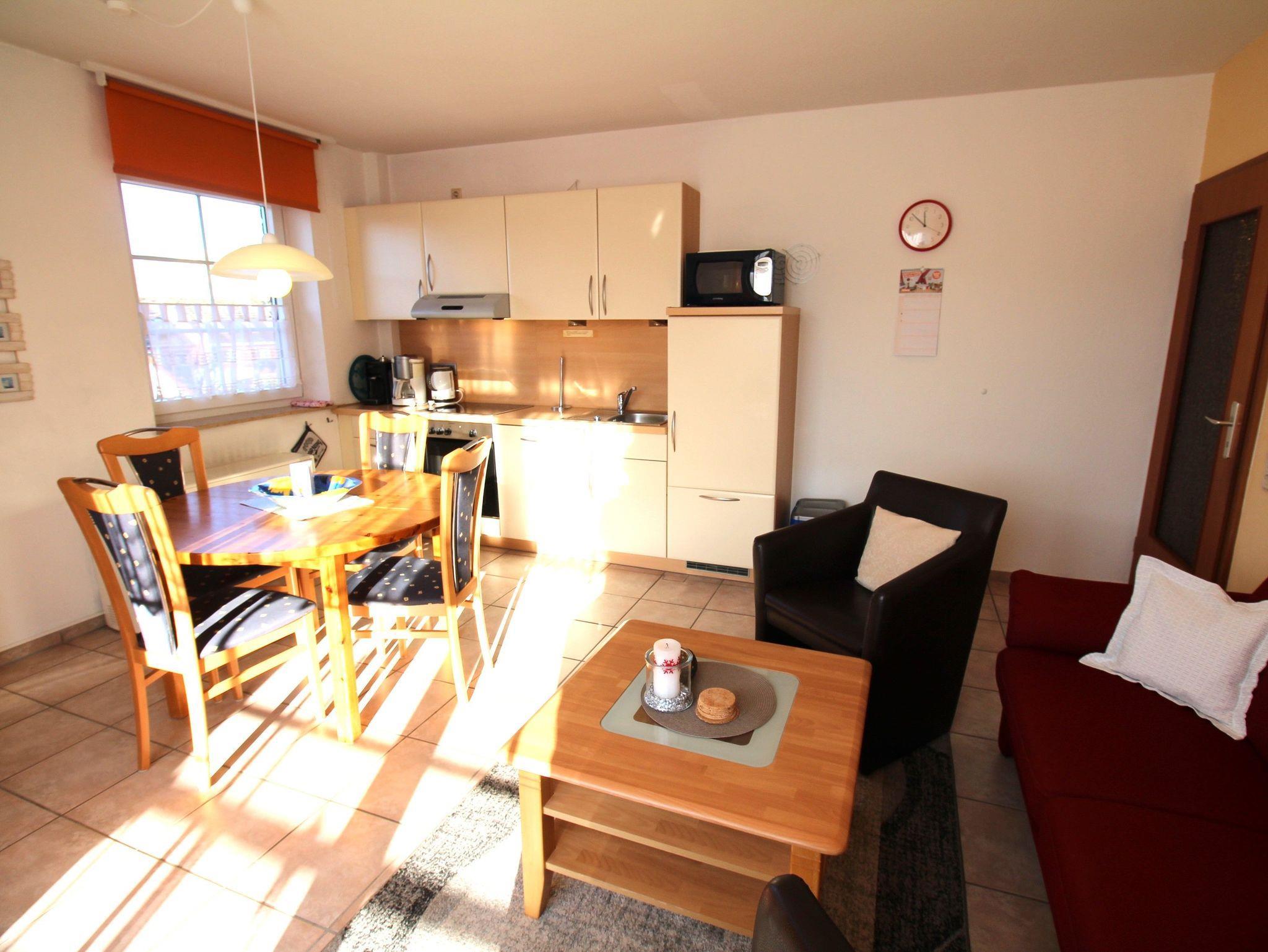 Unsere gemütlich und komplett eingerichtete Ferienwohnung befindet sich in der 1. Etage, bestehend aus drei Zimmern mit ca. 51 m² Wohnfläche und Balkon. Sie bietet Platz für bis zu 4 Personen. Die Einbauküche ist vollständig eingerichtet: 4-Platten-Ceran-Elektroherd, Backofen, Mikrowelle, Geschirrspüler, Kühlschrank, Kaffeemaschine, Geschirr, Besteck, usw. Der Wohnraum hat LCD-TV, DVD-Player, Mini-Hifi-Anlage, Essplatz und eine gemütliche Sitzecke. Für schlechtes Wetter stehen eine Spielesammlung und Bücher zur Verfügung. Im Elternschlafzimmer befindet sich ein großer Kleiderschrank und ein weiteres TV-Gerät.