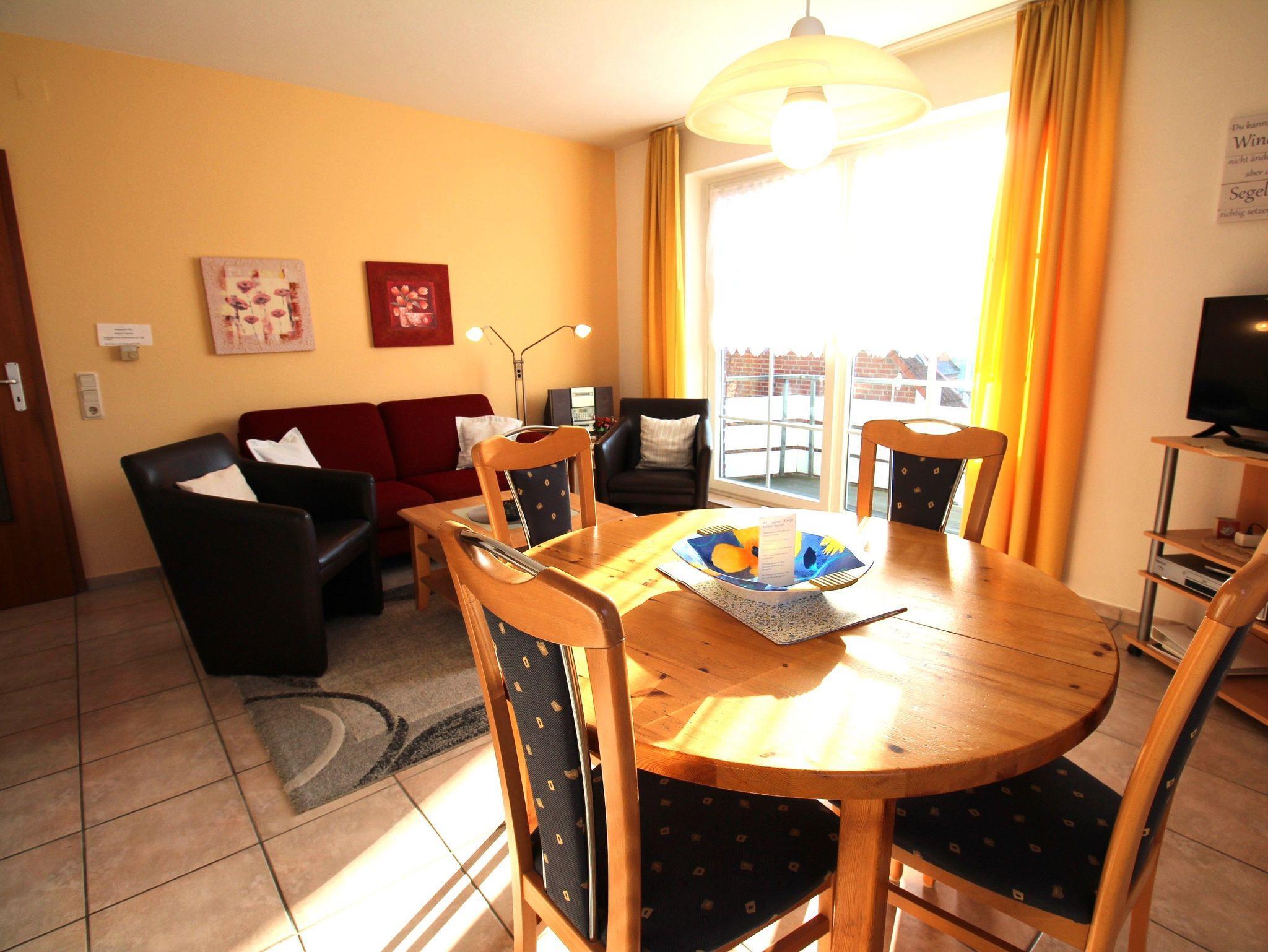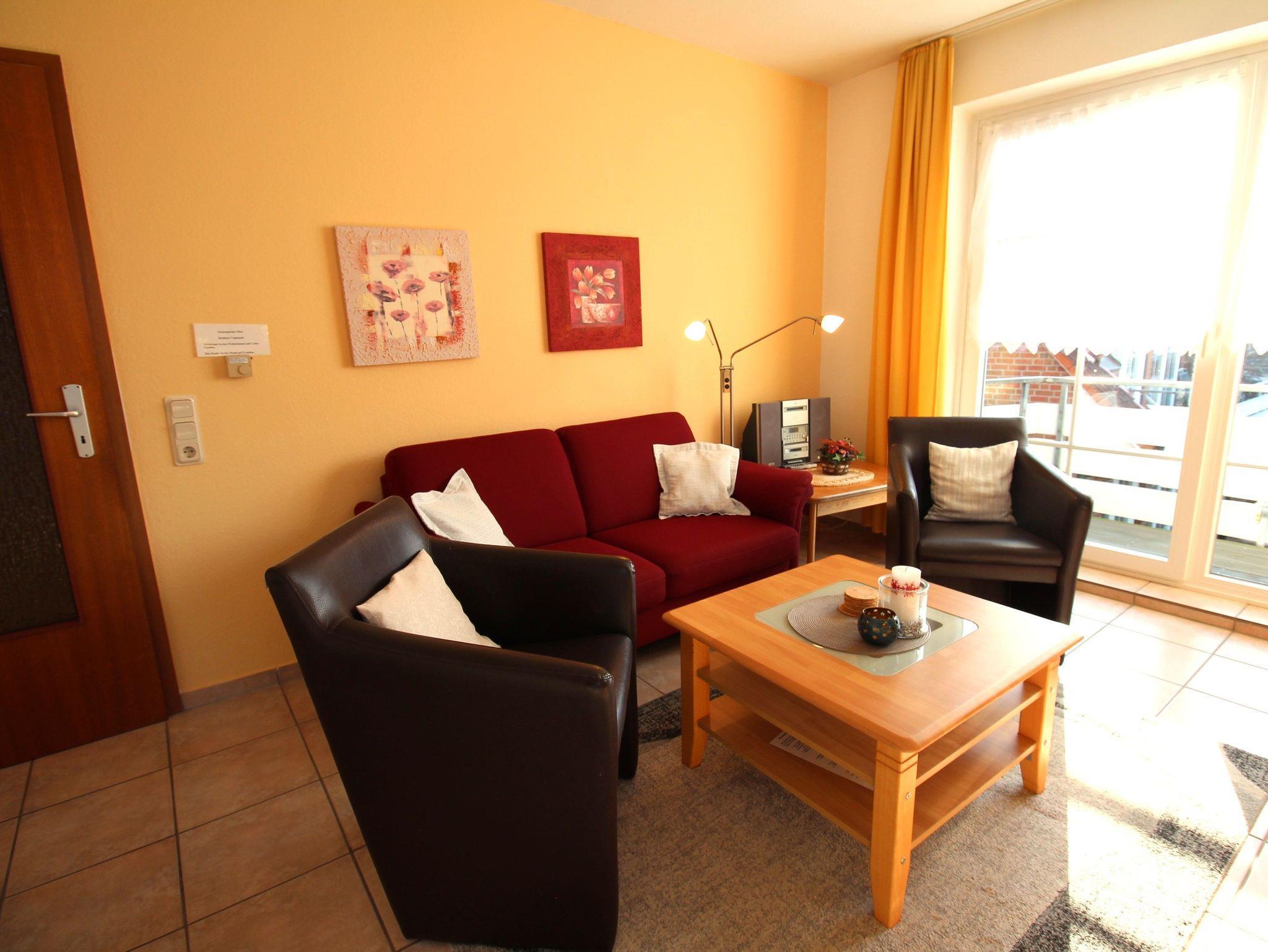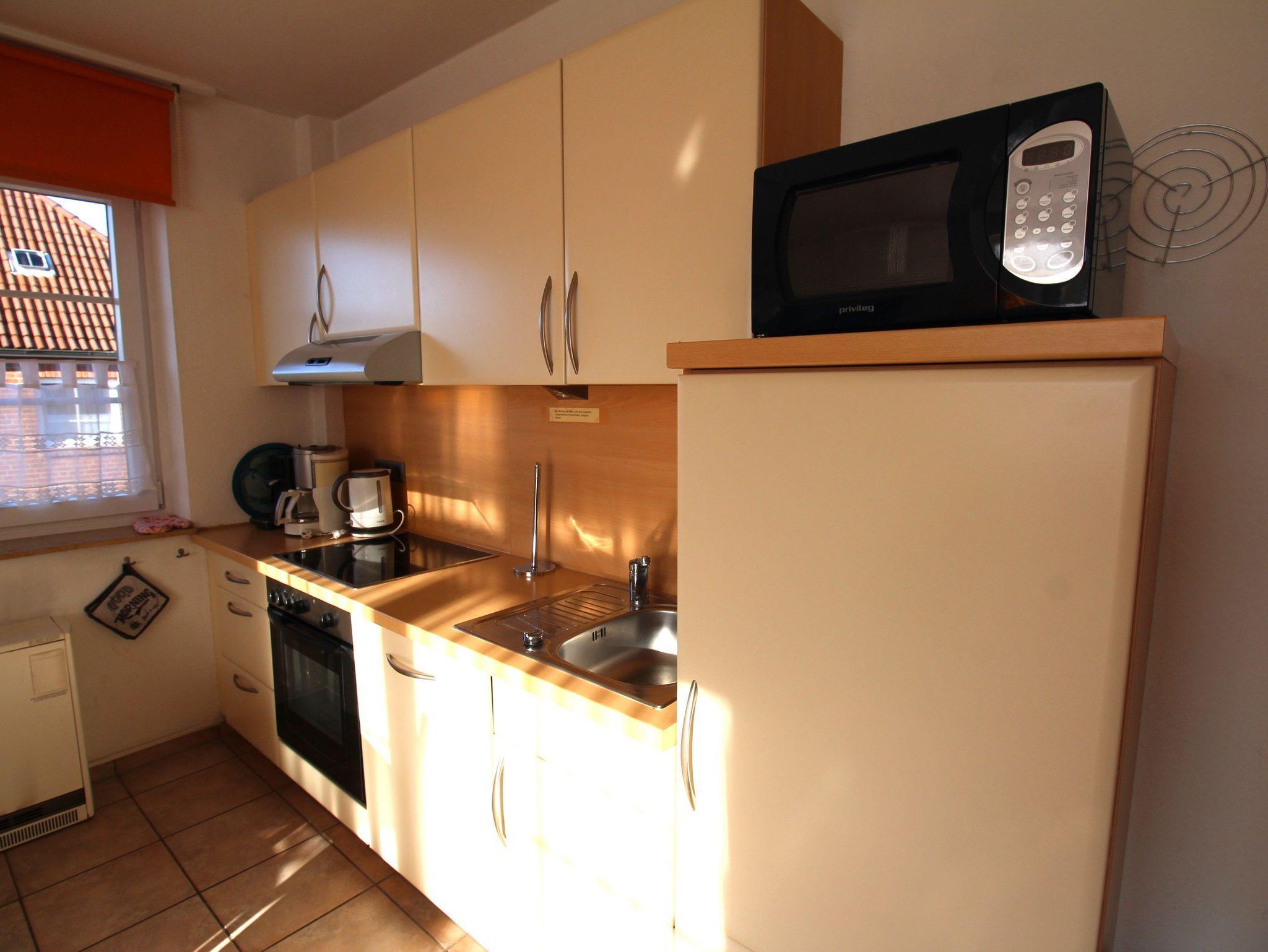 Unsere gemütlich und komplett eingerichtete Ferienwohnung befindet sich in der 1. Etage, bestehend aus drei Zimmern mit ca. 51 m² Wohnfläche und Balkon. Sie bietet Platz für bis zu 4 Personen. Die Einbauküche ist vollständig eingerichtet: 4-Platten-Ceran-Elektroherd, Backofen, Mikrowelle, Geschirrspüler, Kühlschrank, Kaffeemaschine, Geschirr, Besteck, usw. Der Wohnraum hat LCD-TV, DVD-Player, Mini-Hifi-Anlage, Essplatz und eine gemütliche Sitzecke. Für schlechtes Wetter stehen eine Spielesammlung und Bücher zur Verfügung. Im Elternschlafzimmer befindet sich ein großer Kleiderschrank und ein weiteres TV-Gerät.