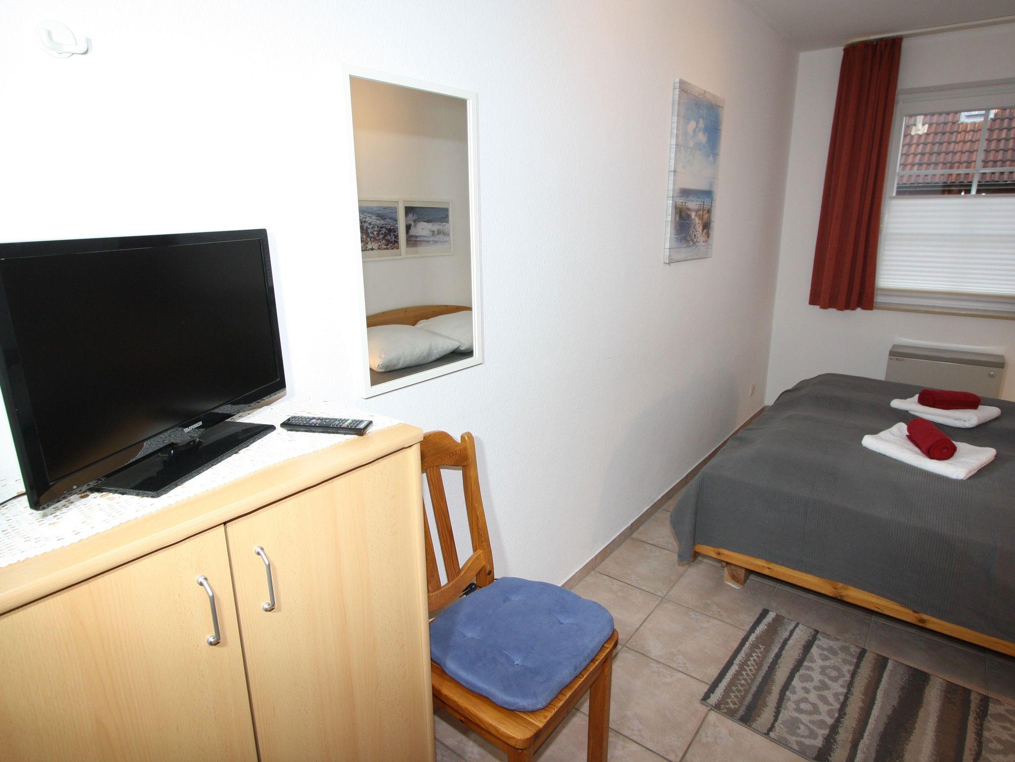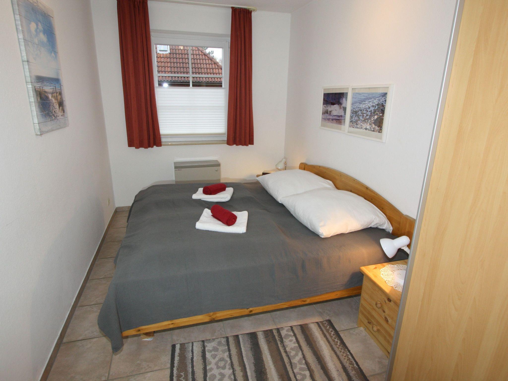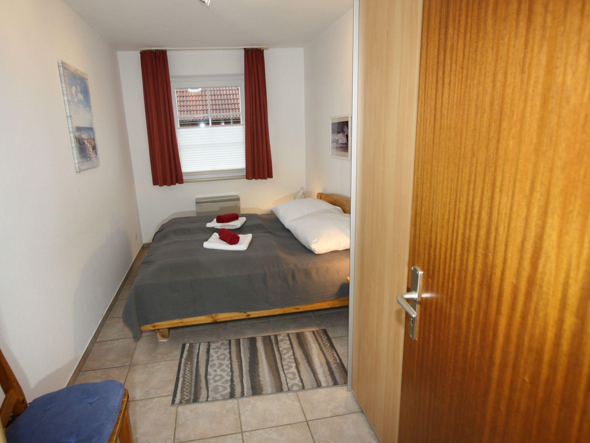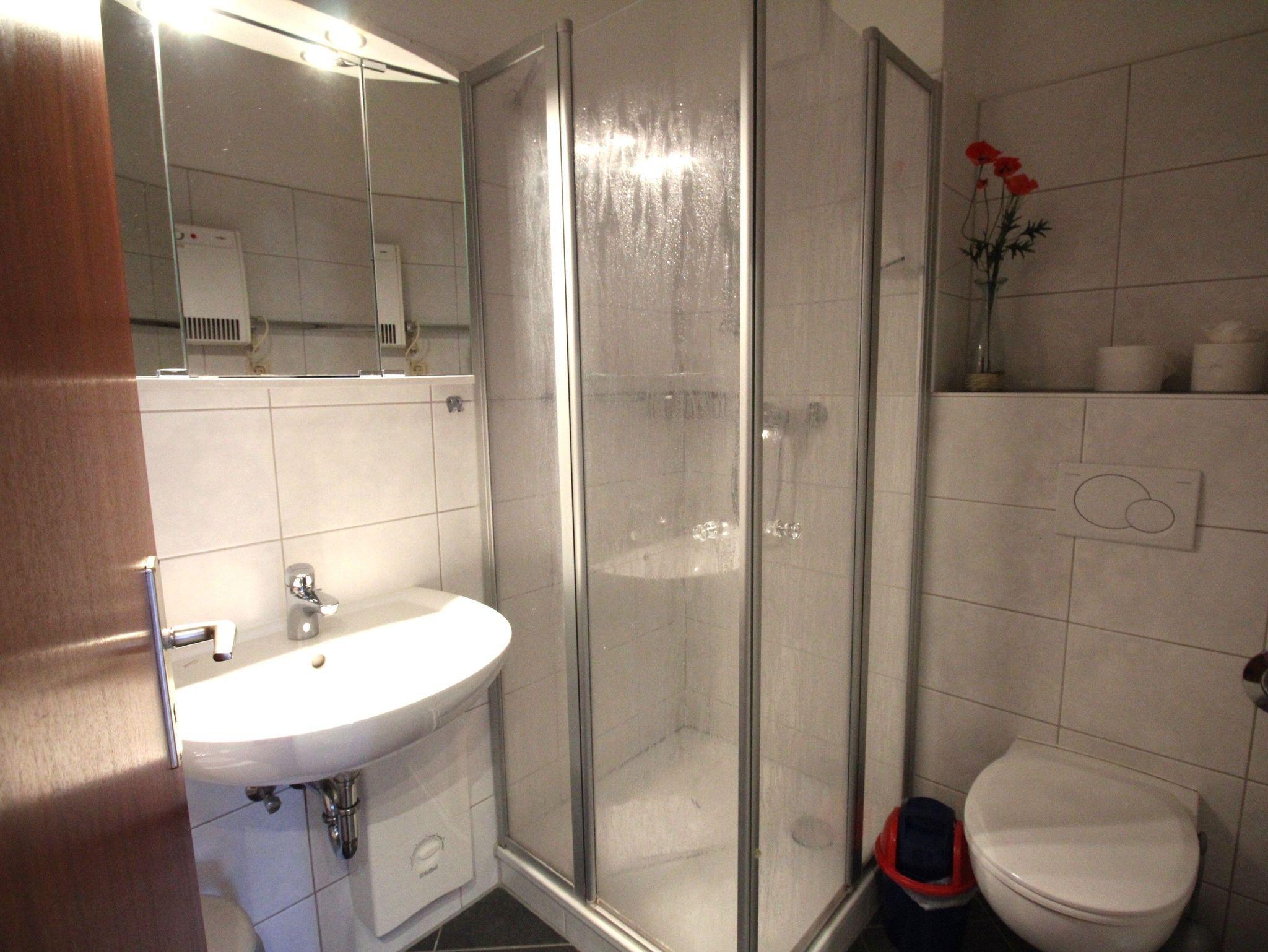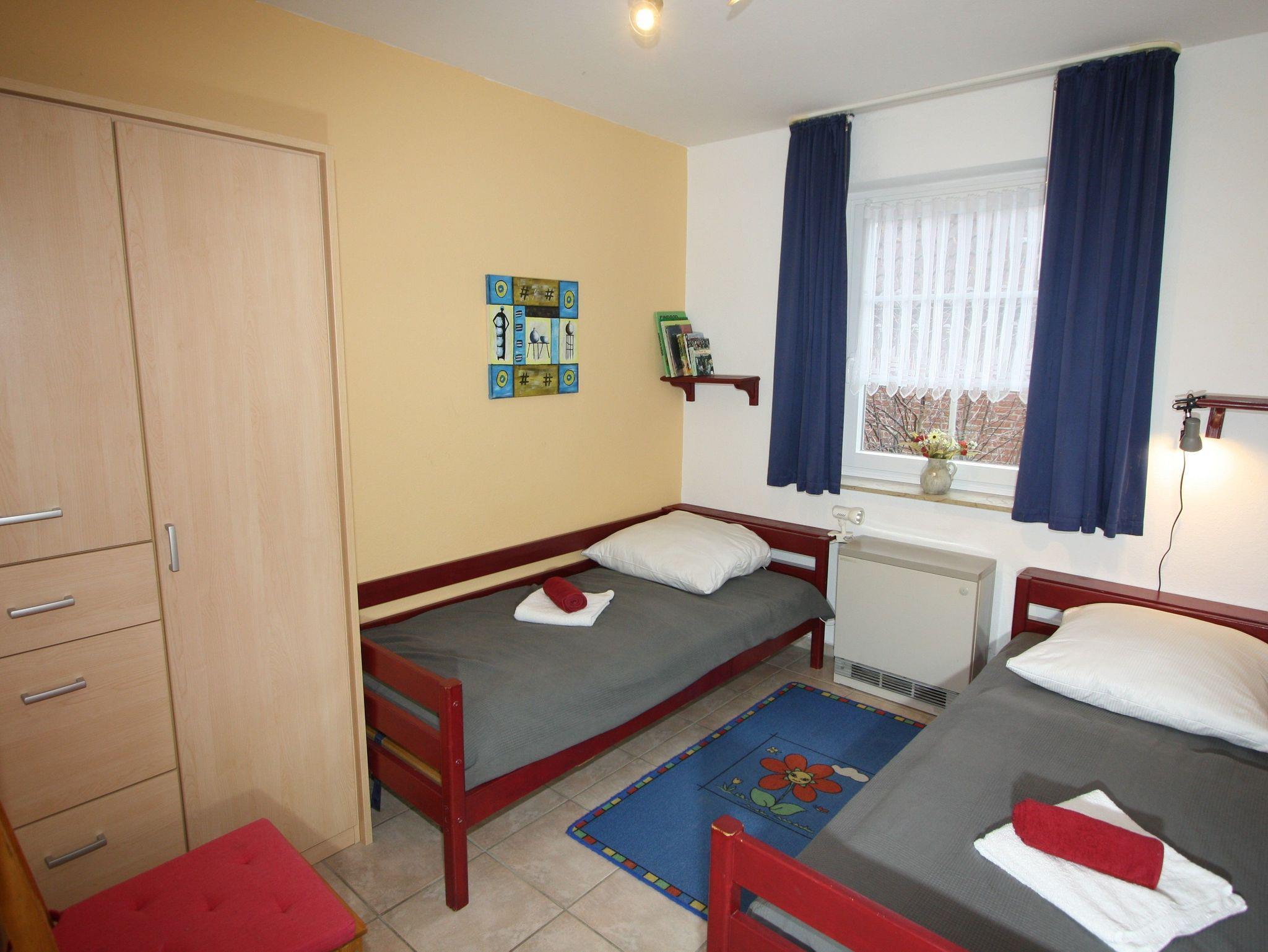 Das Kinderzimmer hat zwei getrennte große Betten, die auch für Erwachsene geeignet sind. Das funktionell eingerichtete Bad besteht aus Dusche, WC und Waschbecken. Die Wohnung ist komplett gefließt. In den Schlafräumen und unter der Sitzecke befinden sich Läufer bzw. ein Teppich.
