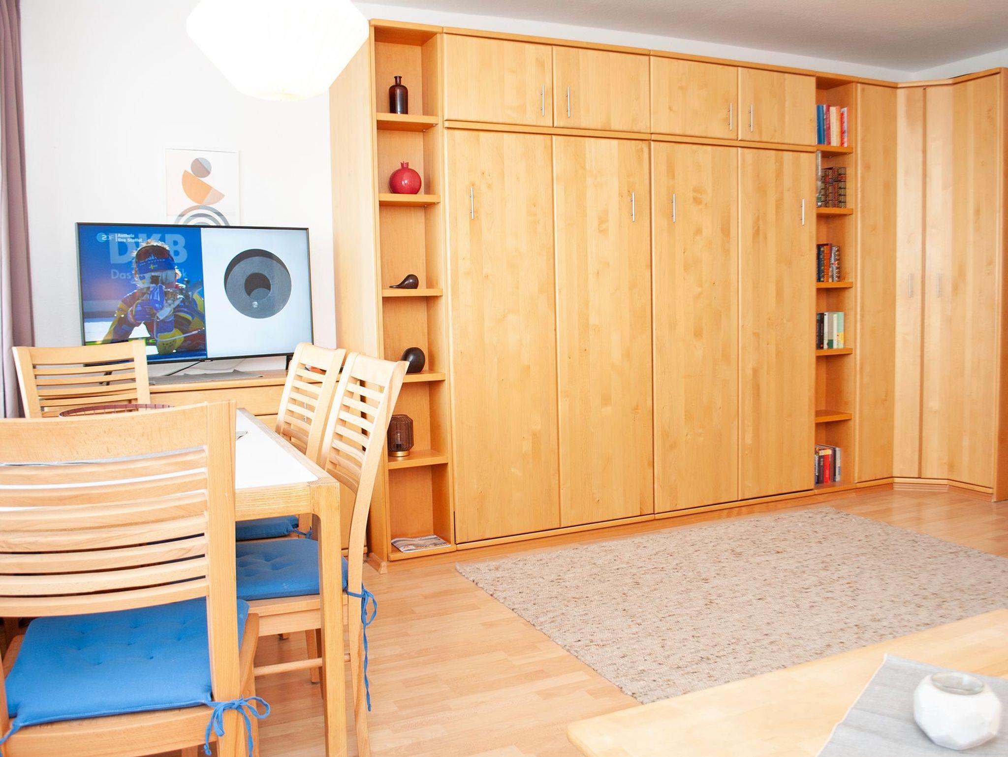 Das Apartment besteht aus einem Wohnbereich mit Schrankbett für 2 Personen, einem zusätzlichem Etagenbett in einer Nische im Flur und einem Badezimmer mit Dusche sowie WC. Die Ferienwohnung beinhaltet eine voll ausgestattete offene Küche.