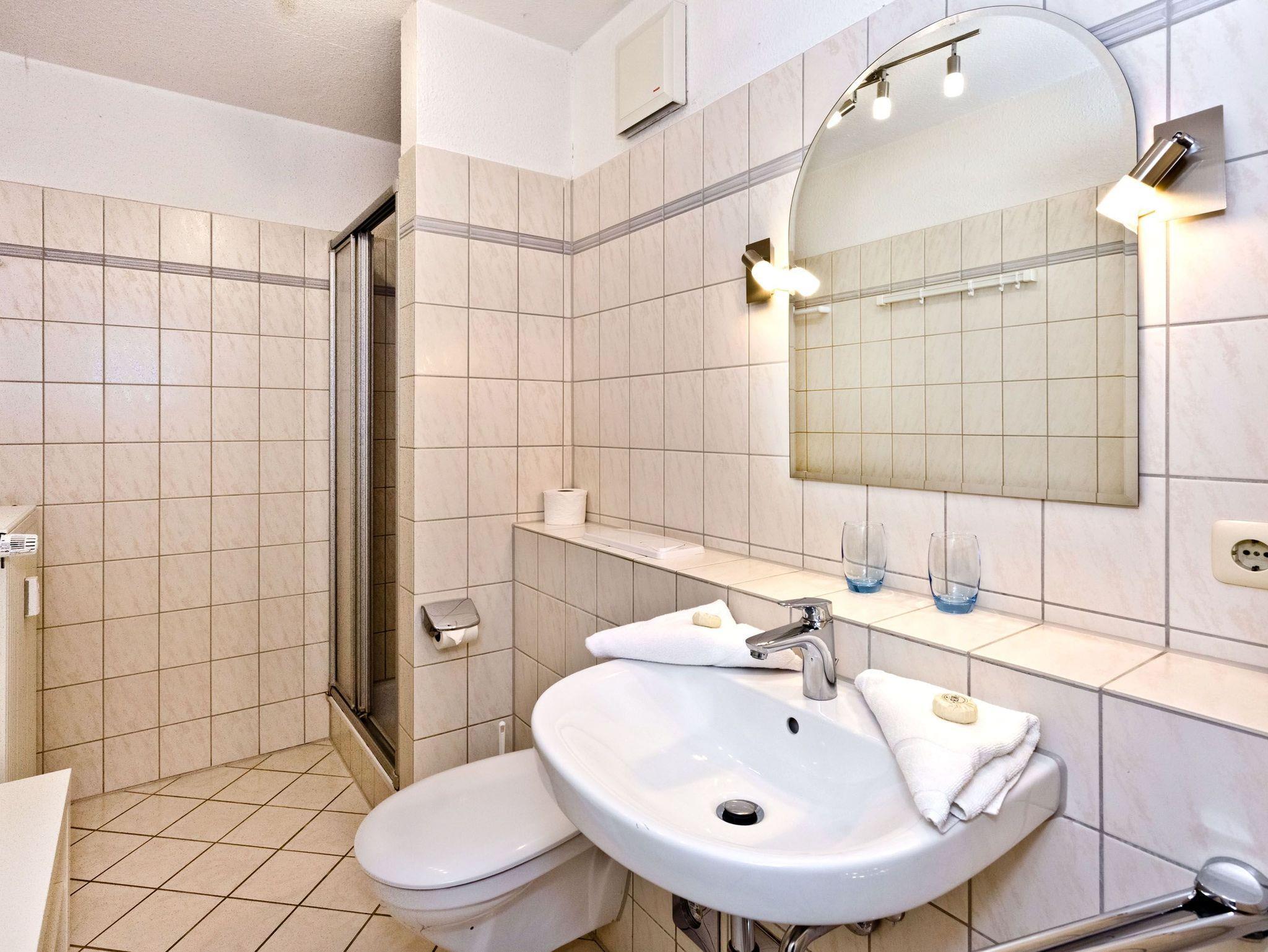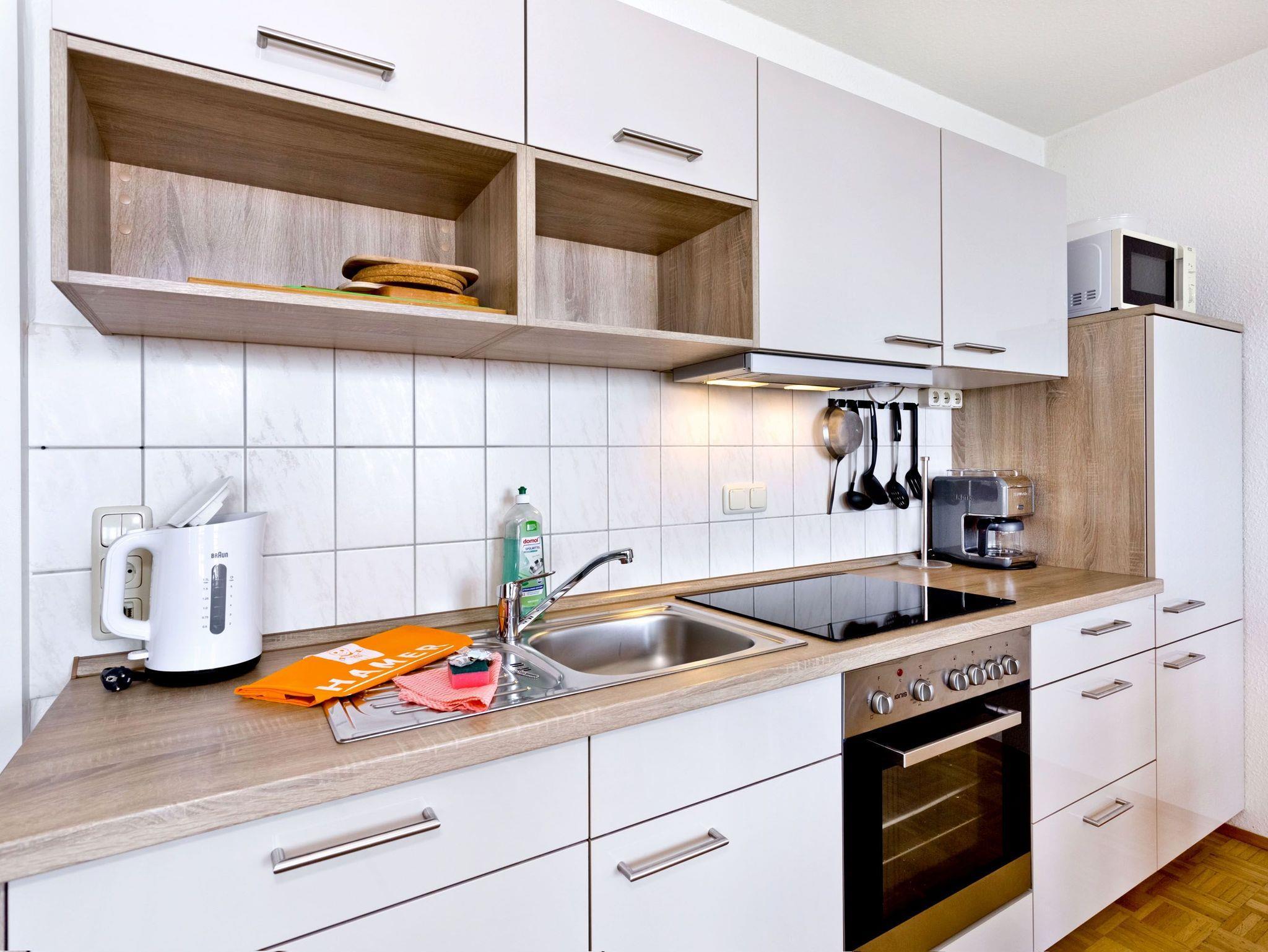 Komfortable 2-Raum-Wohnung mit uneingeschränkter Seesicht auf der 1. Etage mit Aufzug für 2 Personen. Wohnzimmer mit Küchenzeile ( Geschirrspüler, Backofen, etc. ). Wohnzimmer mit Kabel-TV und Radio, Esstisch für 4 Pers., kleiner Balkon zur Seeseite (nord), kleines Schlafzimmer mit 2 Einzelbetten [&] Rollläden, Dusche/WC, kostenfreies W-lan, nummerierter Pkw-Stellplatz #17 am Haus.