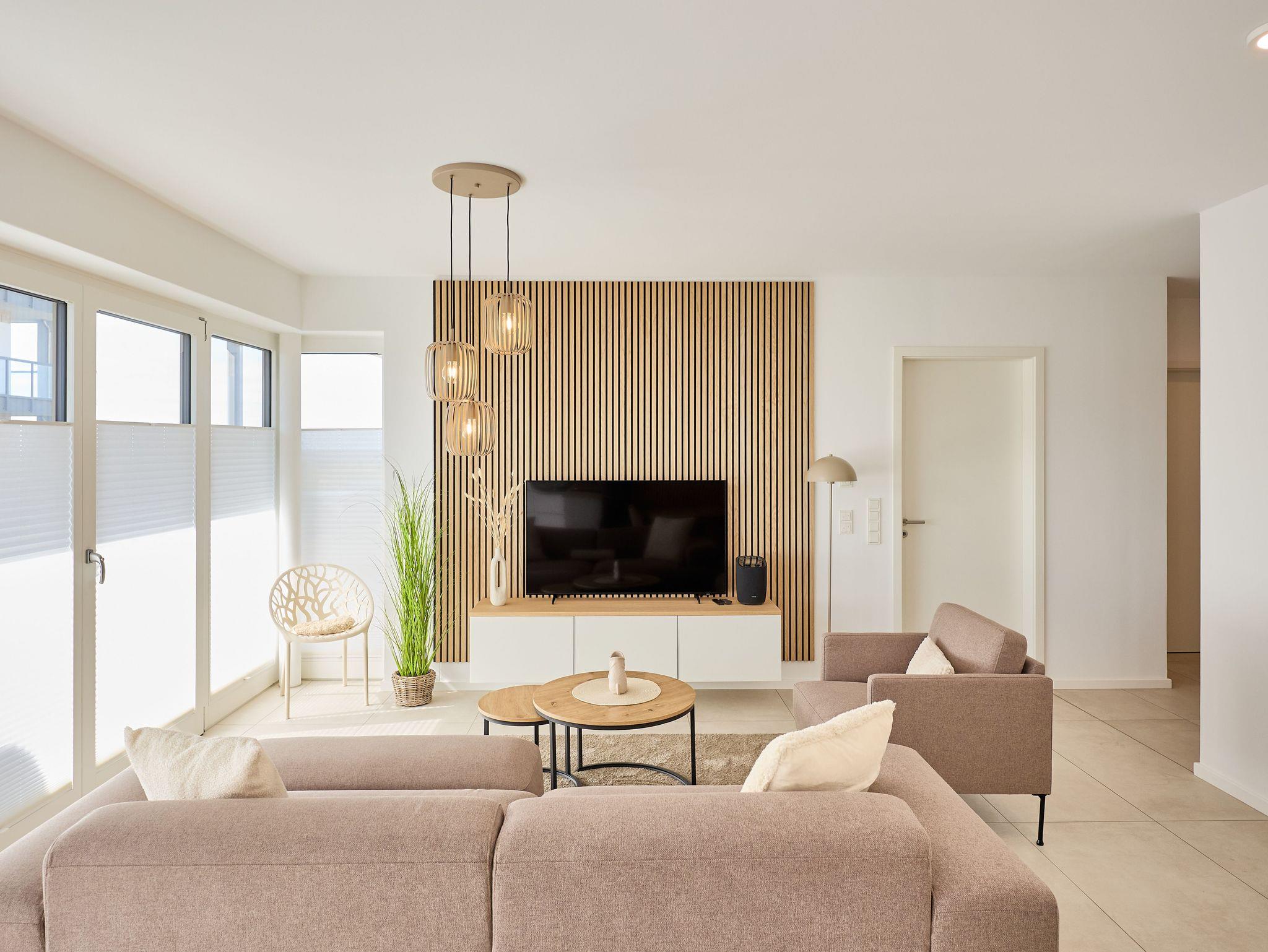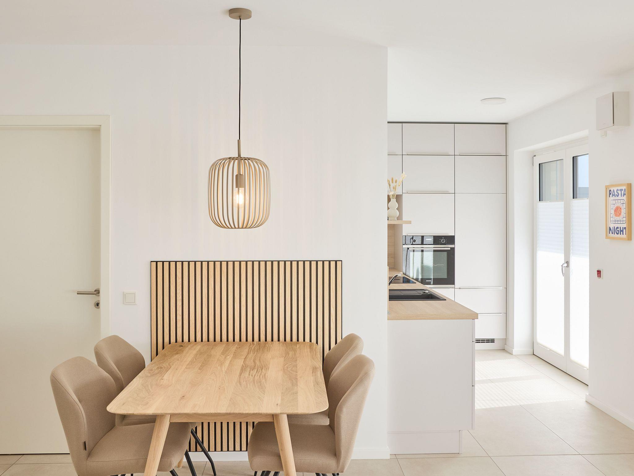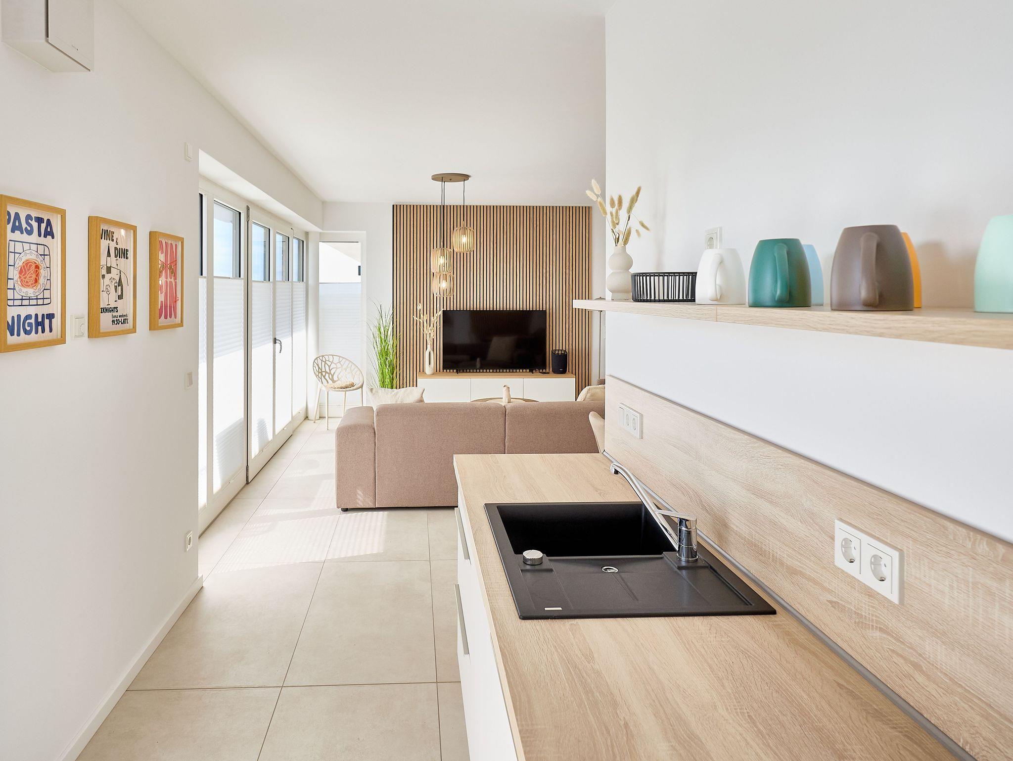Die Wohnung überzeugt mit einem offenen Wohnbereich, der Kochen, Essen und Entspannen perfekt miteinander verbindet. Eine voll ausgestattete Küche mit Ceranfeld, Backofen, Kühlschrank mit Gefrierfach sowie einer Pad- und Filterkaffeemaschine lässt keine Wünsche offen. Der stilvolle Esstisch bietet Platz für gemeinsame Mahlzeiten, während das gemütliche Sofa und ein großer 55?? Flachbild-TV entspannte Stunden garantieren.